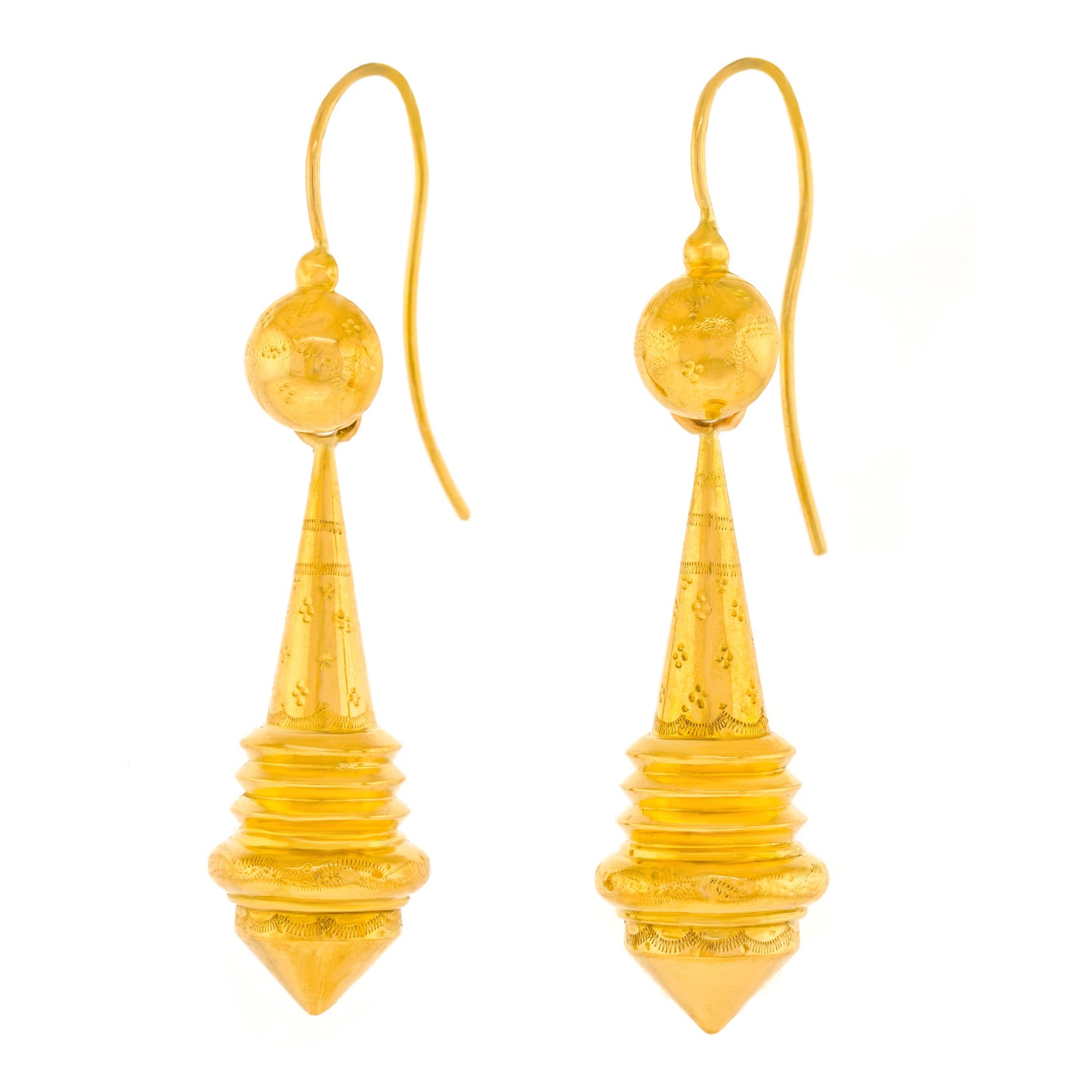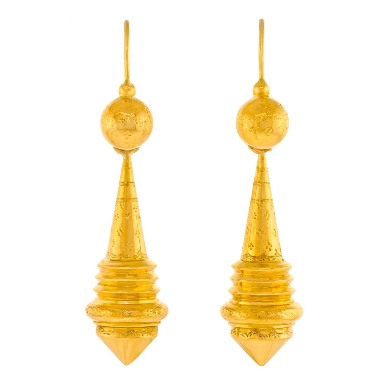 Circa 1920s, 18k, French Import marks. At almost 2 inches long, these 18k yellow gold earrings are spectacular fashion. The look is vintage chic at its Art Deco French best! They are effortlessly glamorous, as fashionable today as they were stylish 100 years ago. Beautifully made, they are in excellent condition.