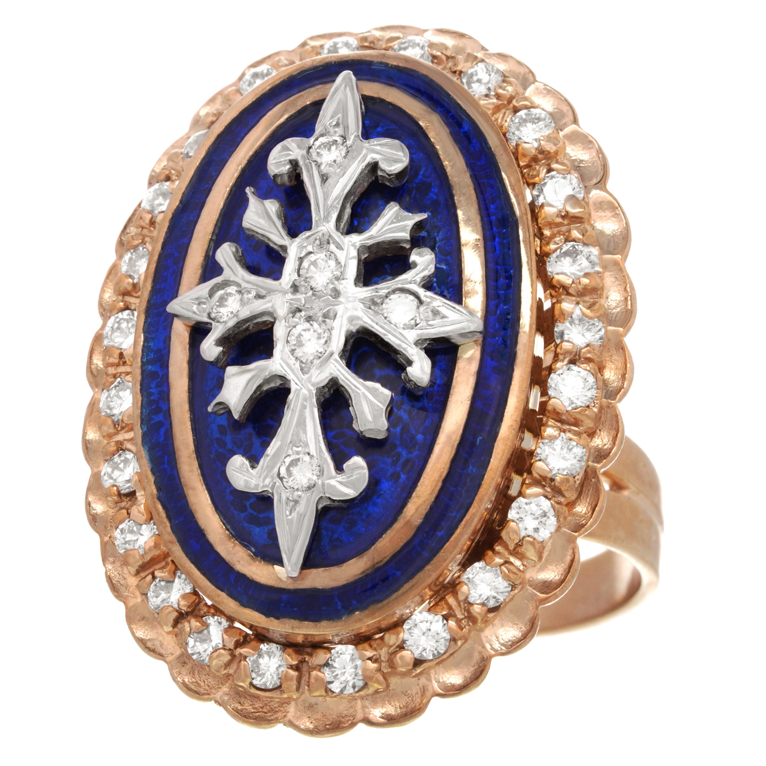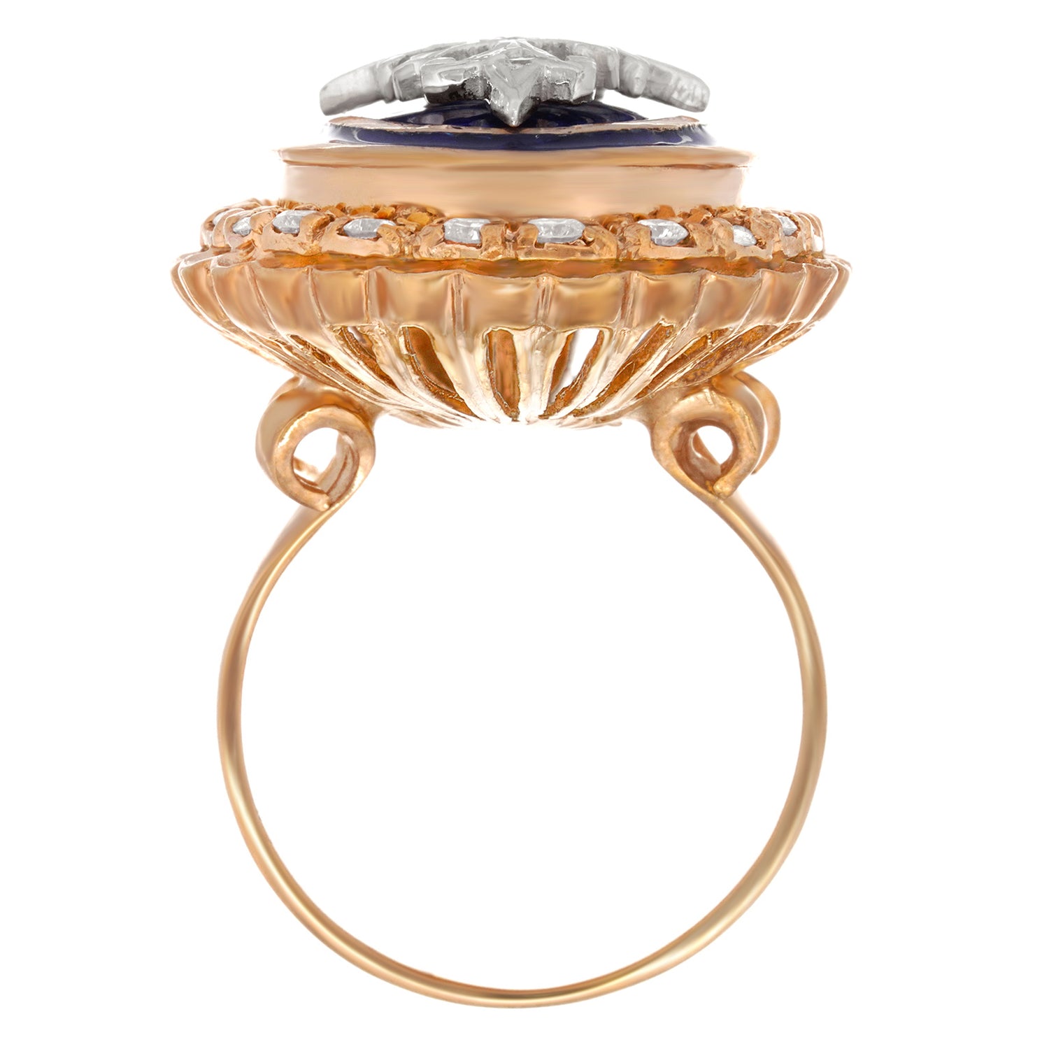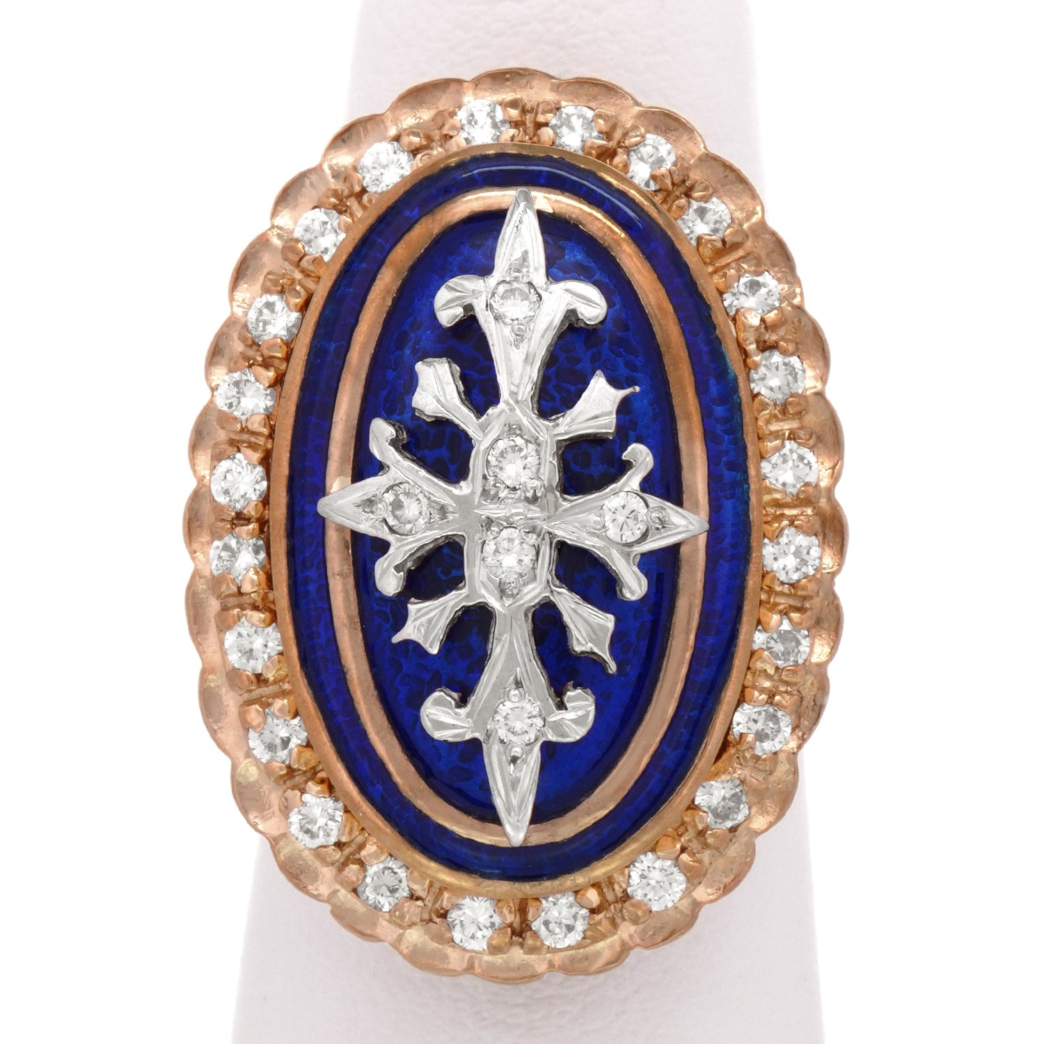 Circa 1920s, 14k, American. Suggestive of a Renaissance signet ring, this large Art Deco ring features royal blue enamel with an applied diamond-set sigil featuring 8 fleur-de-lis. The look is over-the-top, ornate, mystical! Excellent condition.
