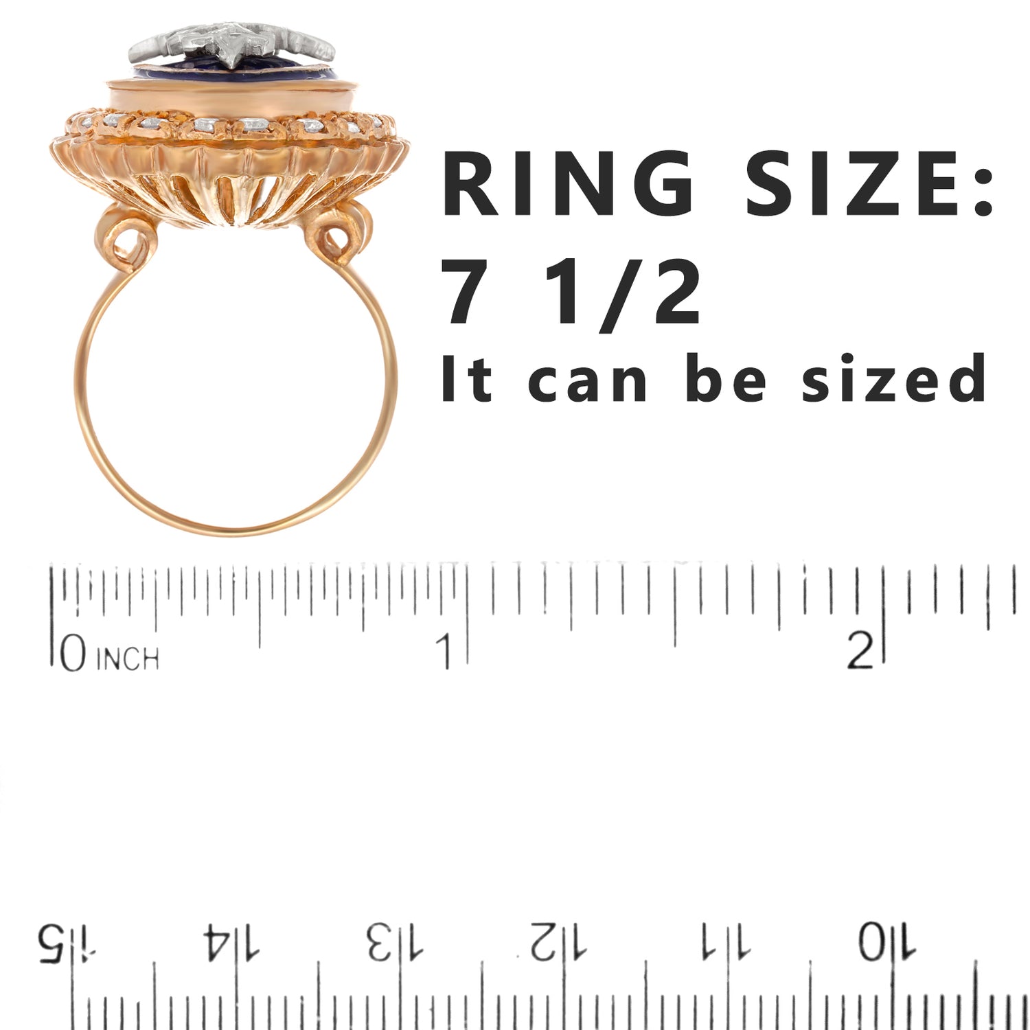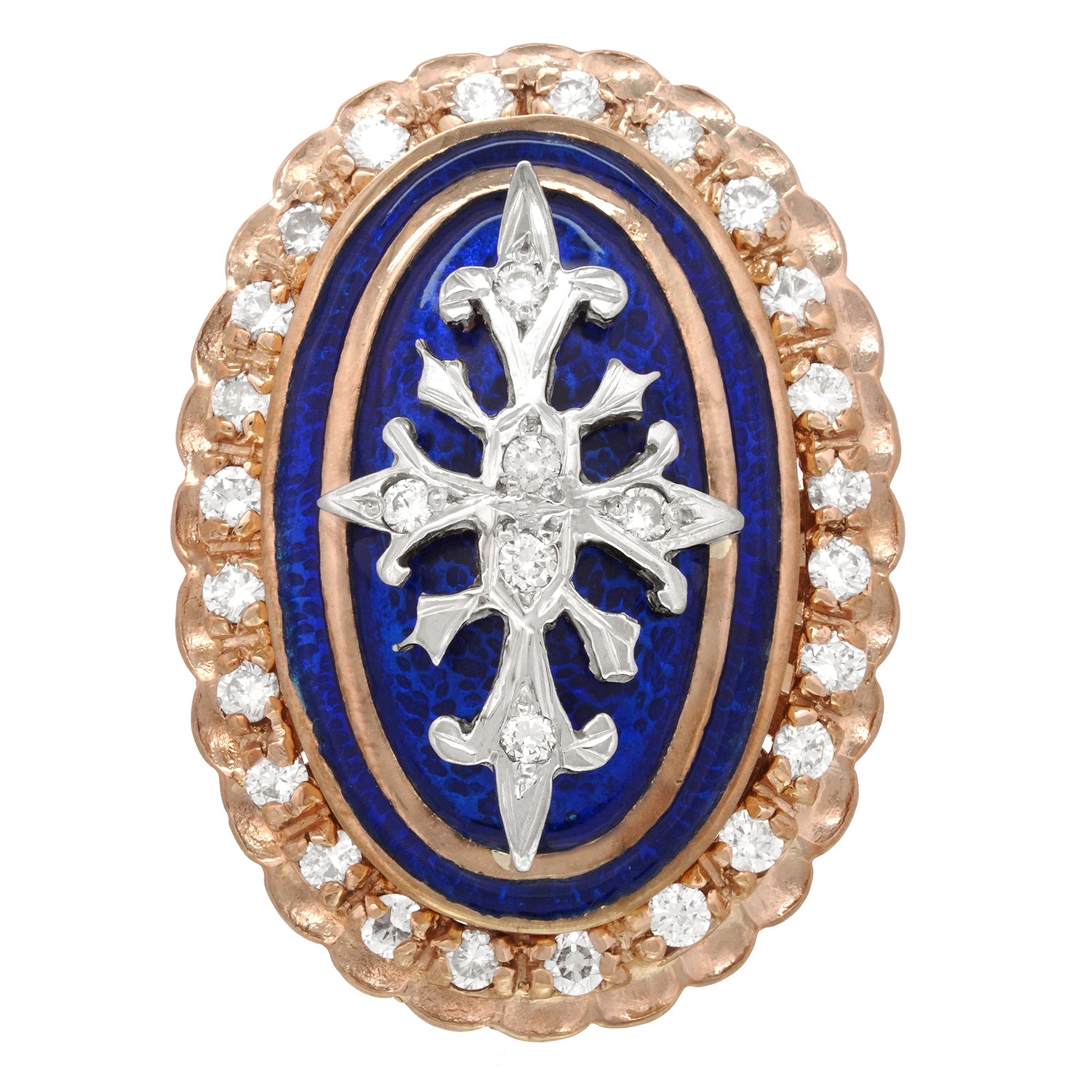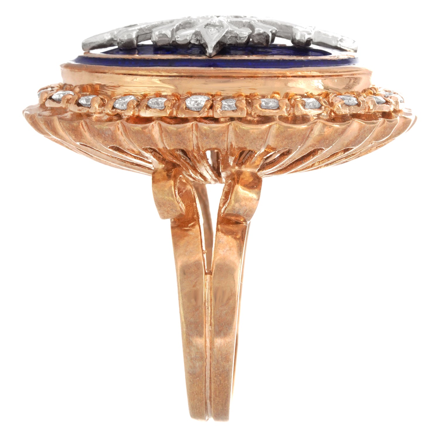 Circa 1920s, 14k, American. Suggestive of a Renaissance signet ring, this large Art Deco ring features royal blue enamel with an applied diamond-set sigil featuring 8 fleur-de-lis. The look is over-the-top, ornate, mystical! Excellent condition.