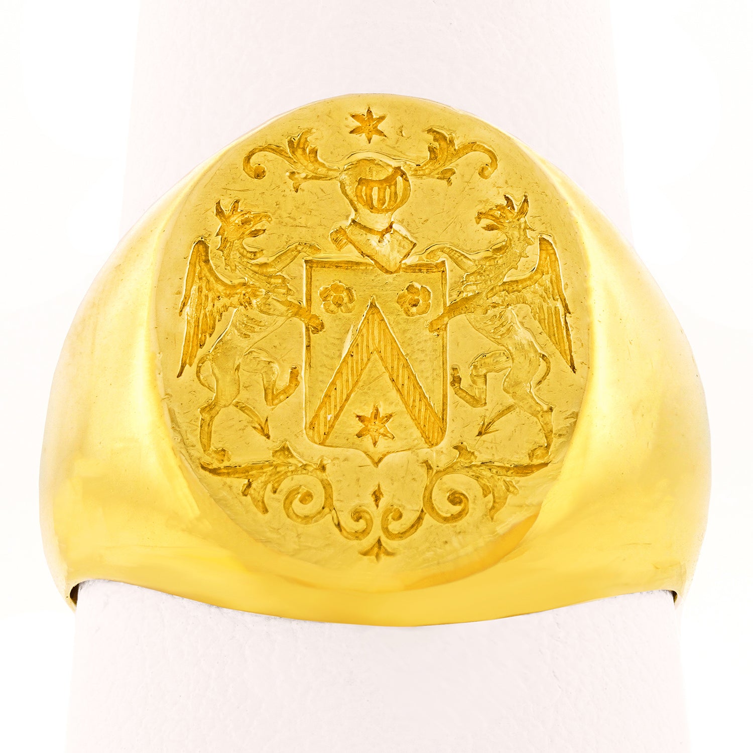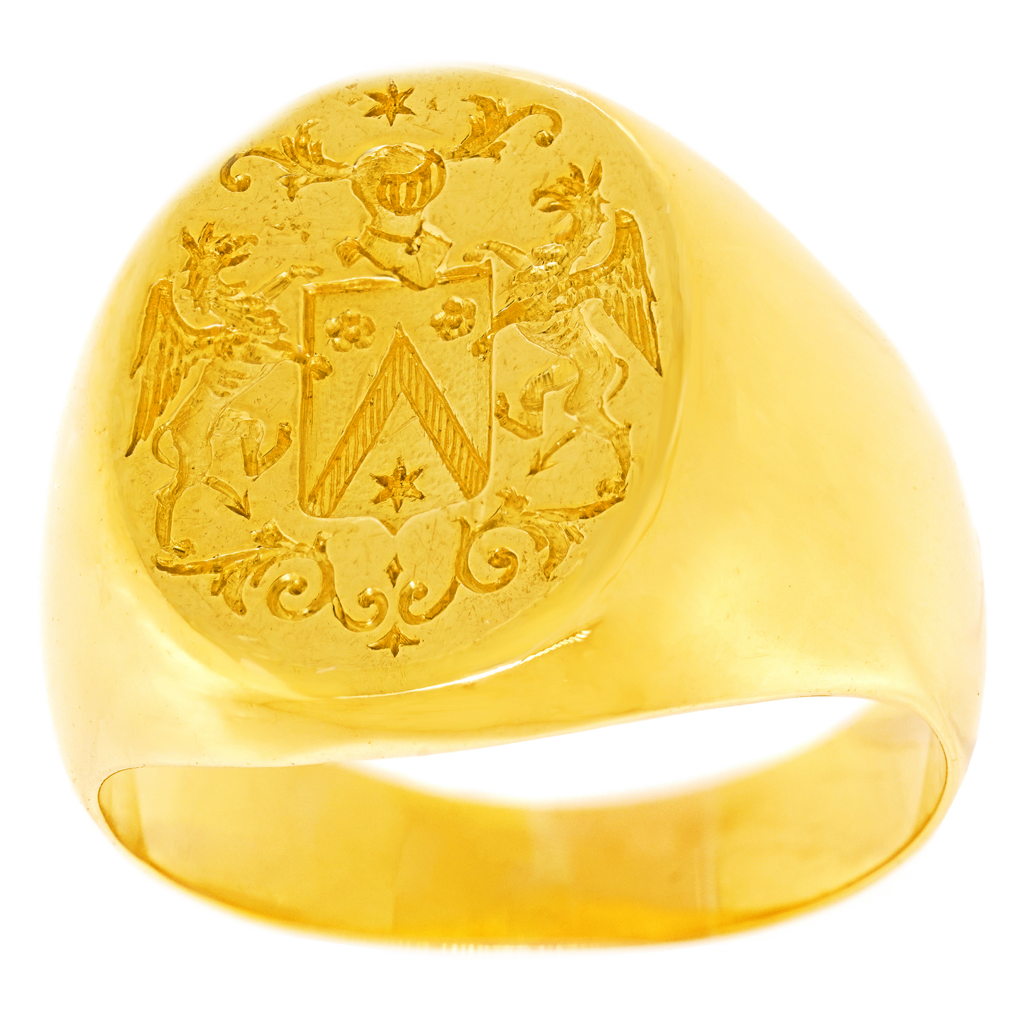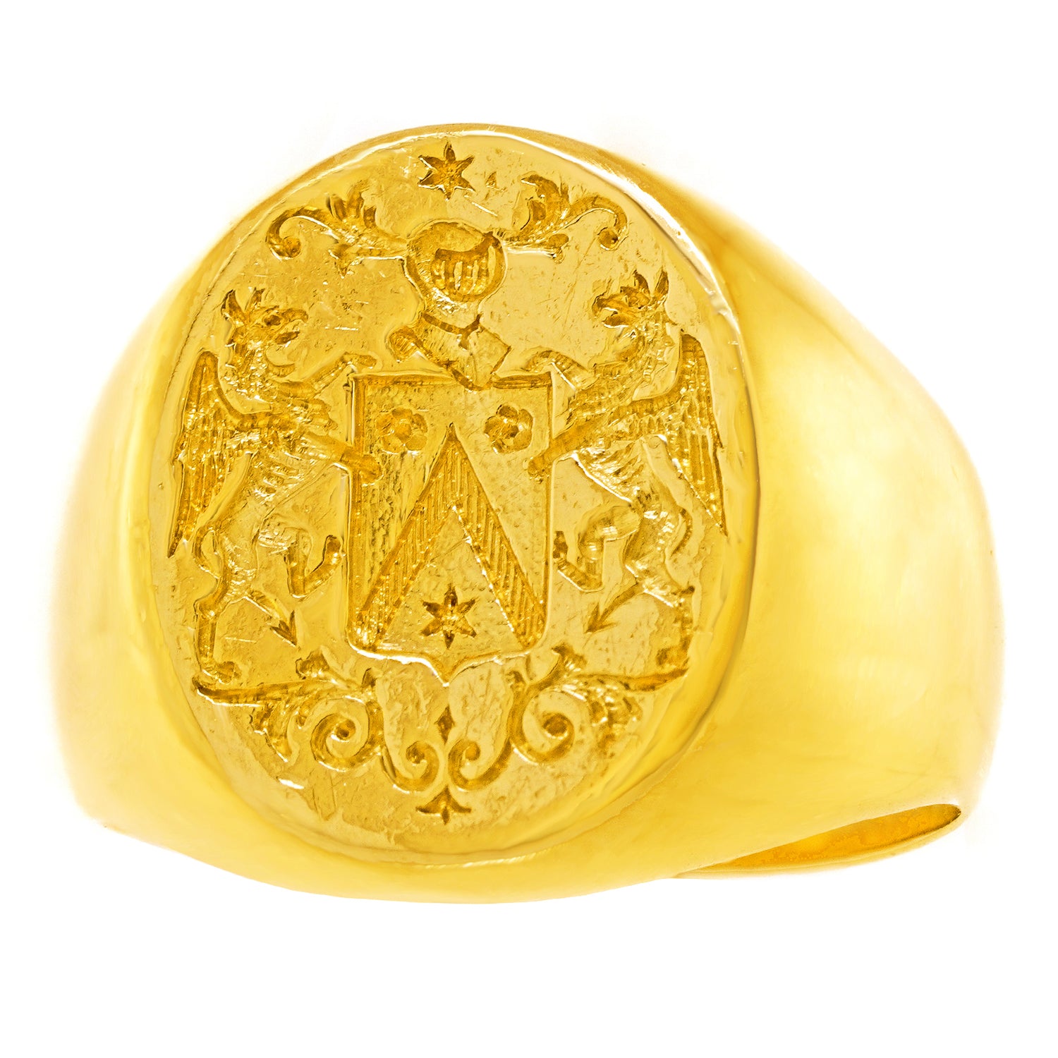 Circa 1920s, 18k, French. Decorated with a fabulous armorial, this French Art Deco signet ring has a charming town and country look. Classic lines, heavy gold, and a balanced scale make this a perfect everyday signet ring. Beautifully made, it is in excellent condition.