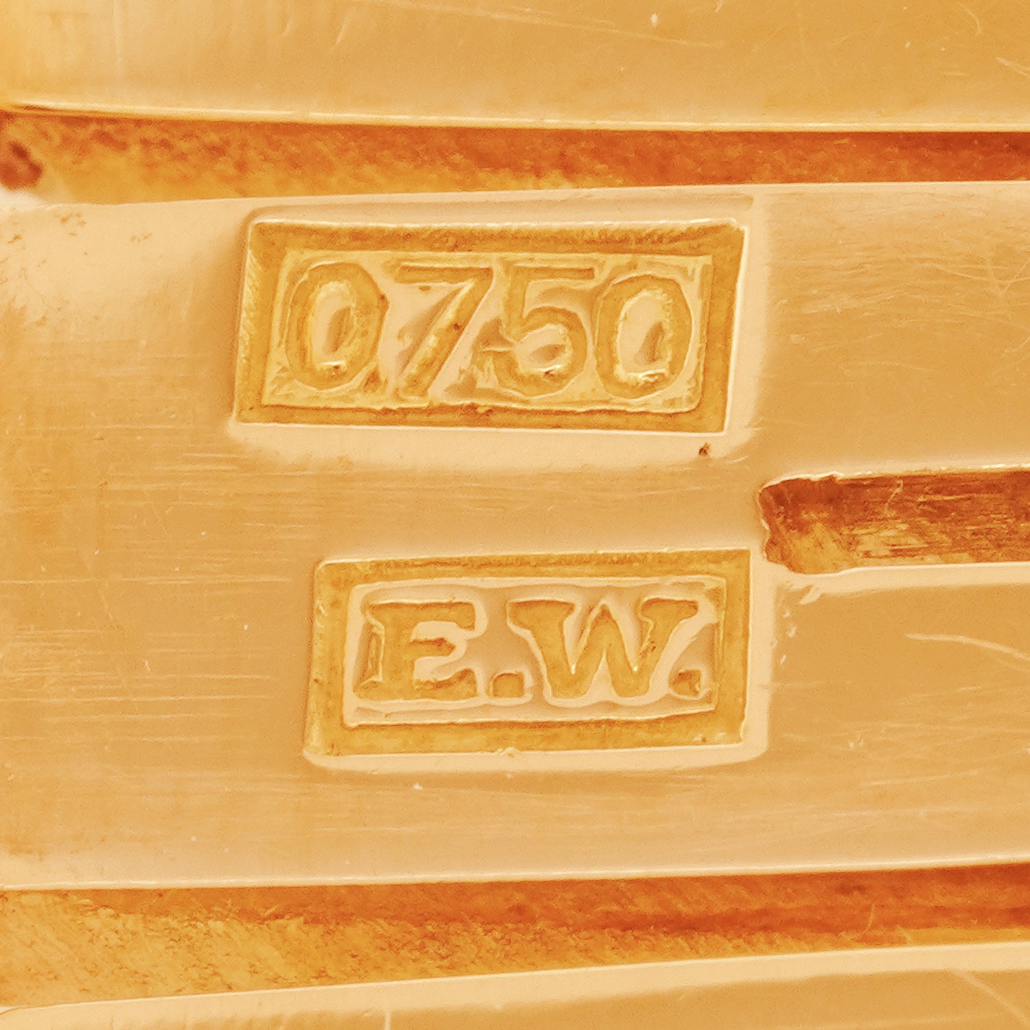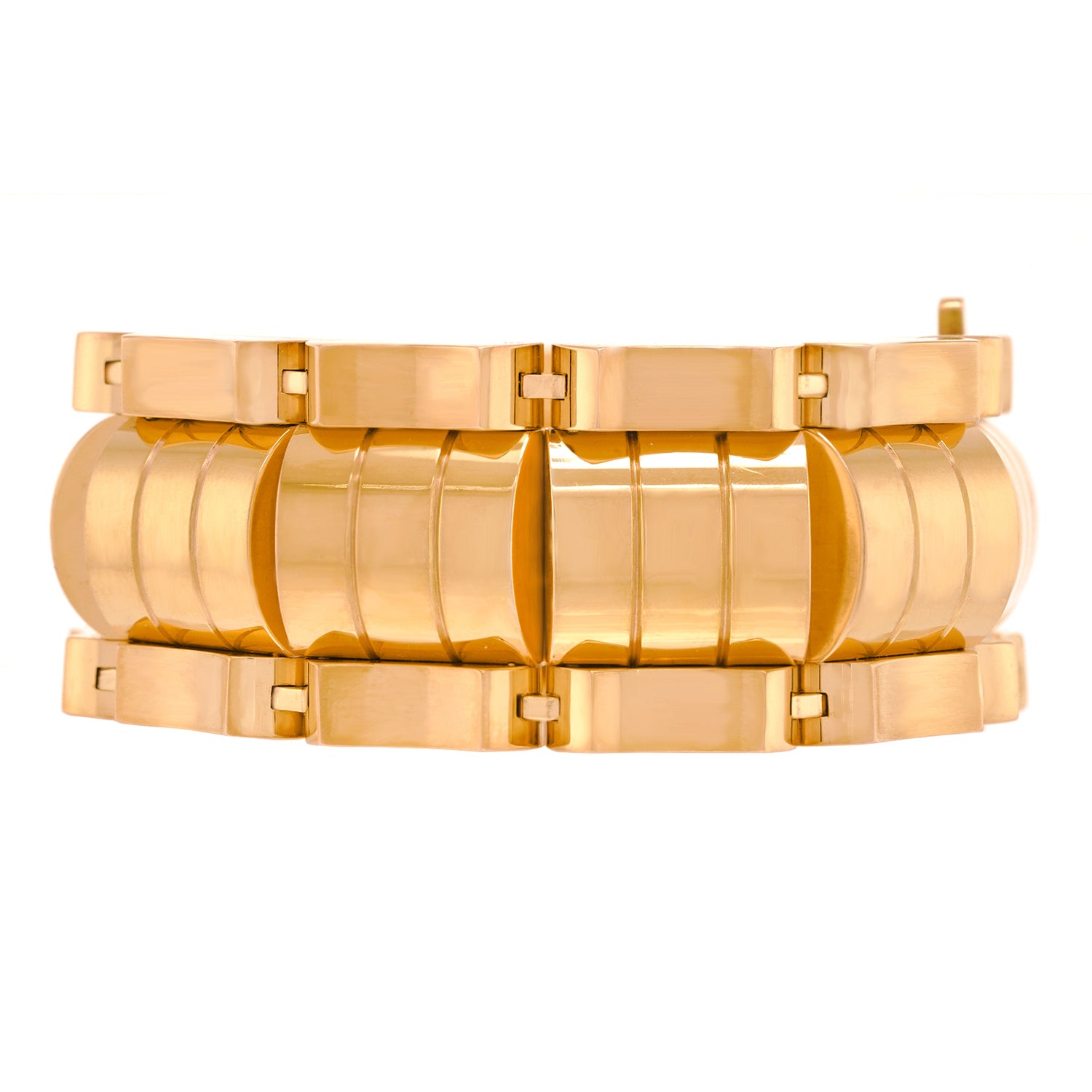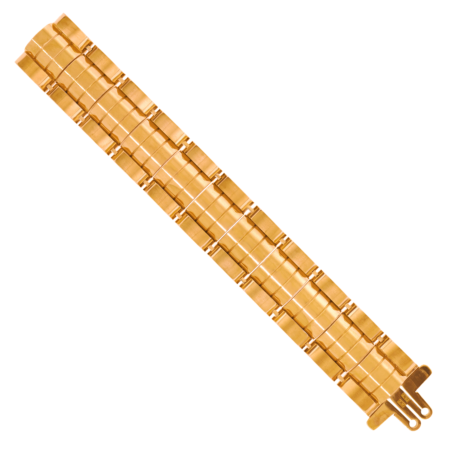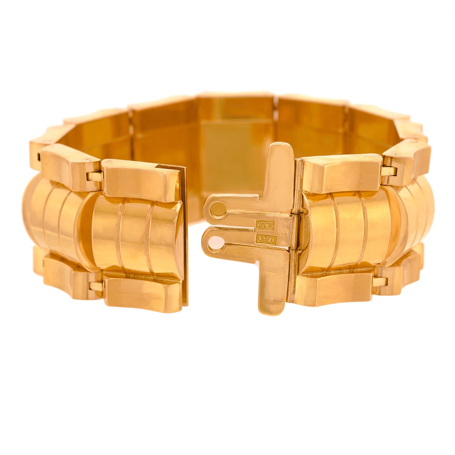 Circa 1930s, 18k, Switzerland. Art Deco design and chunky dimensionality come together in this stylish yellow-gold bracelet. Underscored by a bold constructivist motif for powerful visual tension, the look is fearlessly fresh. Heavy and well-made in 18k gold, it is in excellent condition.