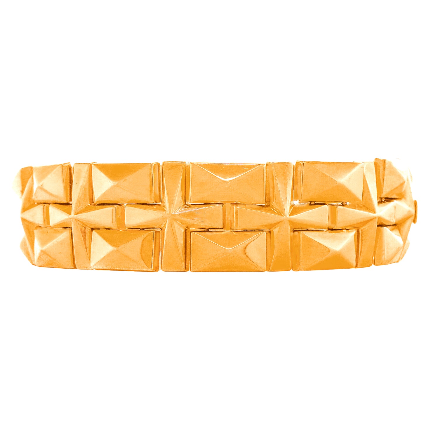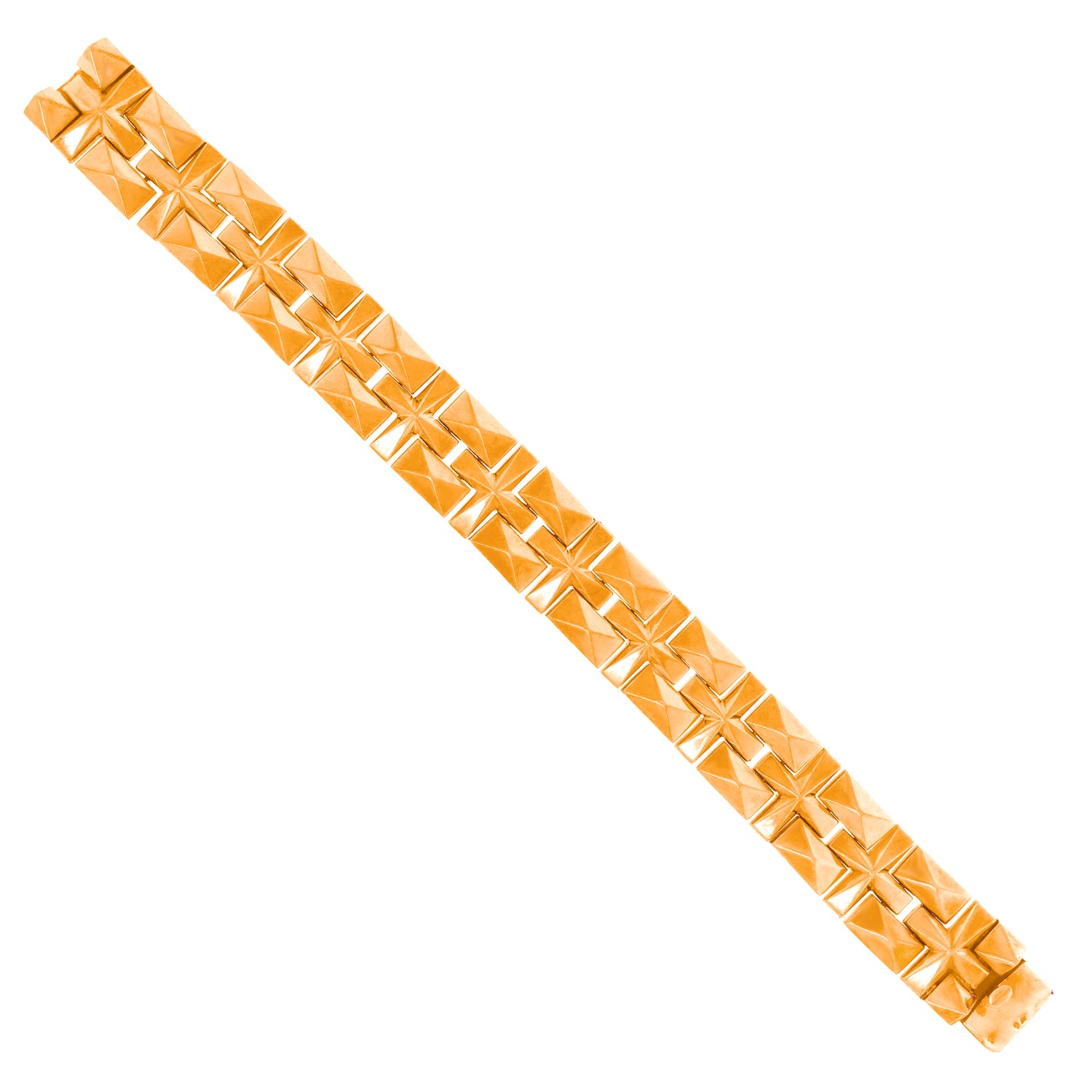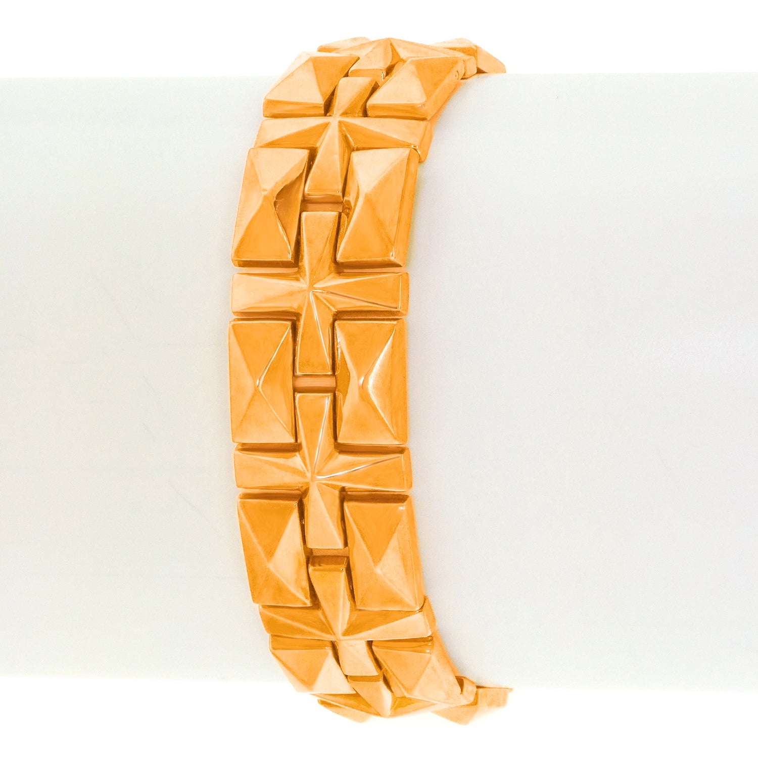 Circa 1920s, 18k, Paris, France. A particularly fine example of French Art Deco jewelry, this 1920s bracelet's chic geometry is underscored by the delicious visual of soft rose gold. The look is fearlessly fresh. Excellent condition.