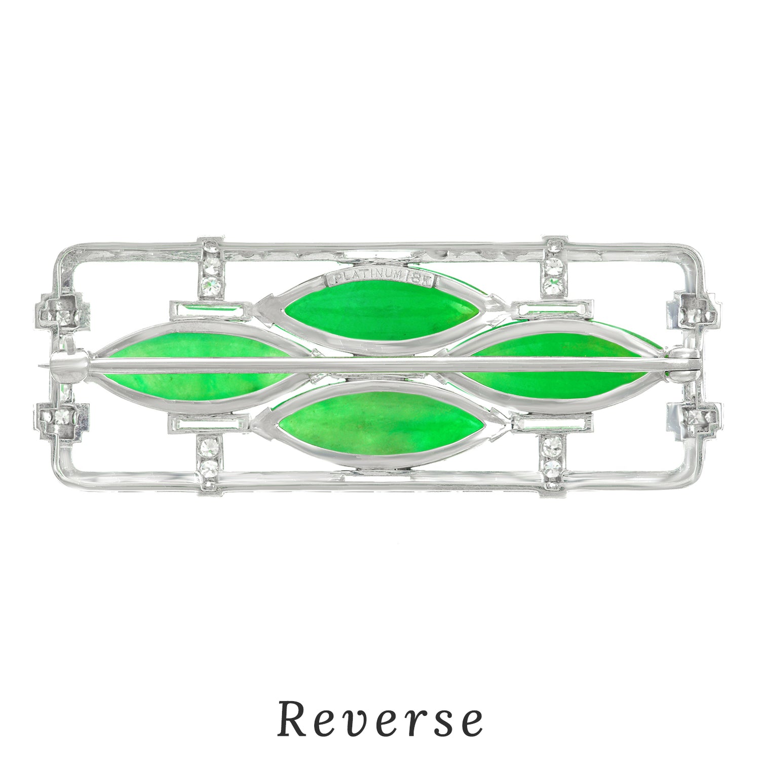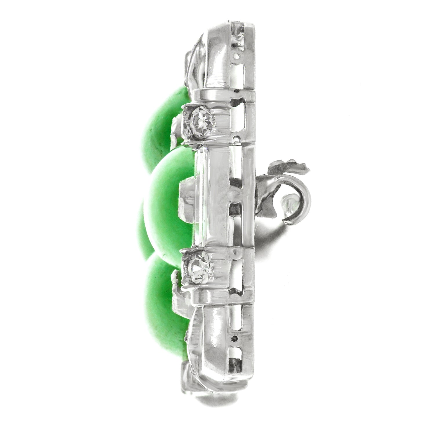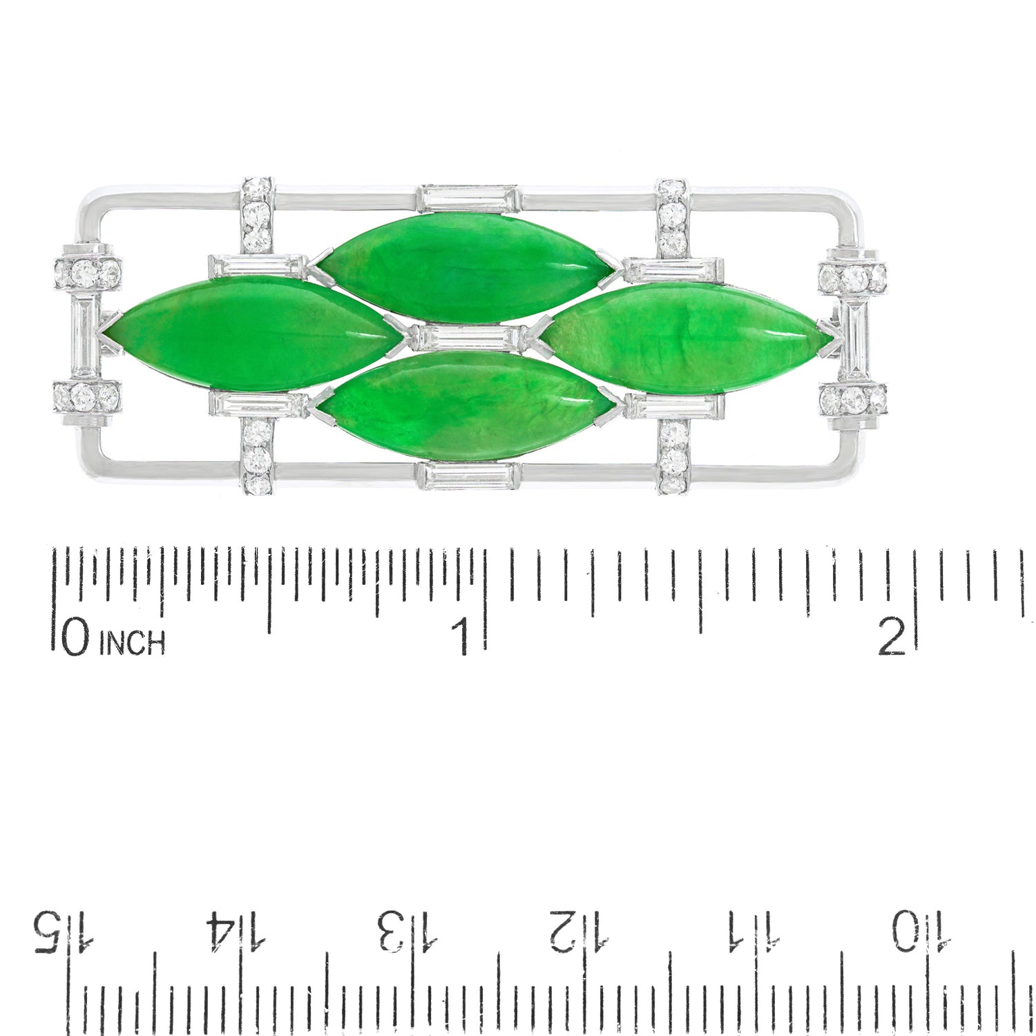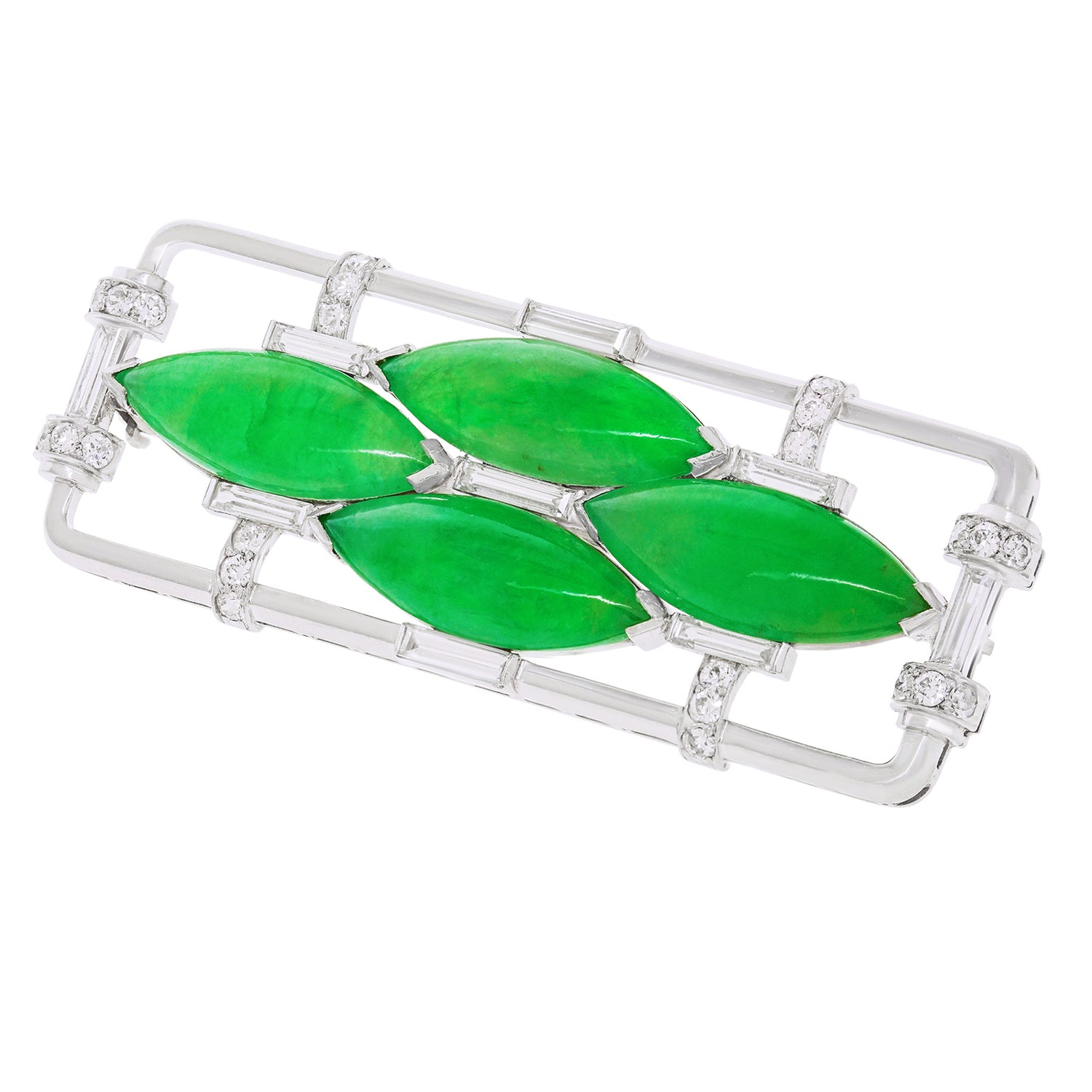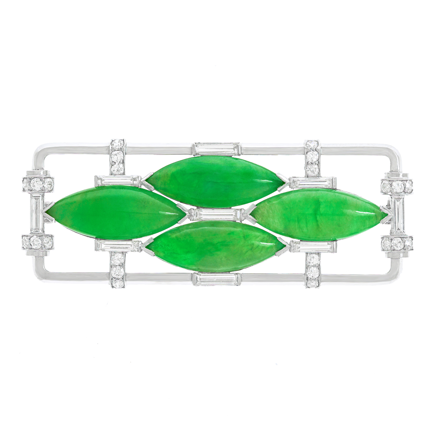 Circa 1920s, platinum/18k, American.   This brooch features four lush jade cabochons on a handmade platinum frame. The stark geometry of the frame with its round and elongated emerald cut diamonds (G color VS clarity) is visually juxtaposed by the marquis forms of the jade. The look is modernism, as fresh for fashion today as it was a century ago. Excellent condition.