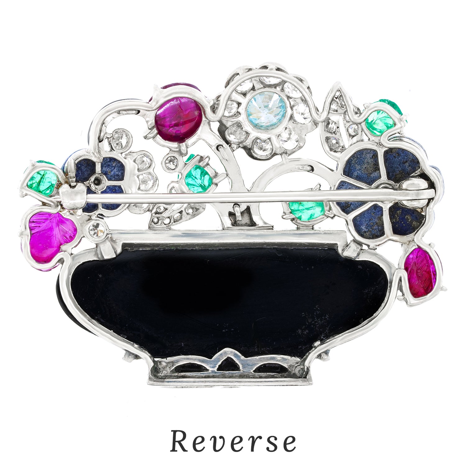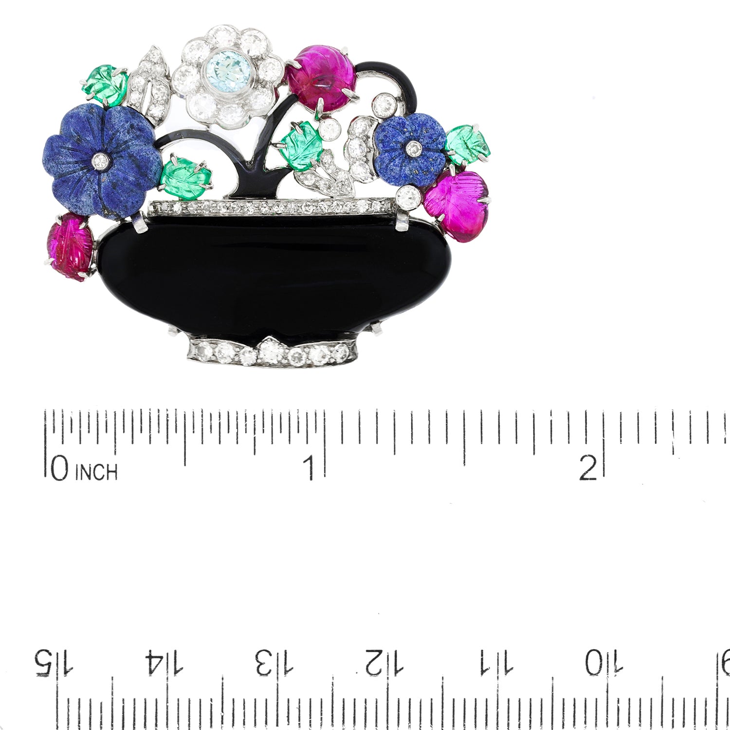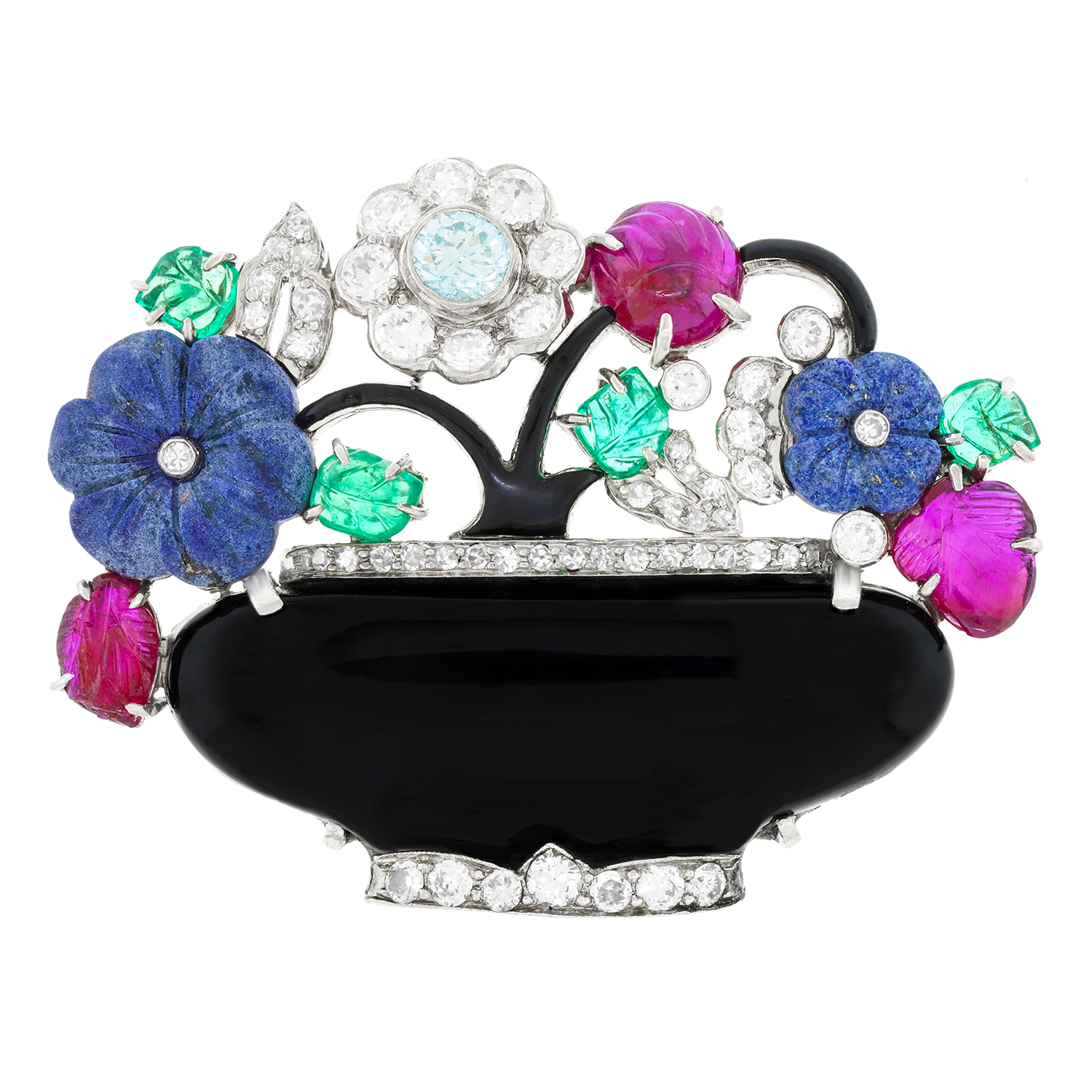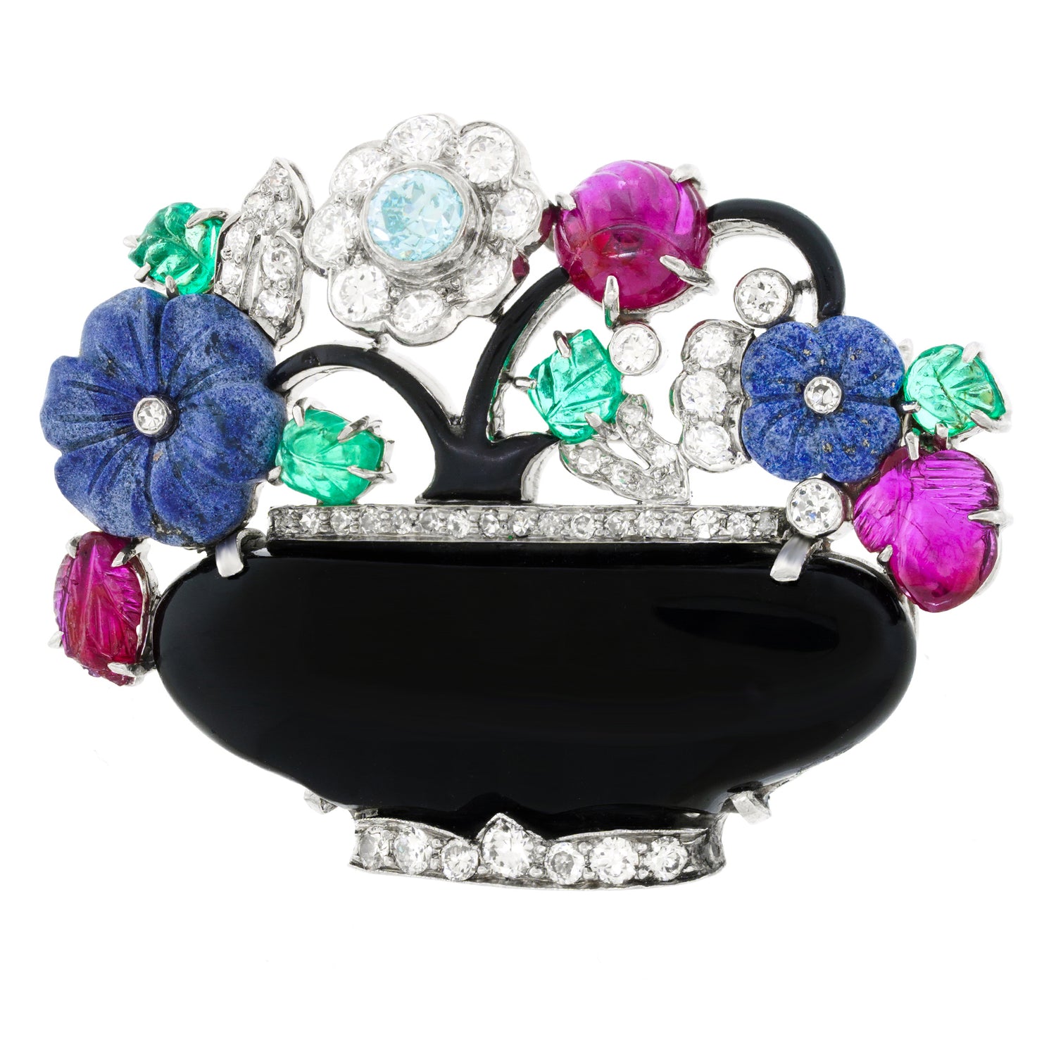 Circa 1920s, platinum, American. This spectacular Art Deco Jardinière De Fleur brooch is playful and sophisticated. Platinum construction, quality colored stones, and a visually arresting layout make this pin a standout. It is set with a .35 carat blue diamond, 1.25 carats total weight of H color, SI1 clarity diamonds, with ruby, emerald, and lapis.    Excellent condition.