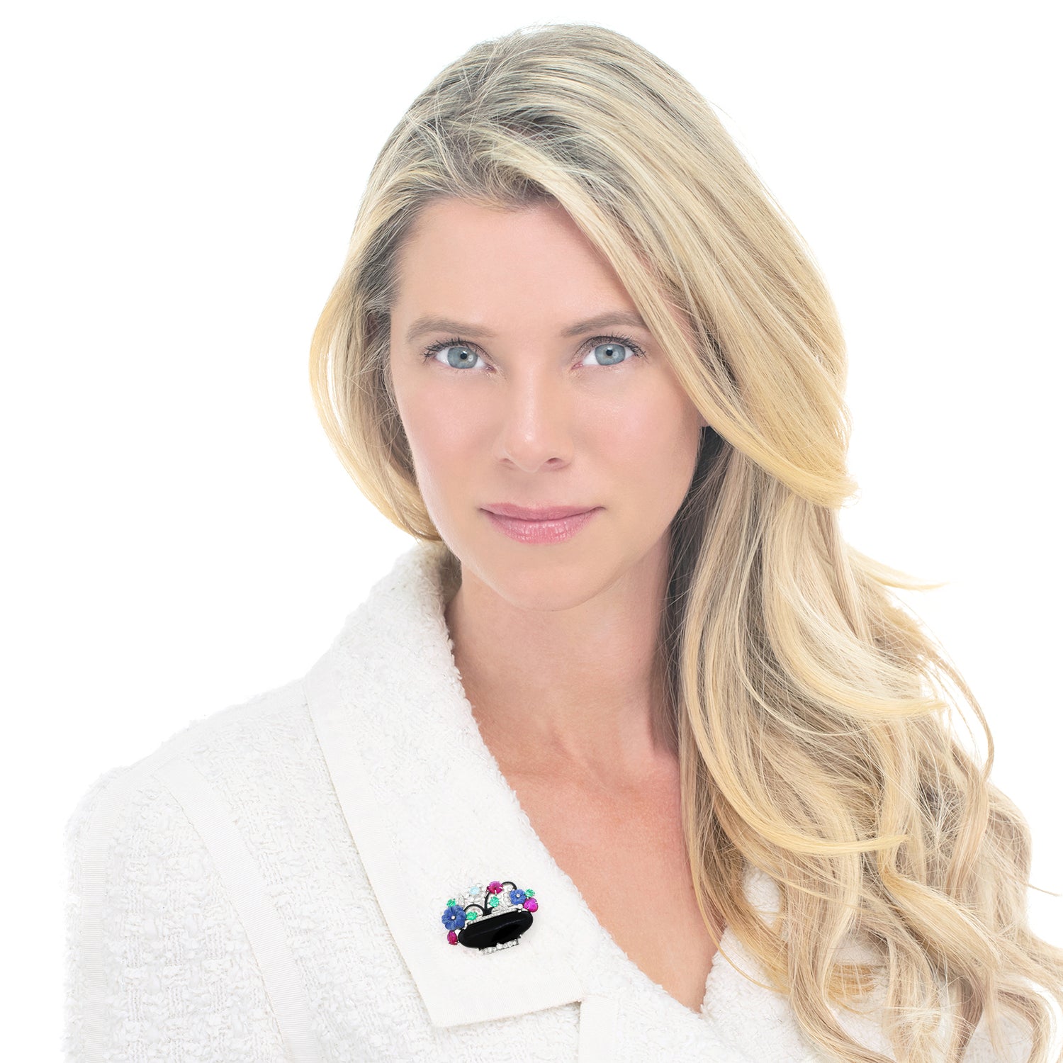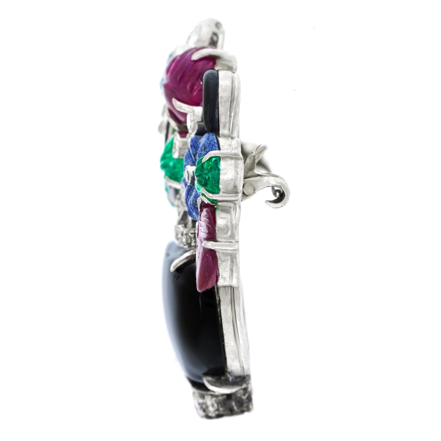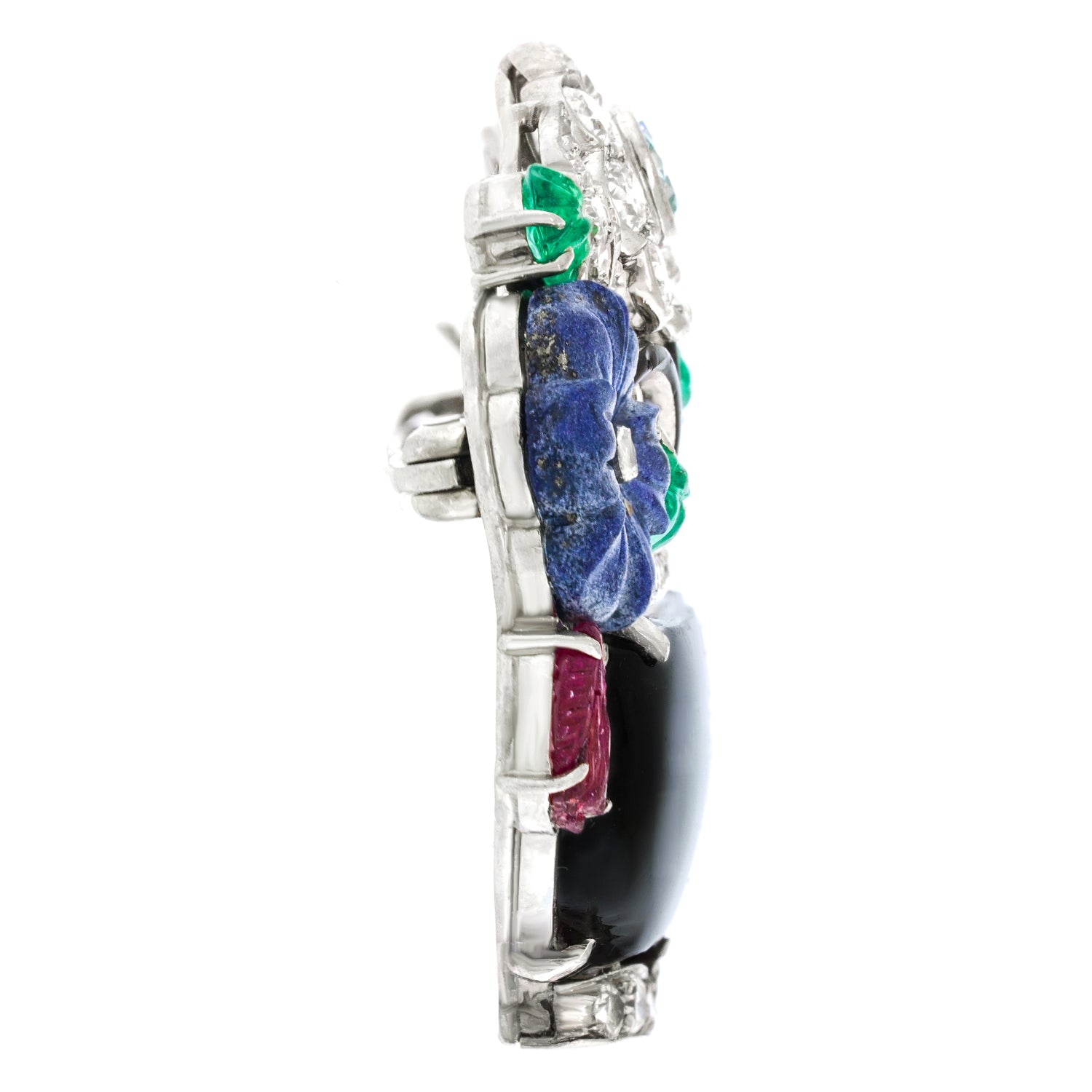 Stones: .35 carat blue diamonds, 1.25 carats total weight of white diamonds H color, SI1 clarity, ruby, emerald, lapis, onyx and enamel