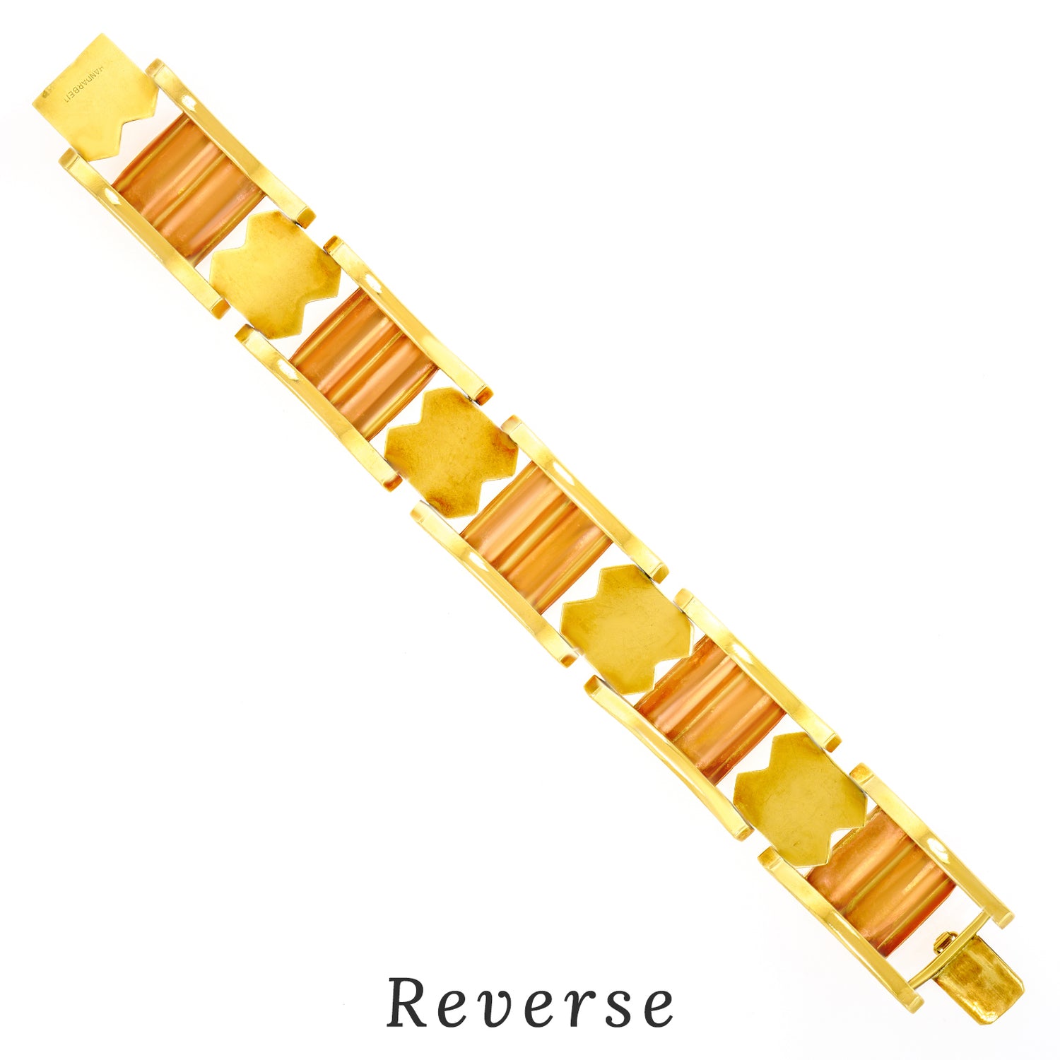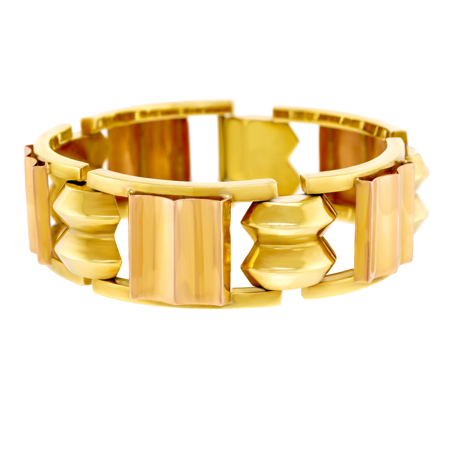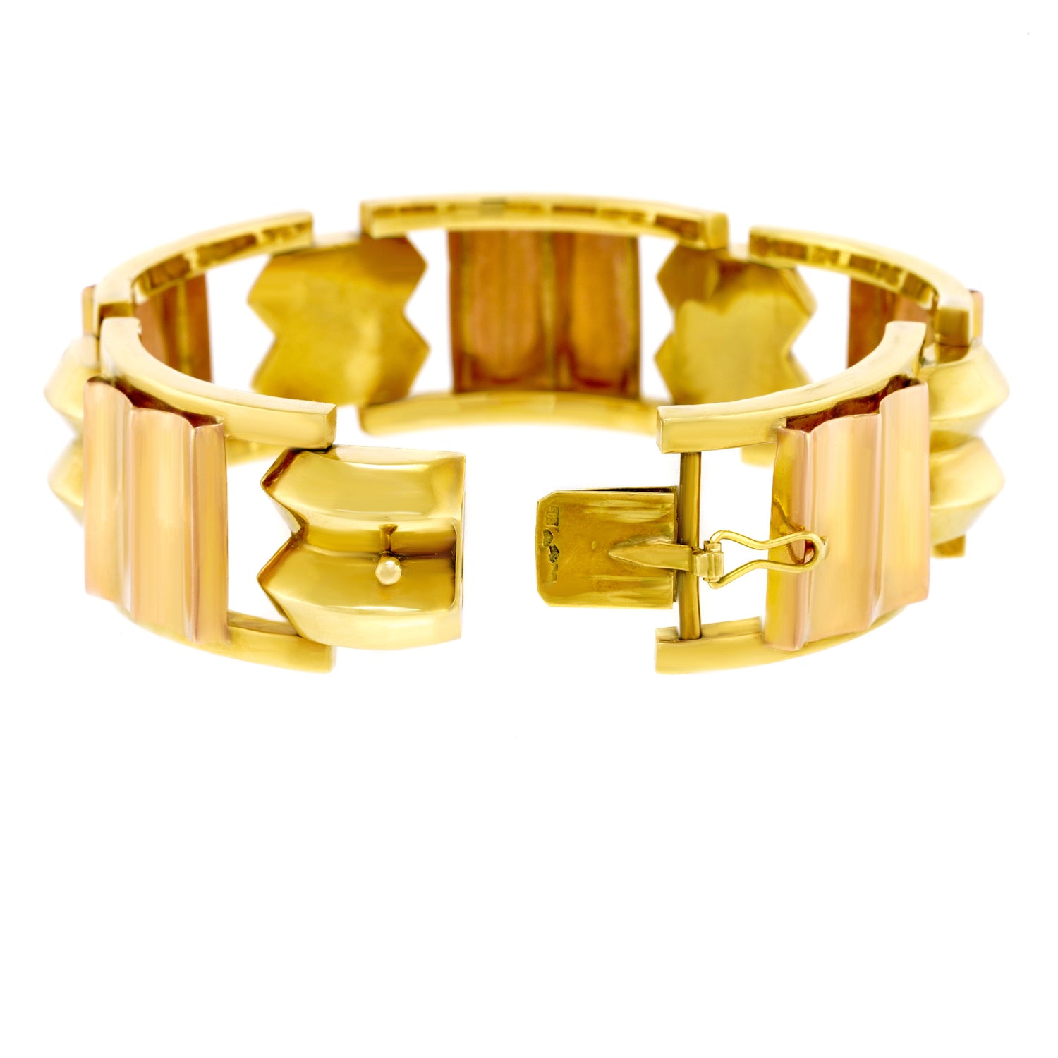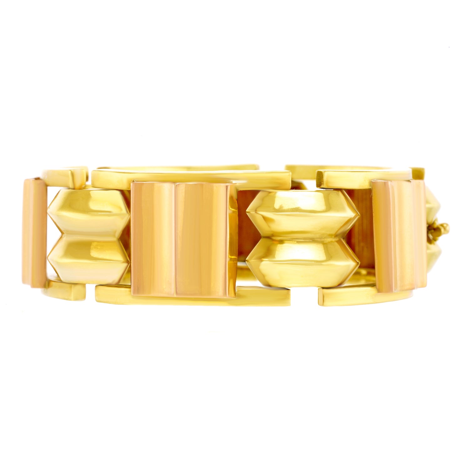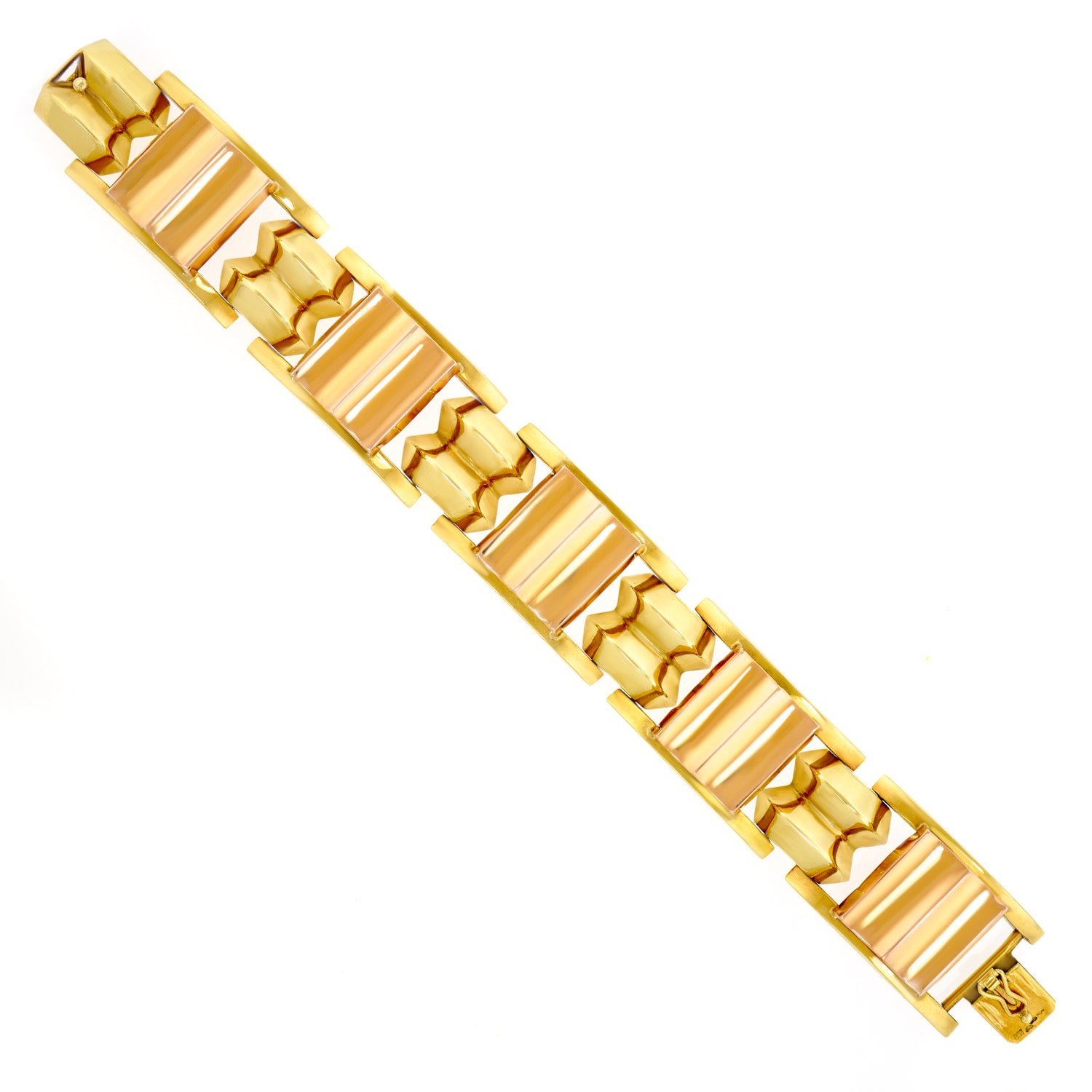 Circa 14k, c1920s, Austria.   This quintessential Art Deco bracelet has all the visual drama of the twenties and the panache of the Vienna lifestyle. With its crisp geometry and two-tone gold, it is a remarkable piece of period Art Deco jewelry. Beautifully handmade and comfortable to wear, it is in excellent condition.