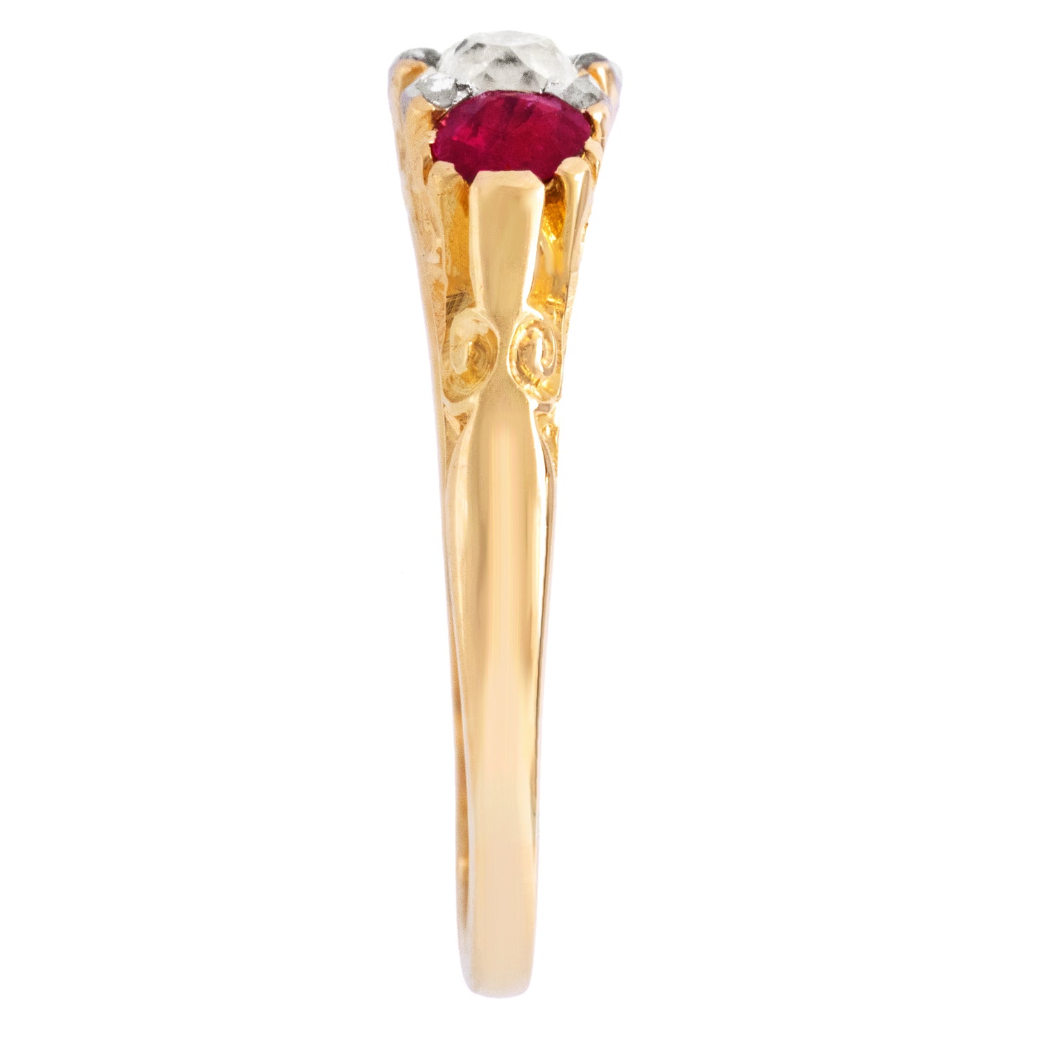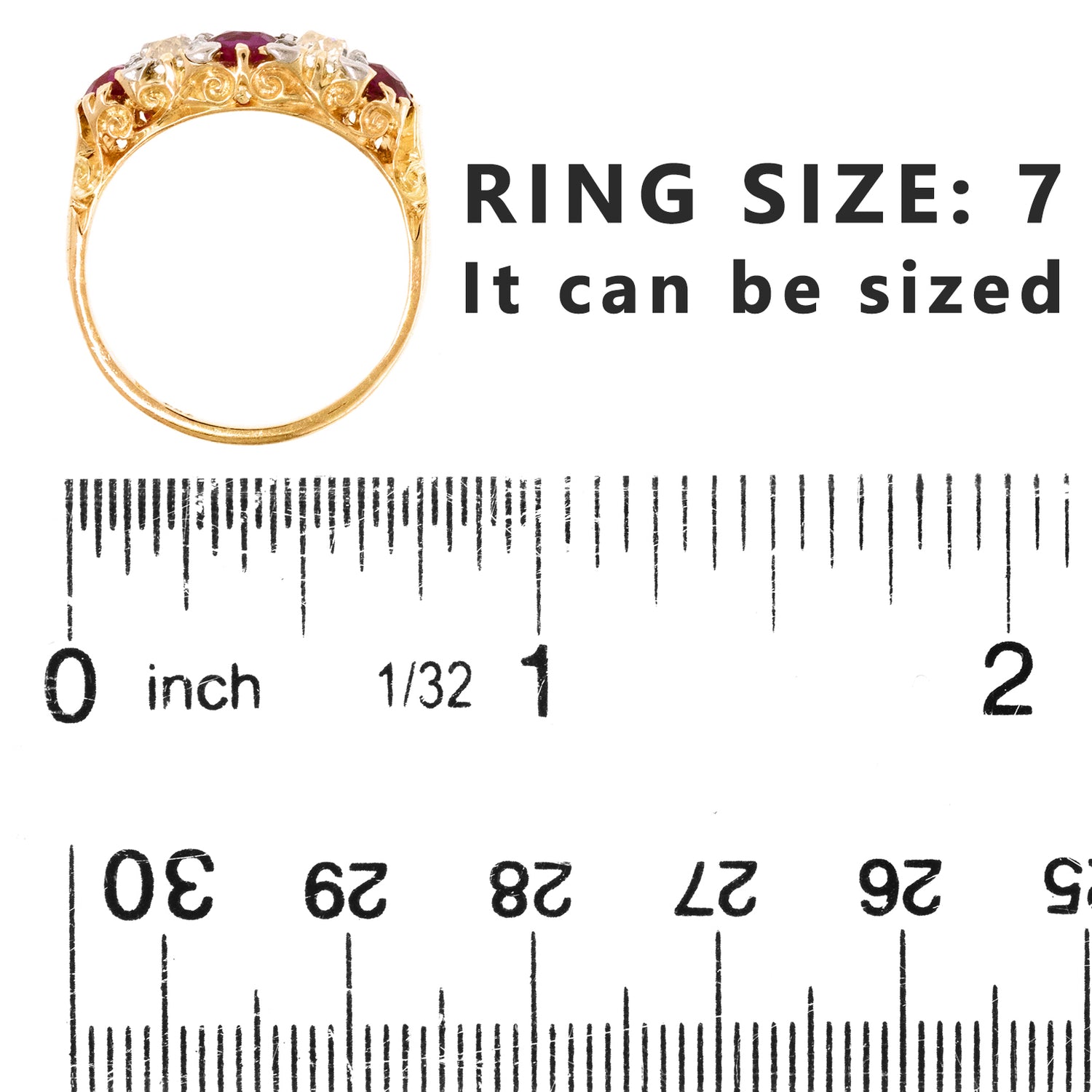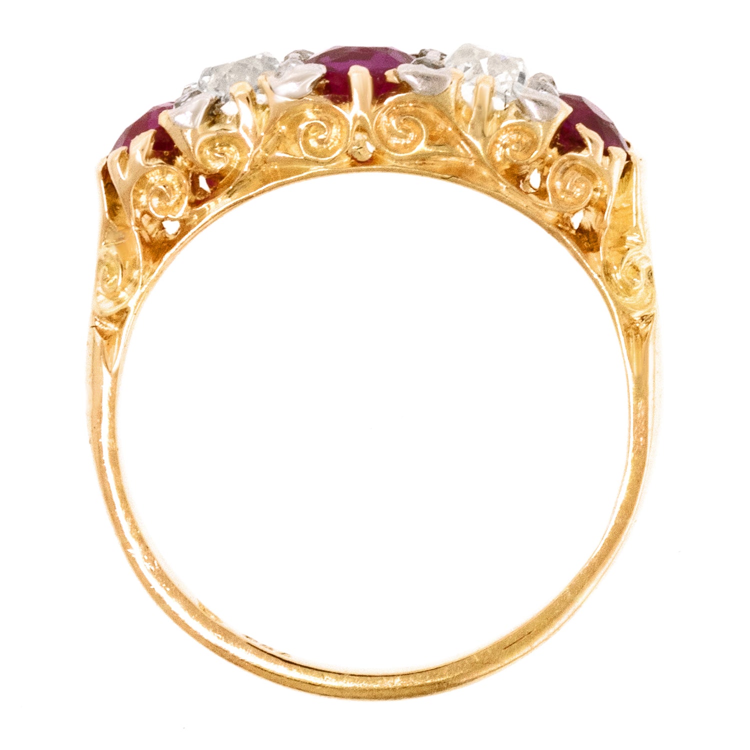 Circa 1920s, 18k Swiss. This antique-chic ring features 1.0 carats of lively red rubies and .50 carats of old-cut diamonds. The look is romantically feminine with lovely details. Traditionally hand-crafted with the diamonds set in white gold and the colored gemstones set in yellow gold, this period jewel is well-made and in excellent condition.
