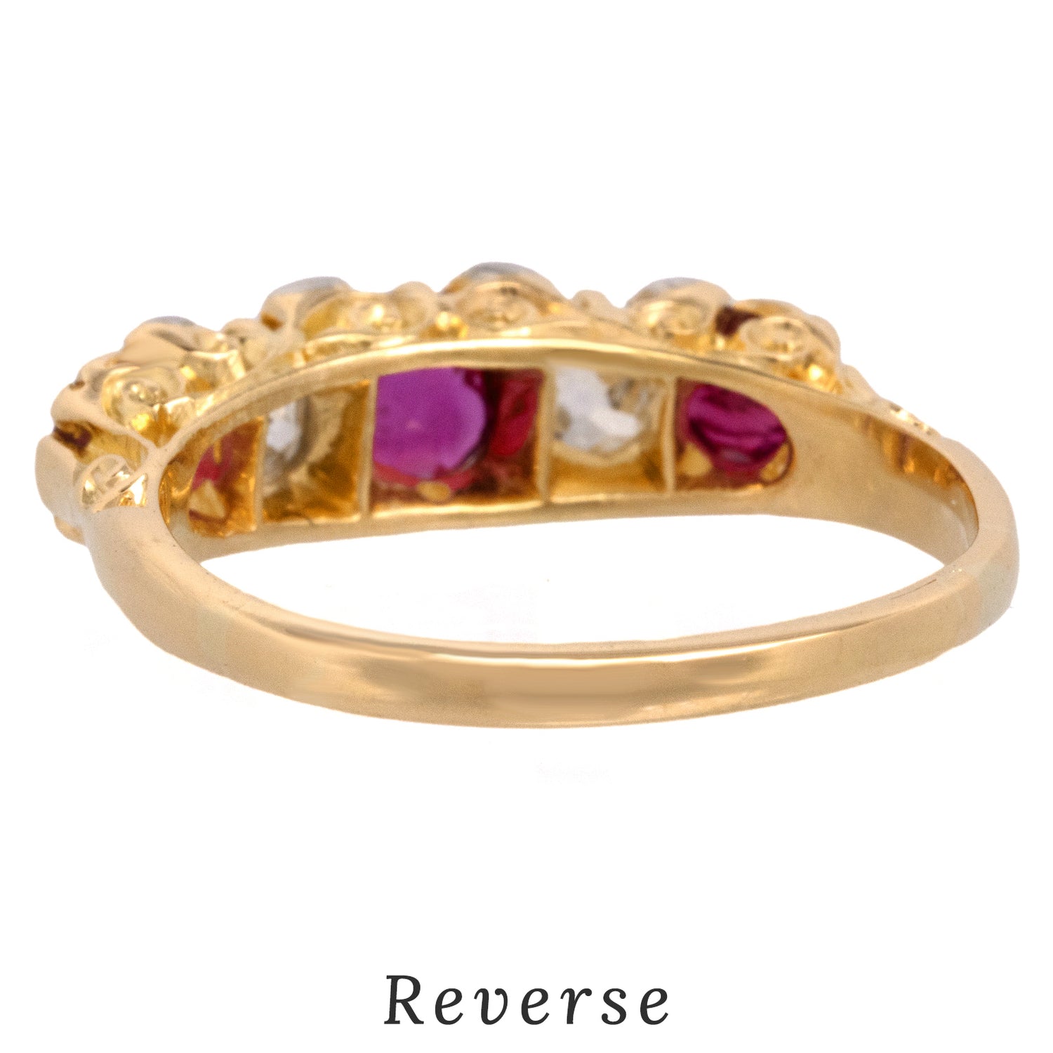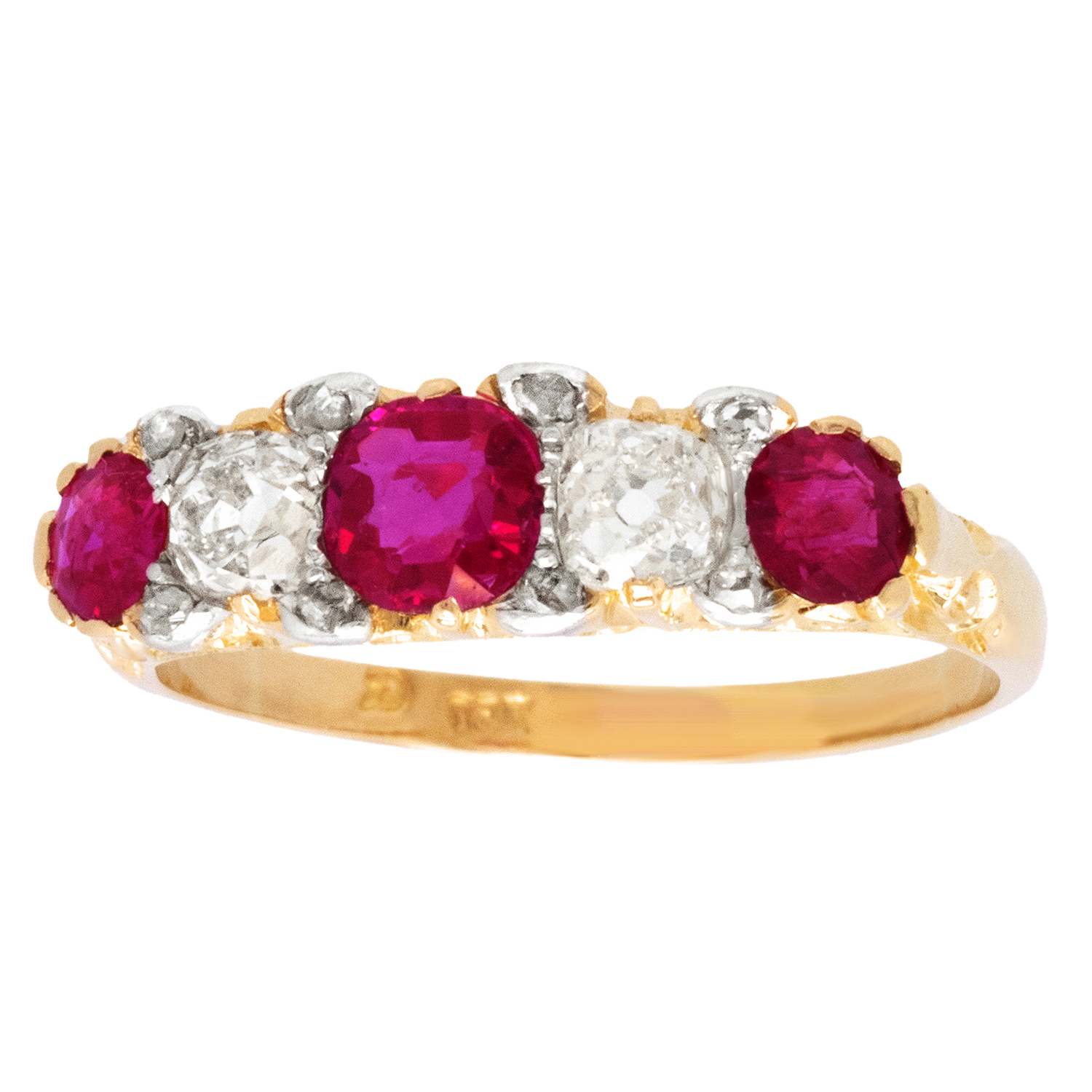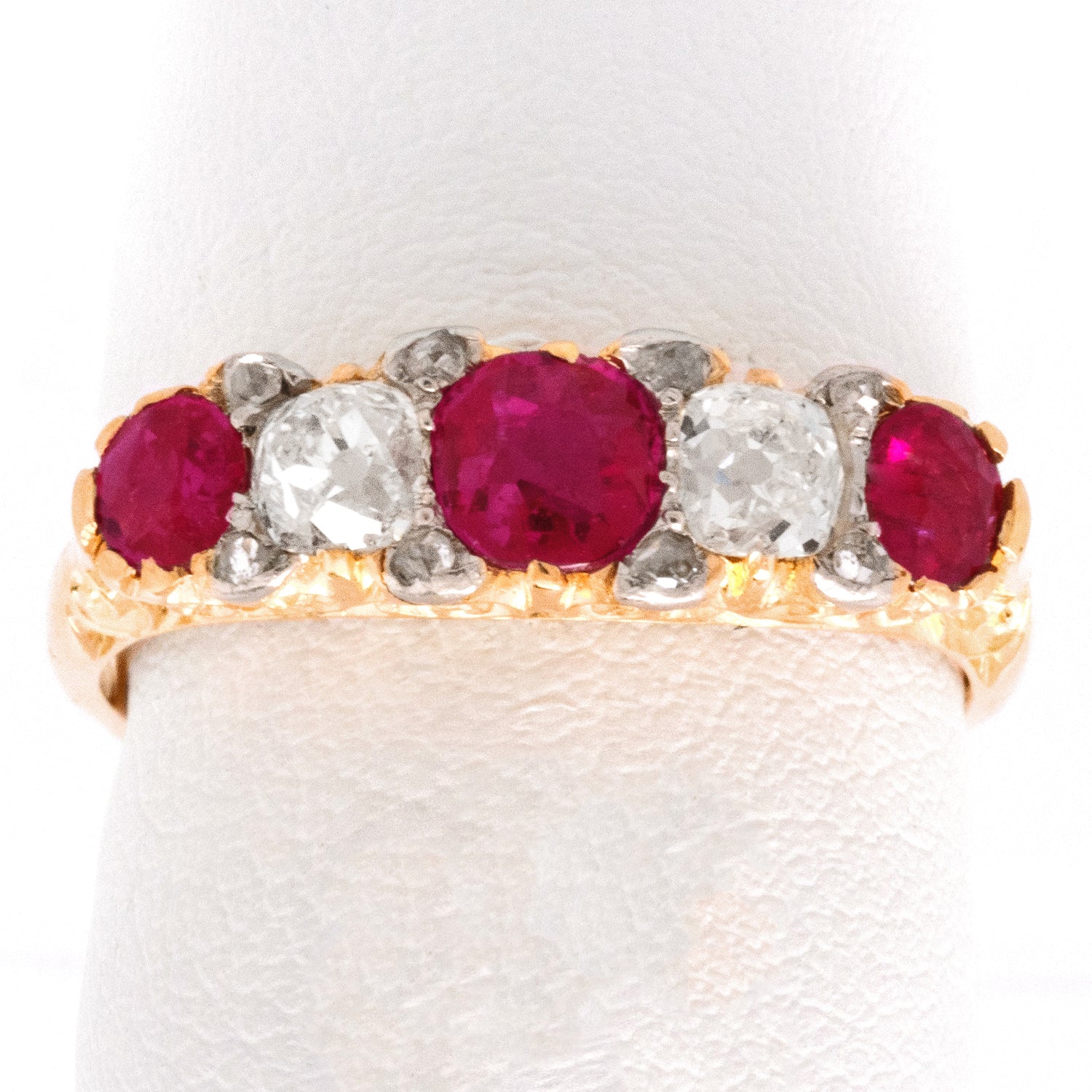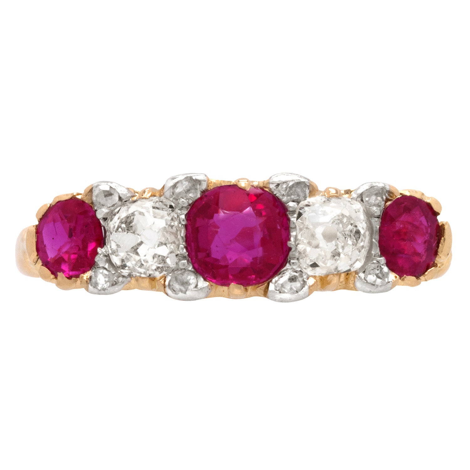 Circa 1920s, 18k Swiss. This antique-chic ring features 1.0 carats of lively red rubies and .50 carats of old-cut diamonds. The look is romantically feminine with lovely details. Traditionally hand-crafted with the diamonds set in white gold and the colored gemstones set in yellow gold, this period jewel is well-made and in excellent condition.