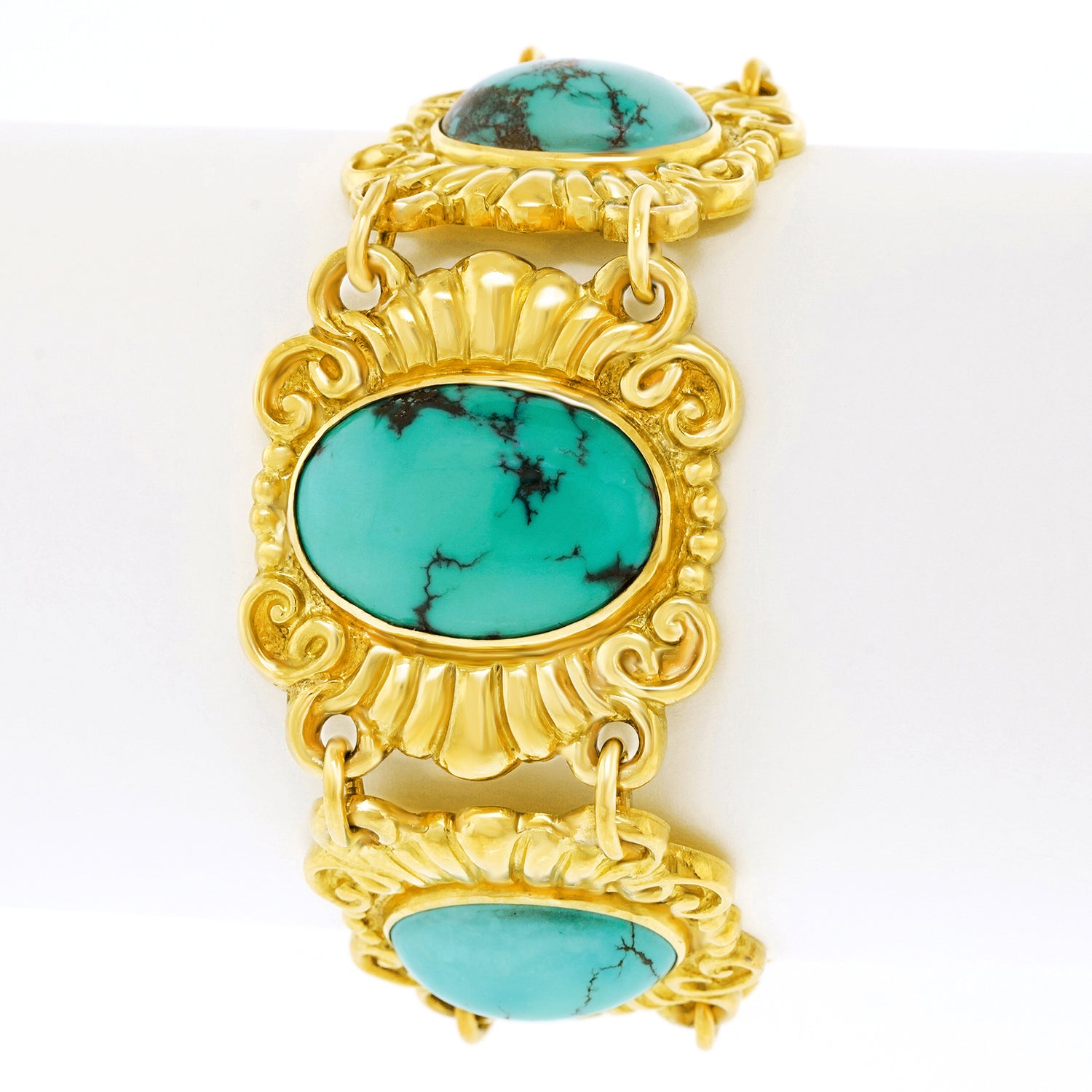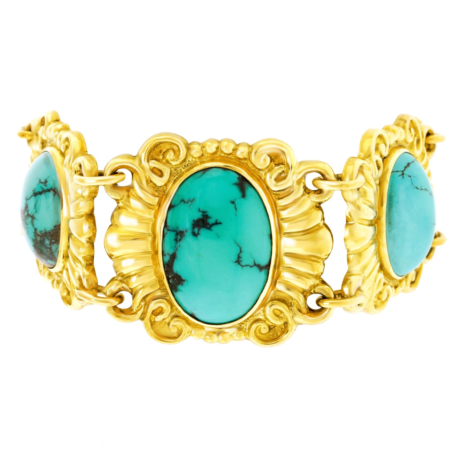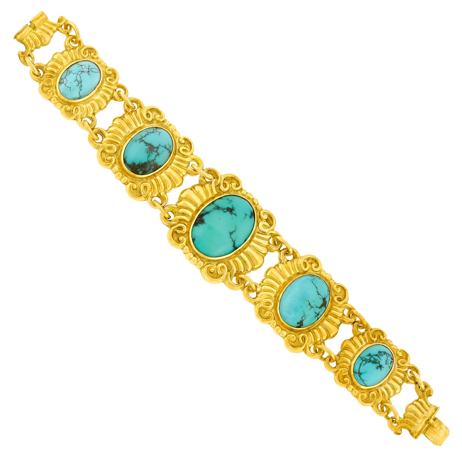 Circa 1930s, 18k, Swiss. This eye-catching Deco bracelet is fashionably relevant wearable history. The vibrant turquoise stones are meticulously bezel-set in eighteen-karat yellow gold elements, giving the piece compelling visual authority. Excellent condition.