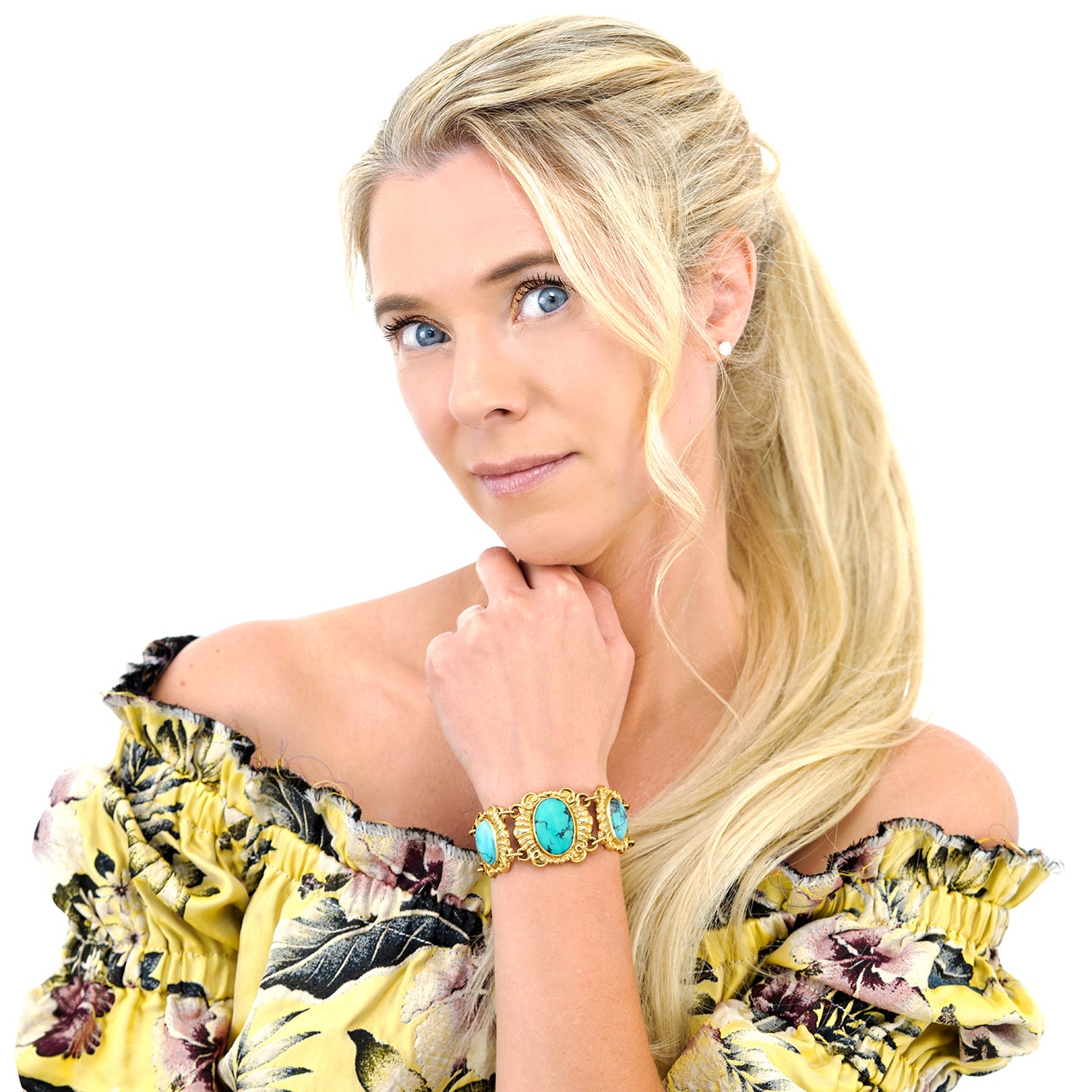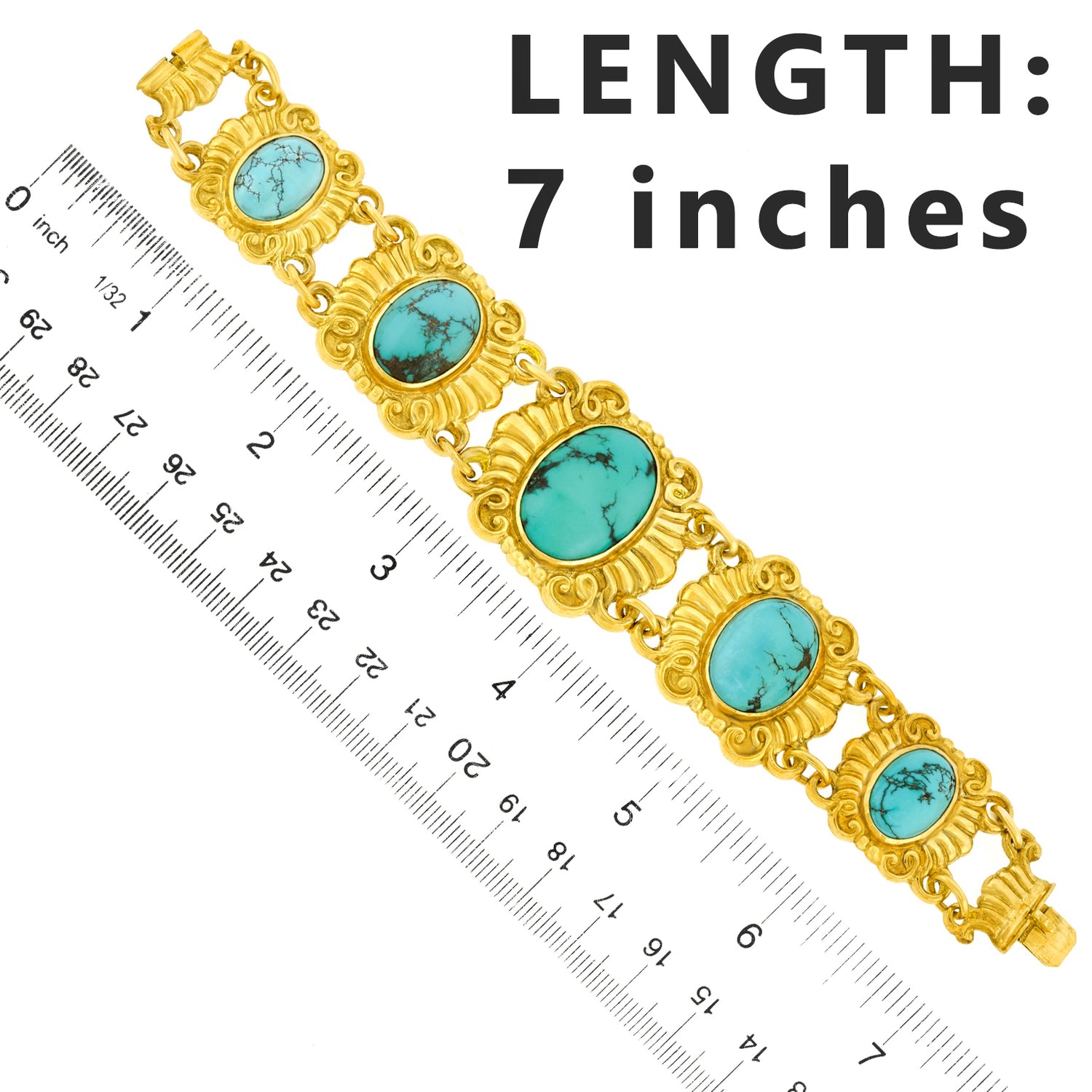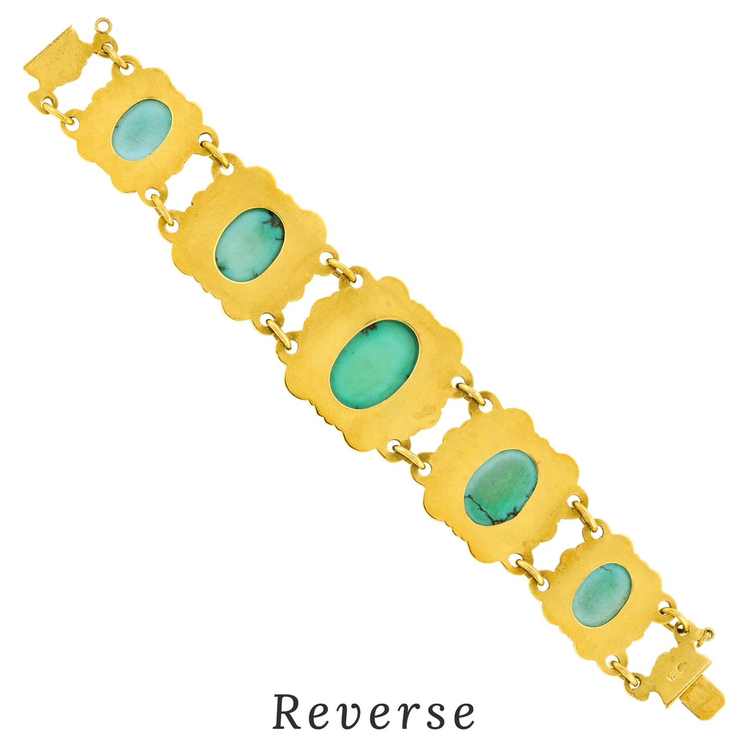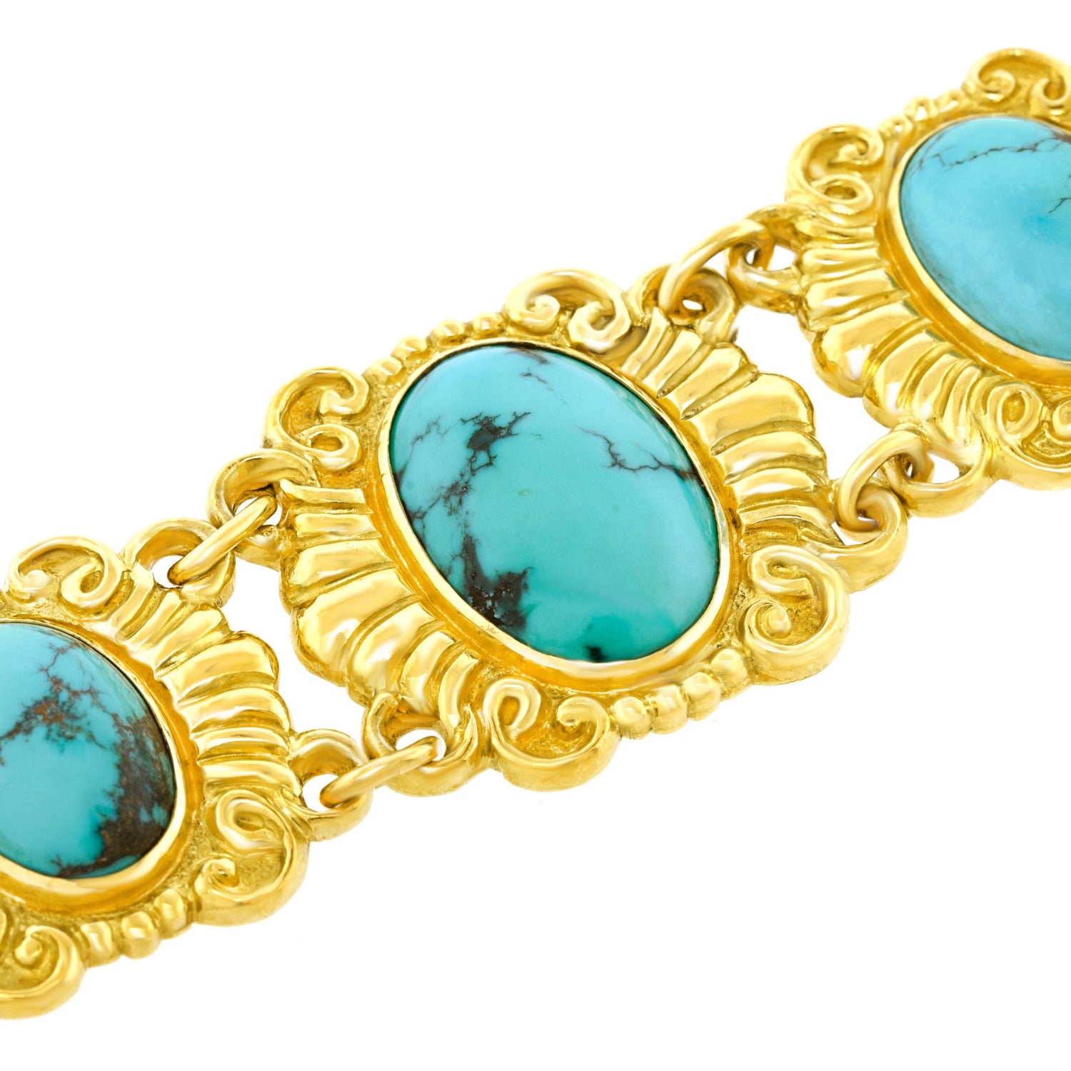 Circa 1930s, 18k, Swiss. This eye-catching Deco bracelet is fashionably relevant wearable history. The vibrant turquoise stones are meticulously bezel-set in eighteen-karat yellow gold elements, giving the piece compelling visual authority. Excellent condition.