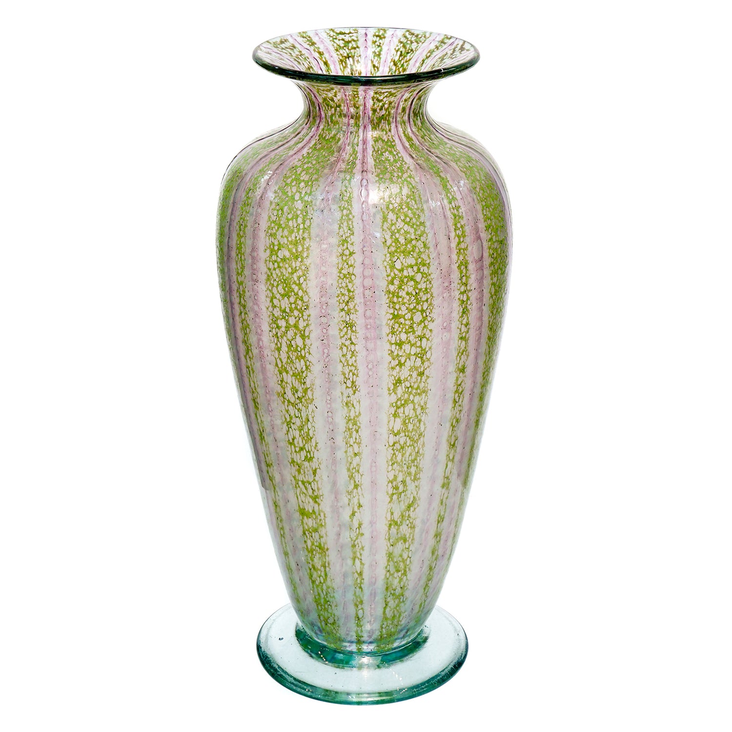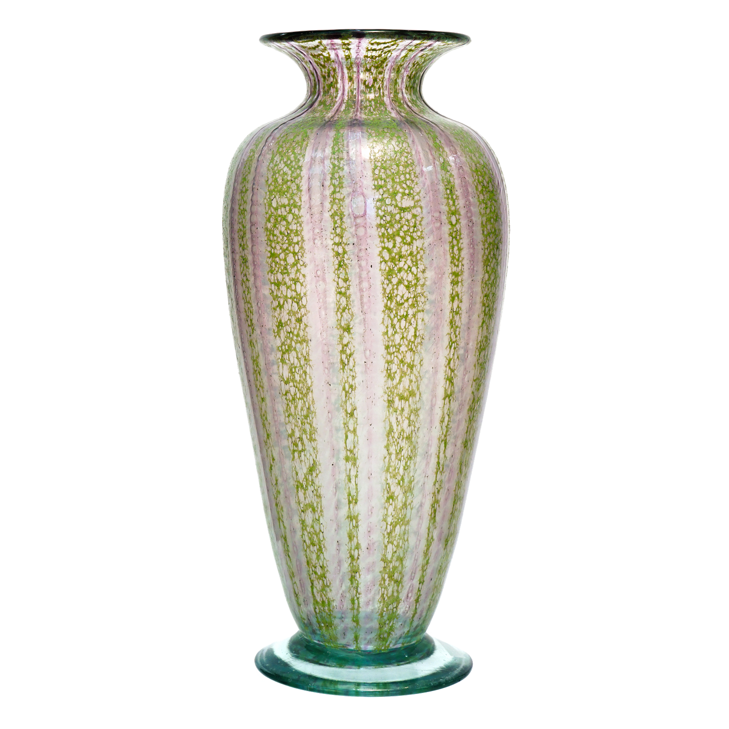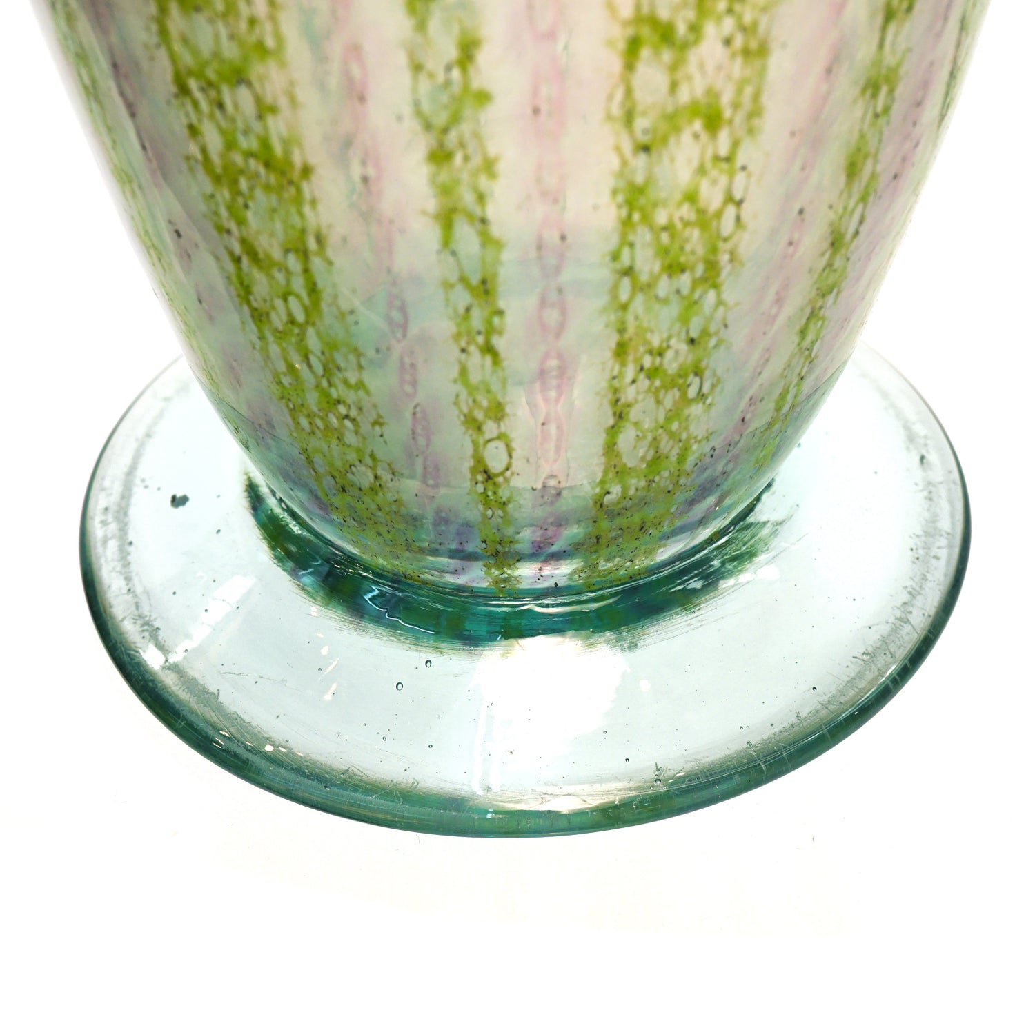Circa 1928 to 31, by Arthur Douglas Nash, American. Founded in 1928 and producing glass until 1931, the A. Douglas Nash Corp. glassworks created timeless works of art. This gorgeous 15-inch tall vase features a striated pattern in delicate pinks and greens on an especially pleasing form. Exceptionally well made, this is a sublime Art Deco accessory. Excellent condition.