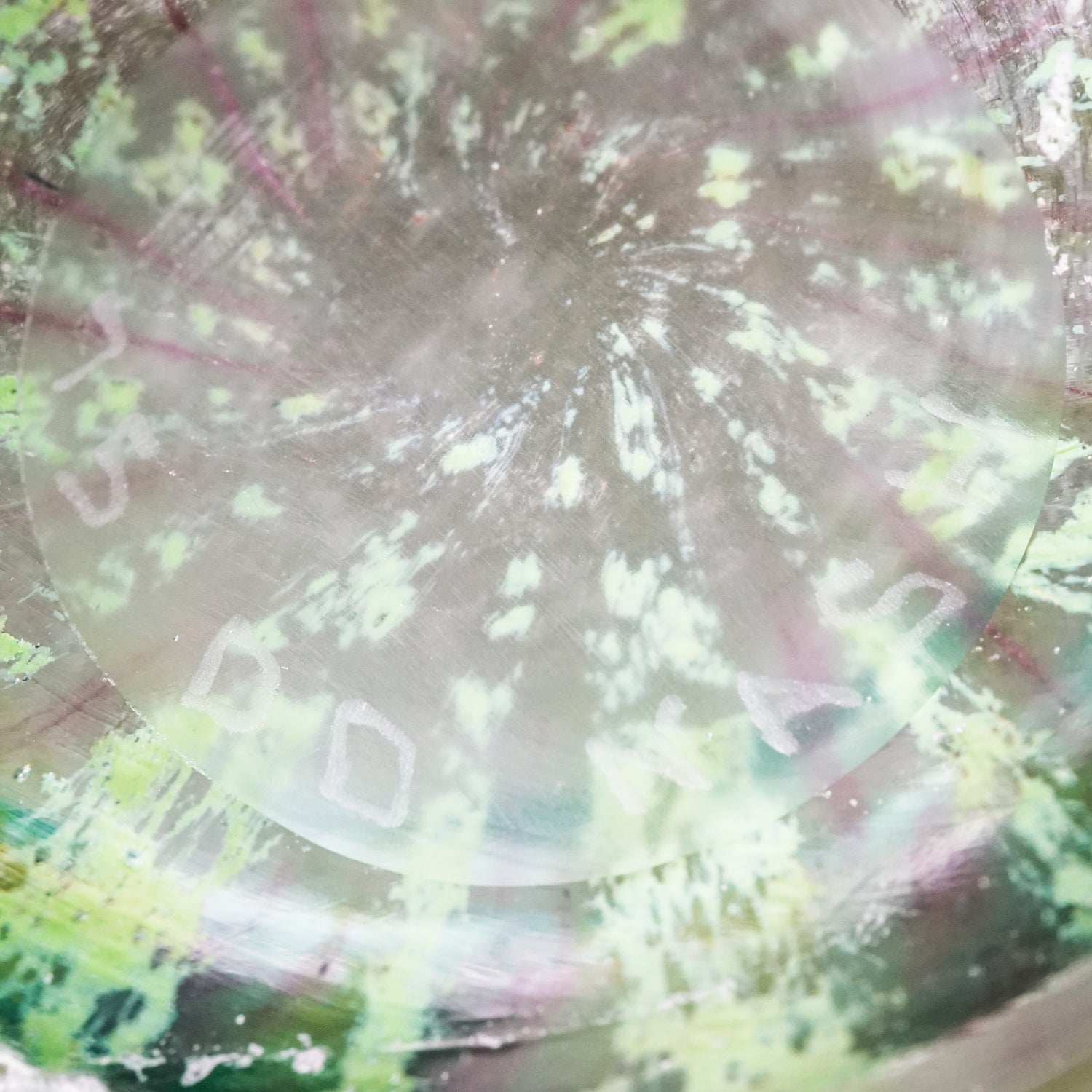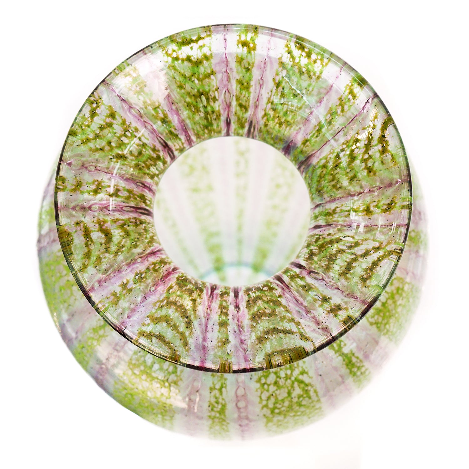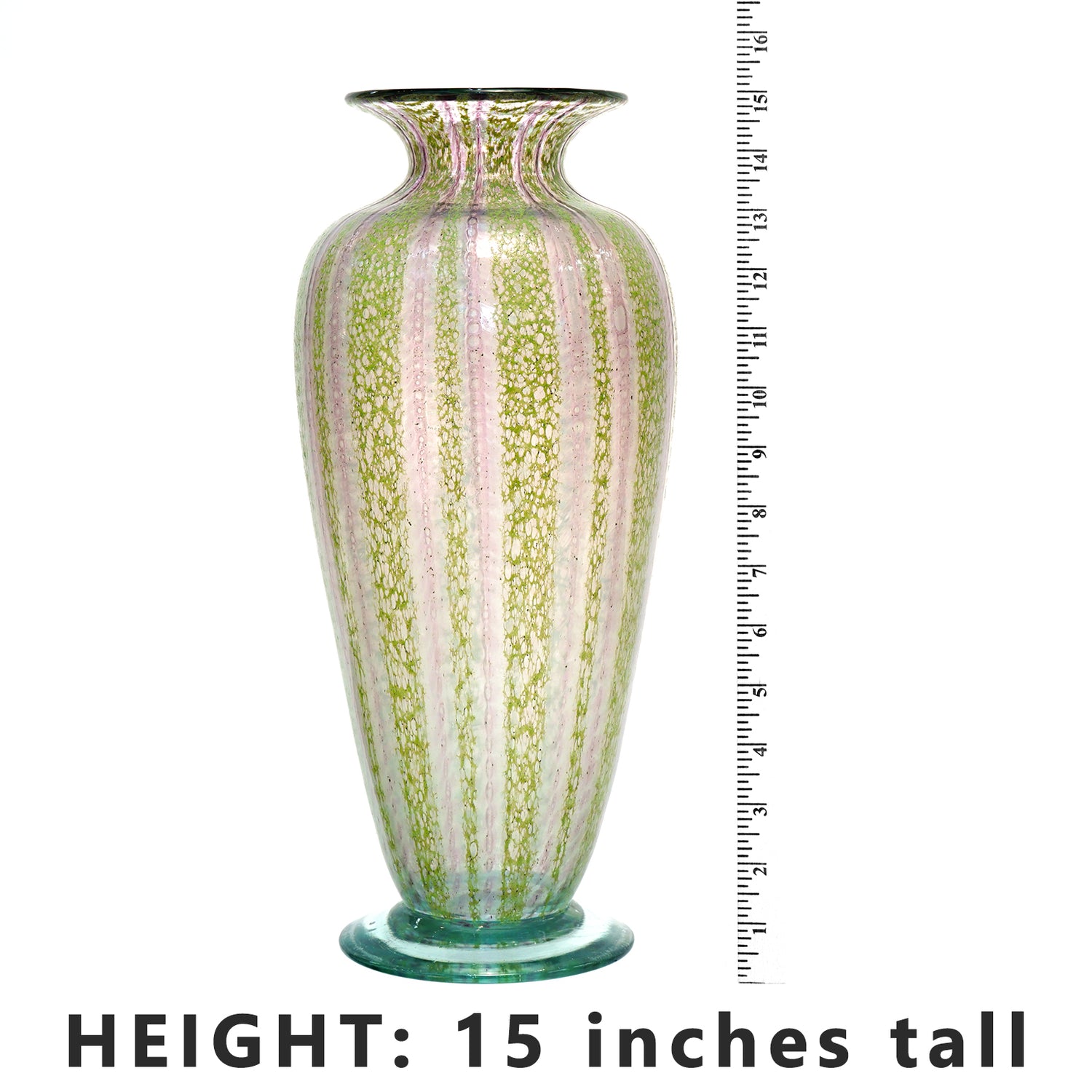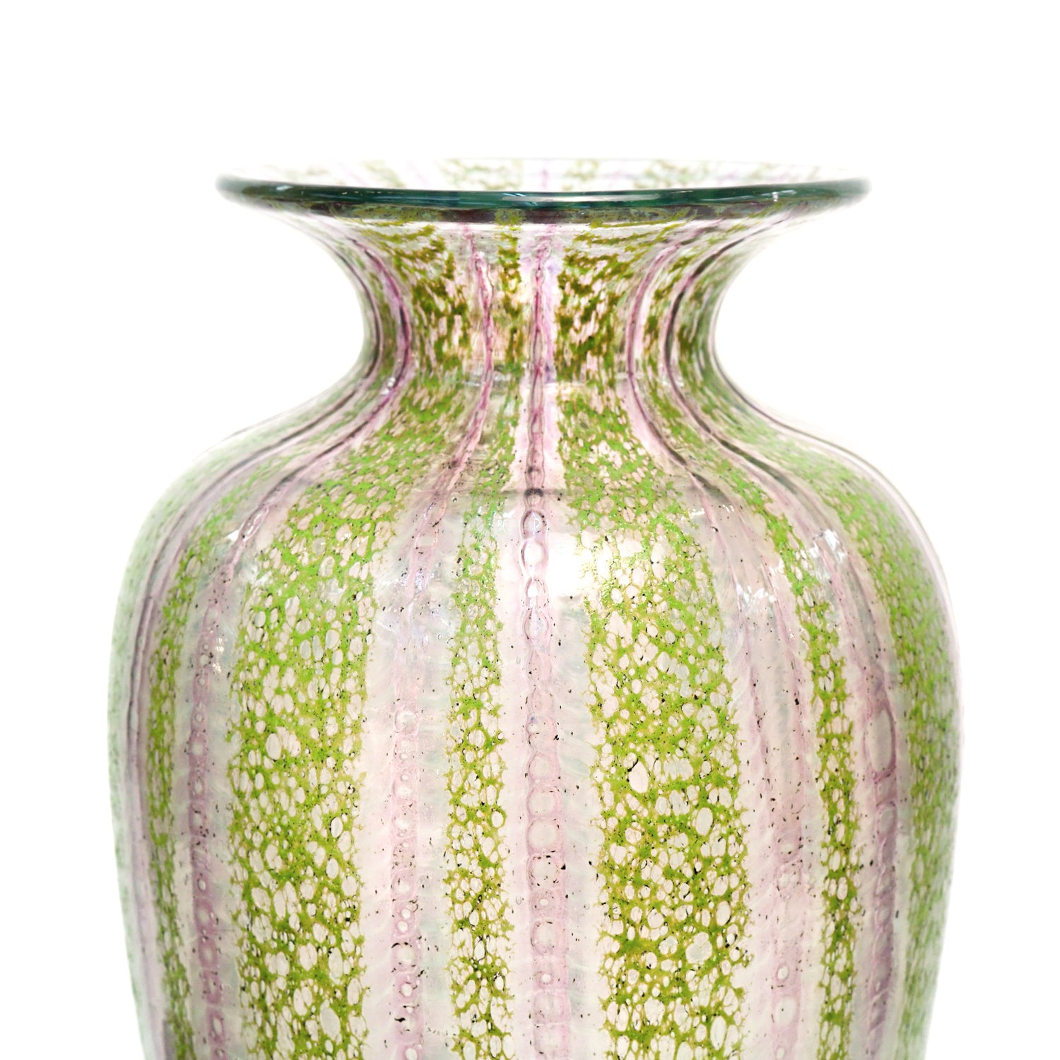Circa 1928 to 31, by Arthur Douglas Nash, American. Founded in 1928 and producing glass until 1931, the A. Douglas Nash Corp. glassworks created timeless works of art. This gorgeous 15-inch tall vase features a striated pattern in delicate pinks and greens on an especially pleasing form. Exceptionally well made, this is a sublime Art Deco accessory. Excellent condition.