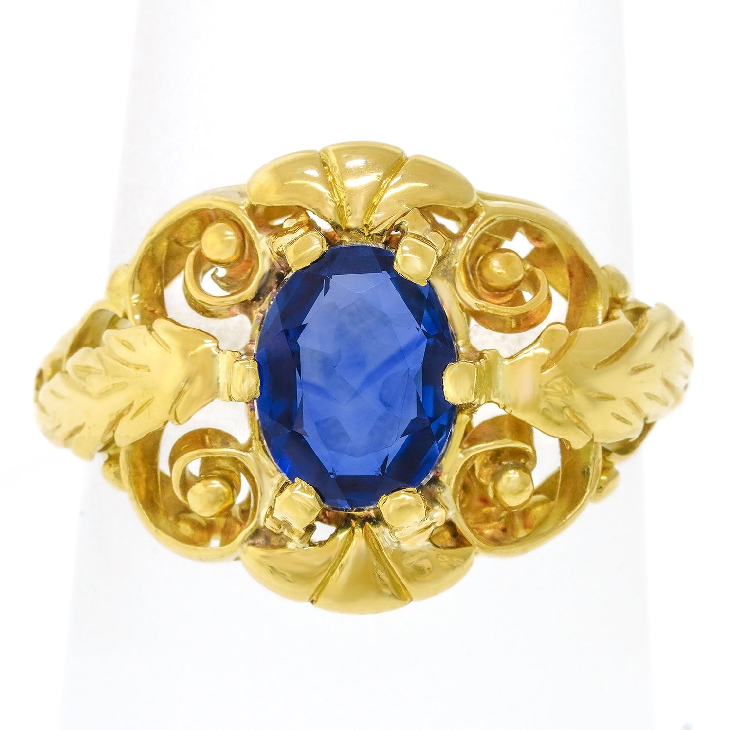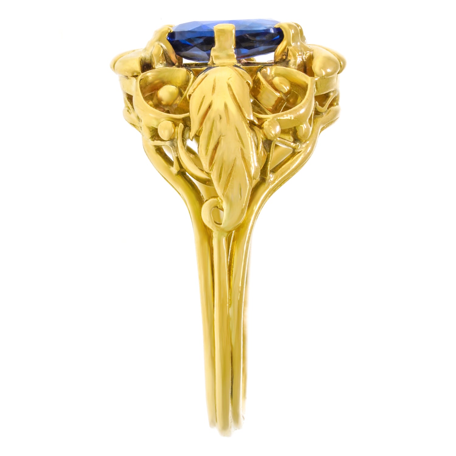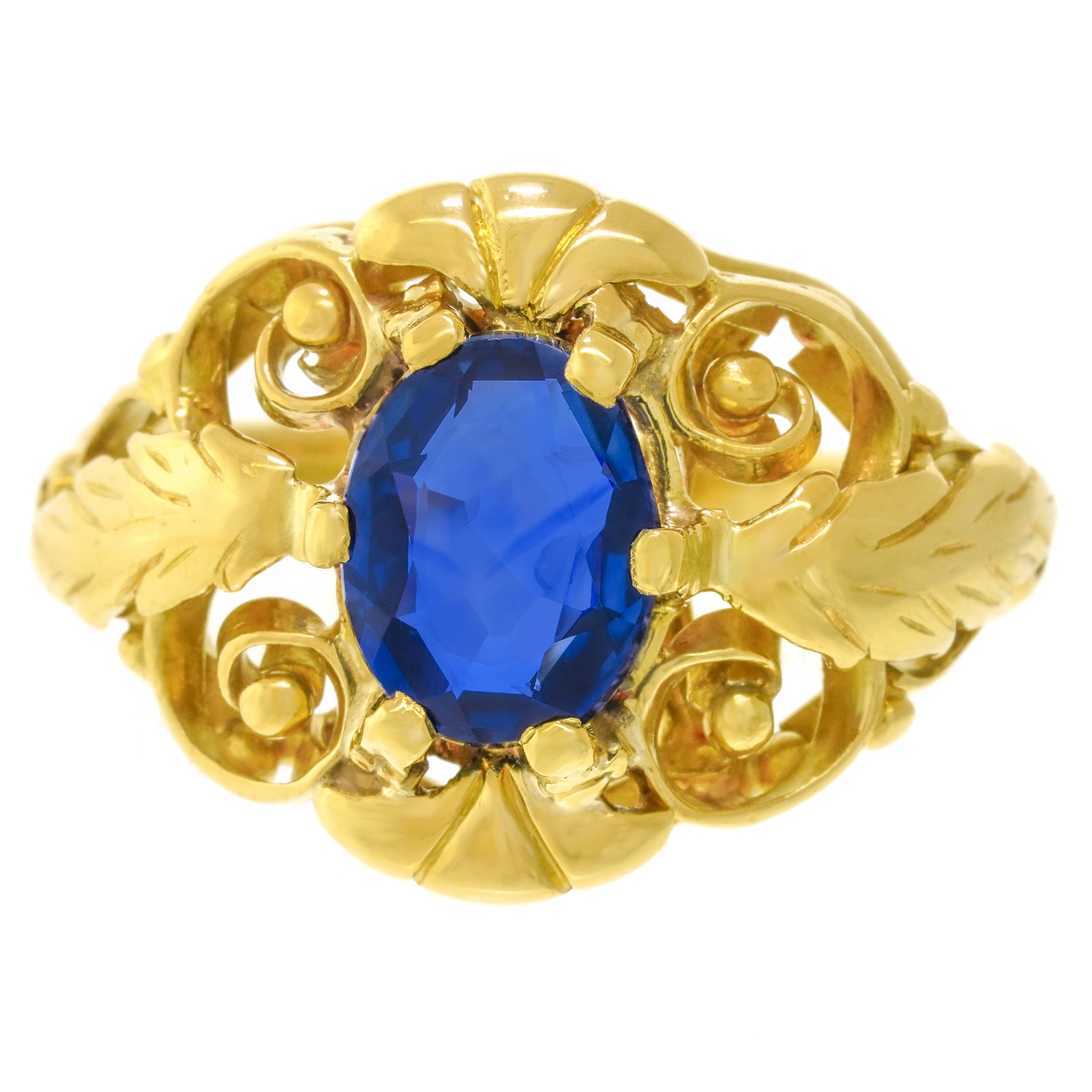 Circa 1920s, 18k. This unique Arts & Crafts ring is set with a bright cornflower blue 1.32-carat sapphire, surrounded by graceful scrolls and naturalistic leaves. The look is one-of-a-kind, perfect for your signature collection. Well-made in eighteen-karat yellow gold, this ring is in excellent condition.