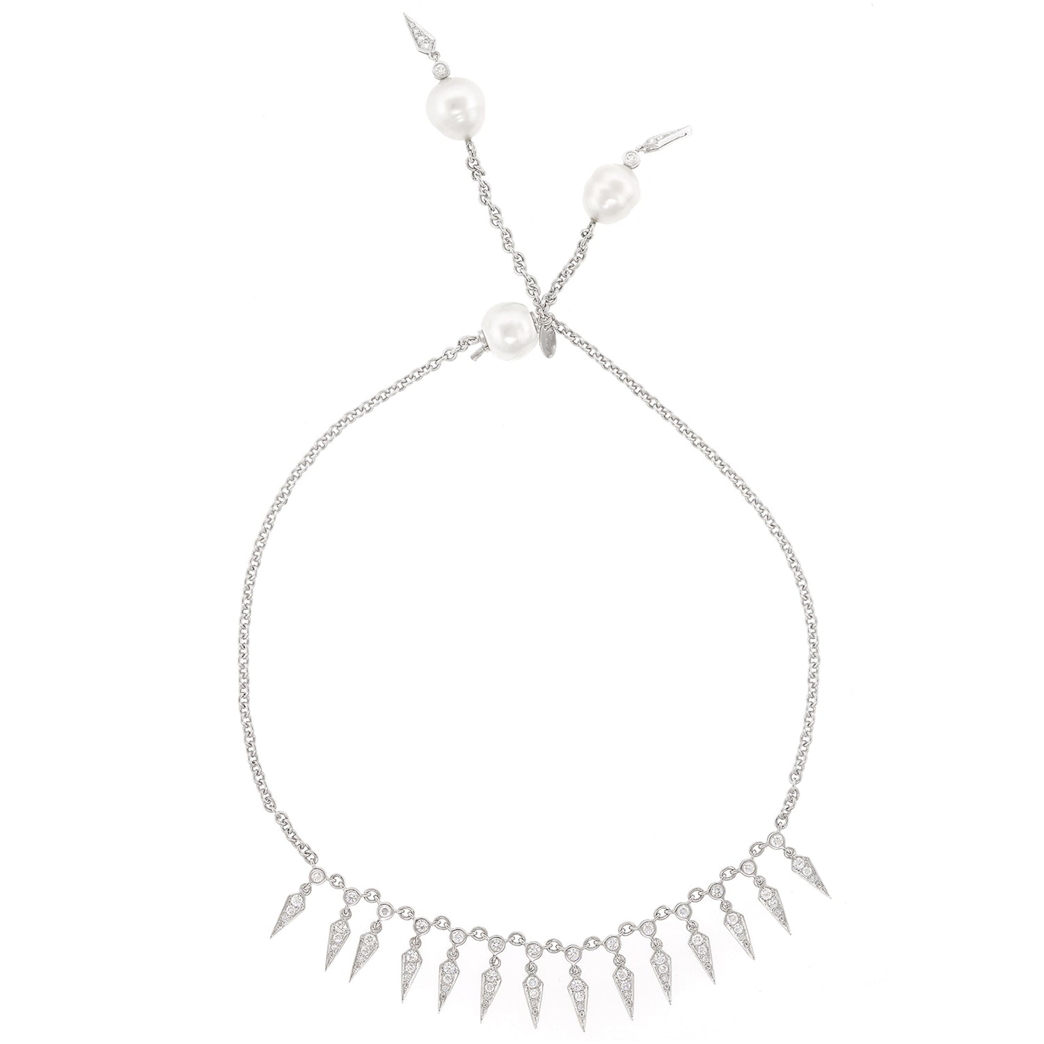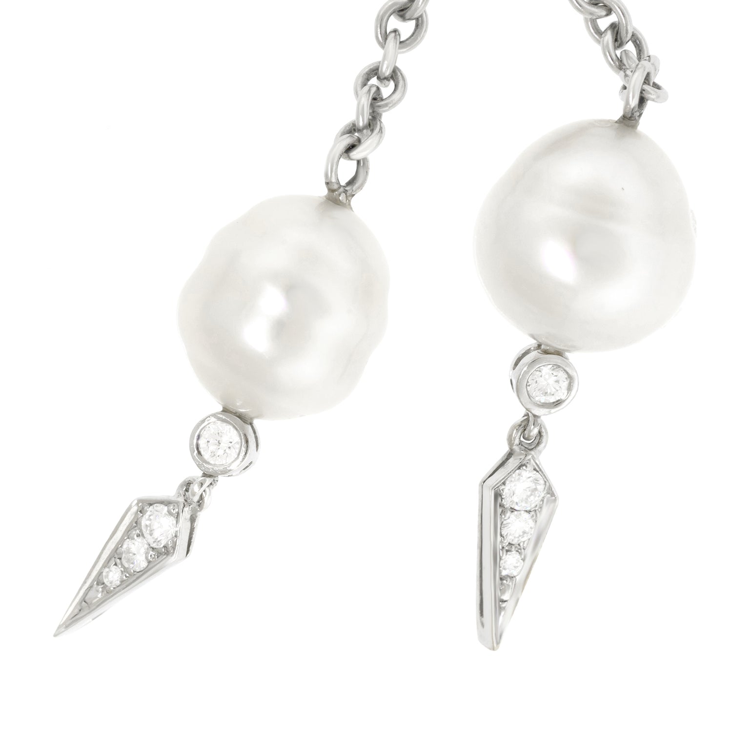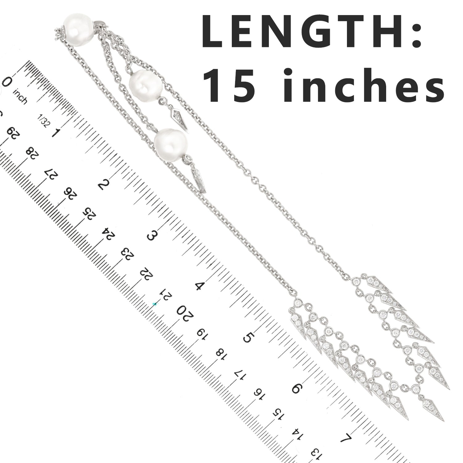 Circa 2000s, 18k, by Assael, American. This South Sea pearl and diamond necklace by Assael is fabulous! The juxtaposition of classic elements and contemporary design is fresh, timeless style. Rife with playful movement, the diamond-set festoons softly dance as the necklace is worn. The gorgeous South Sea pearls that make up the clasp and delightfully decorate the back are eleven millimeters and very lustrous. Renowned for their best of best pearls, their superb fabrication is underscored by sophisticated design. Assael jewels are among my favorites. Excellent condition.