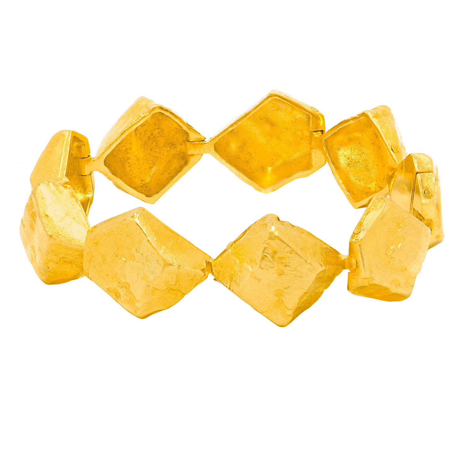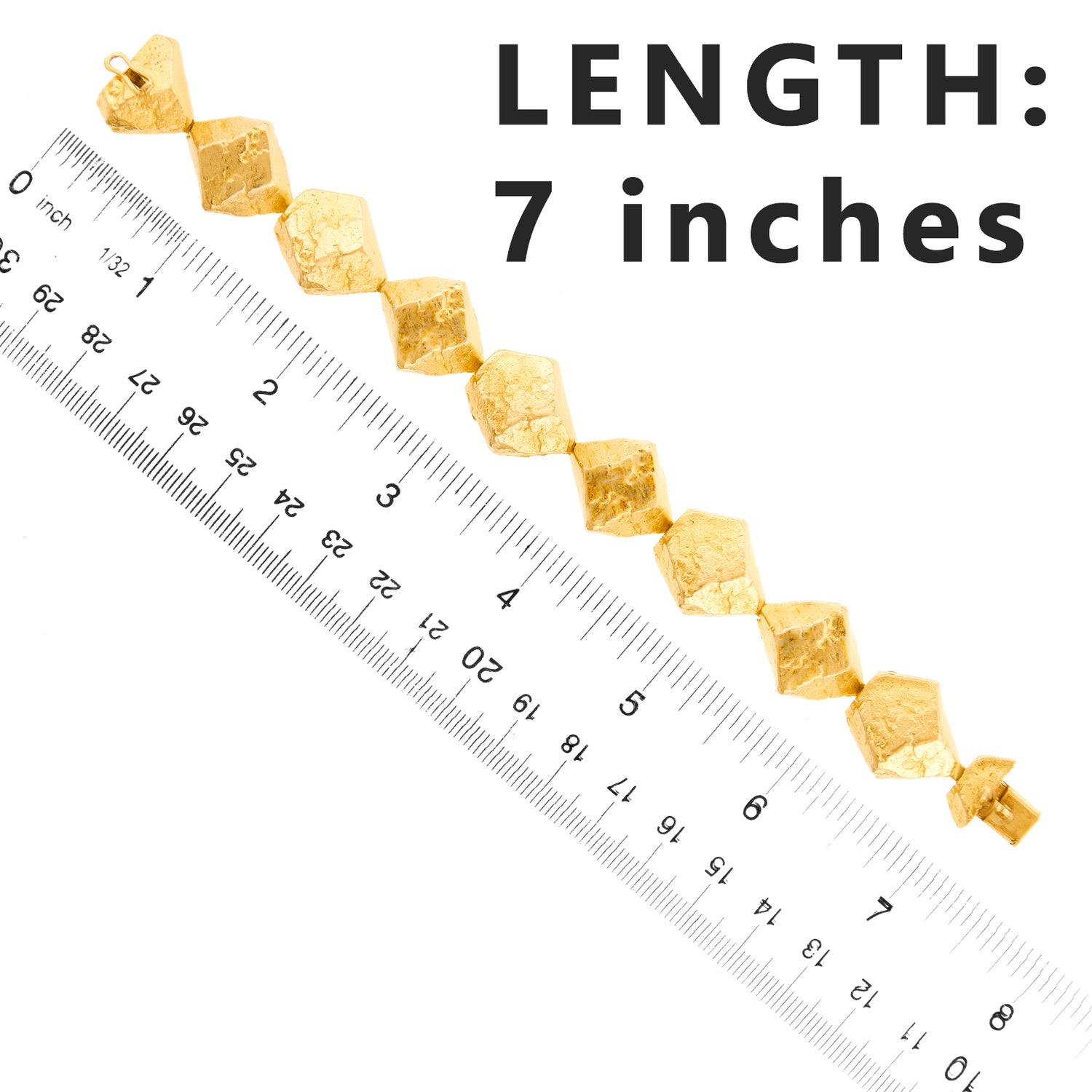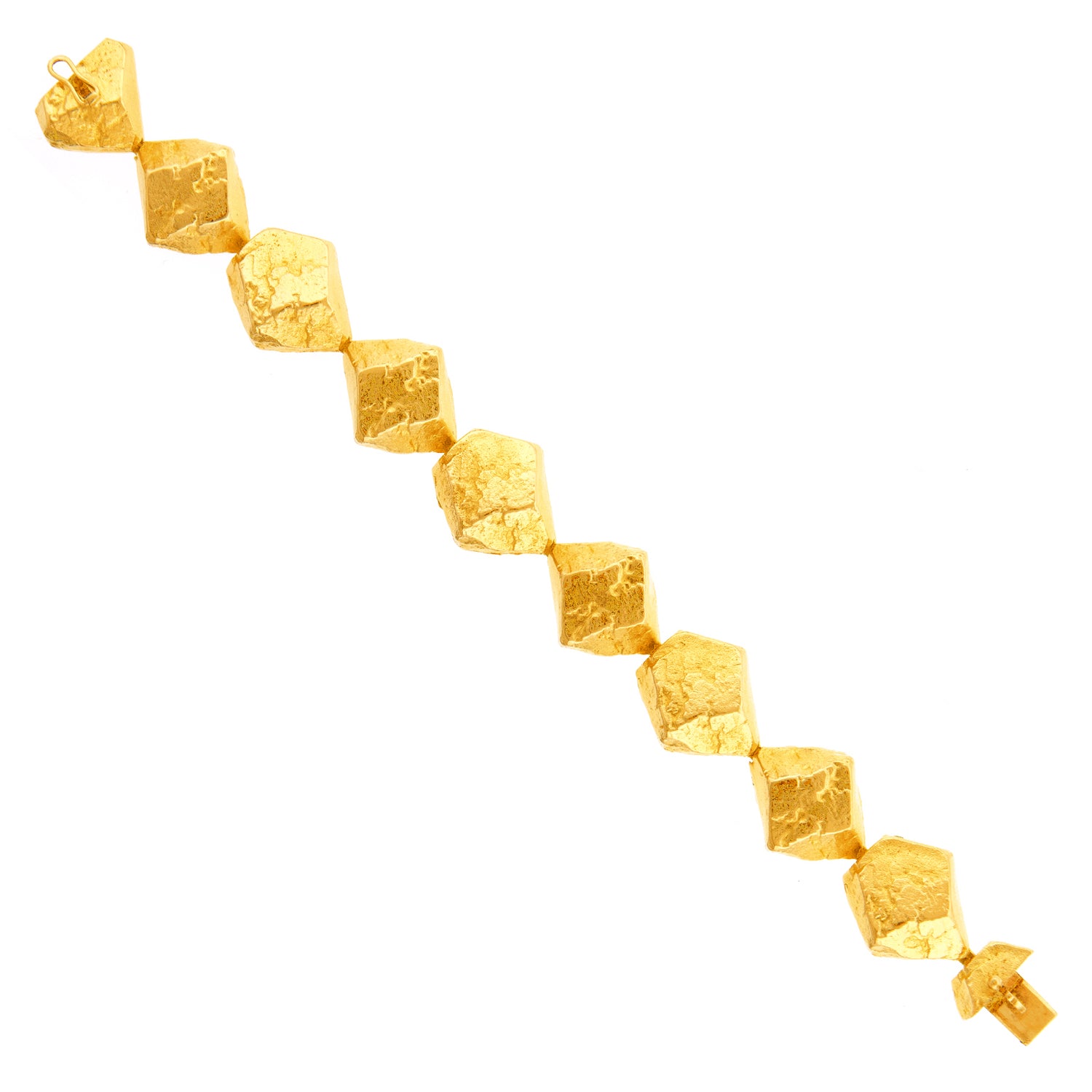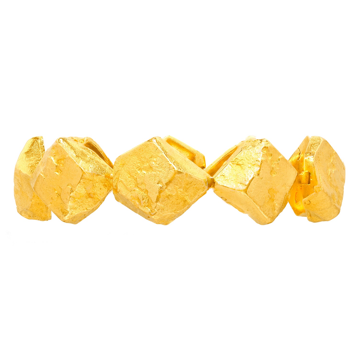 Circa 1970s, 18k, by Bjorn Weckstrom, Finland. Modern art to-go, this striking bracelet by Bjorn Weckstrom is wearable contemporary Art. The dimensional Brutalist form with varied surfaces creates visual excitement for a brilliantly chic all-gold look. Excellent condition.