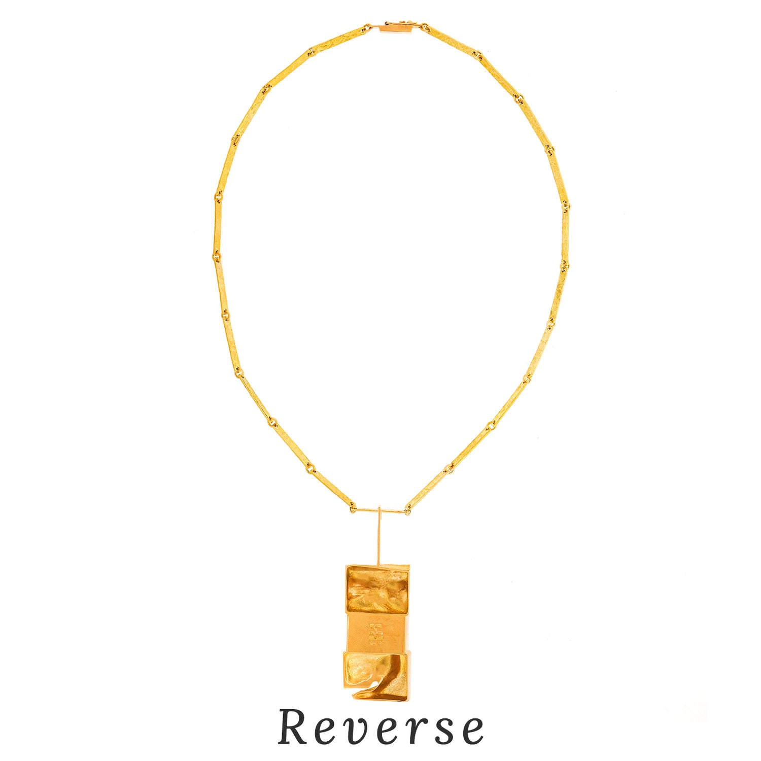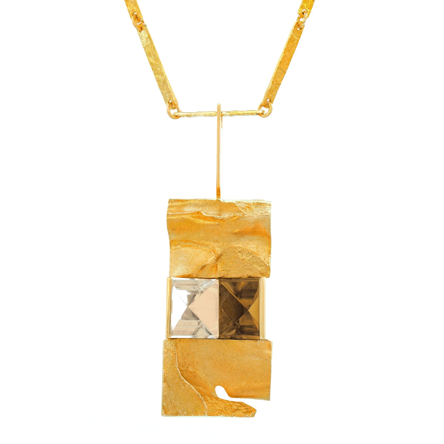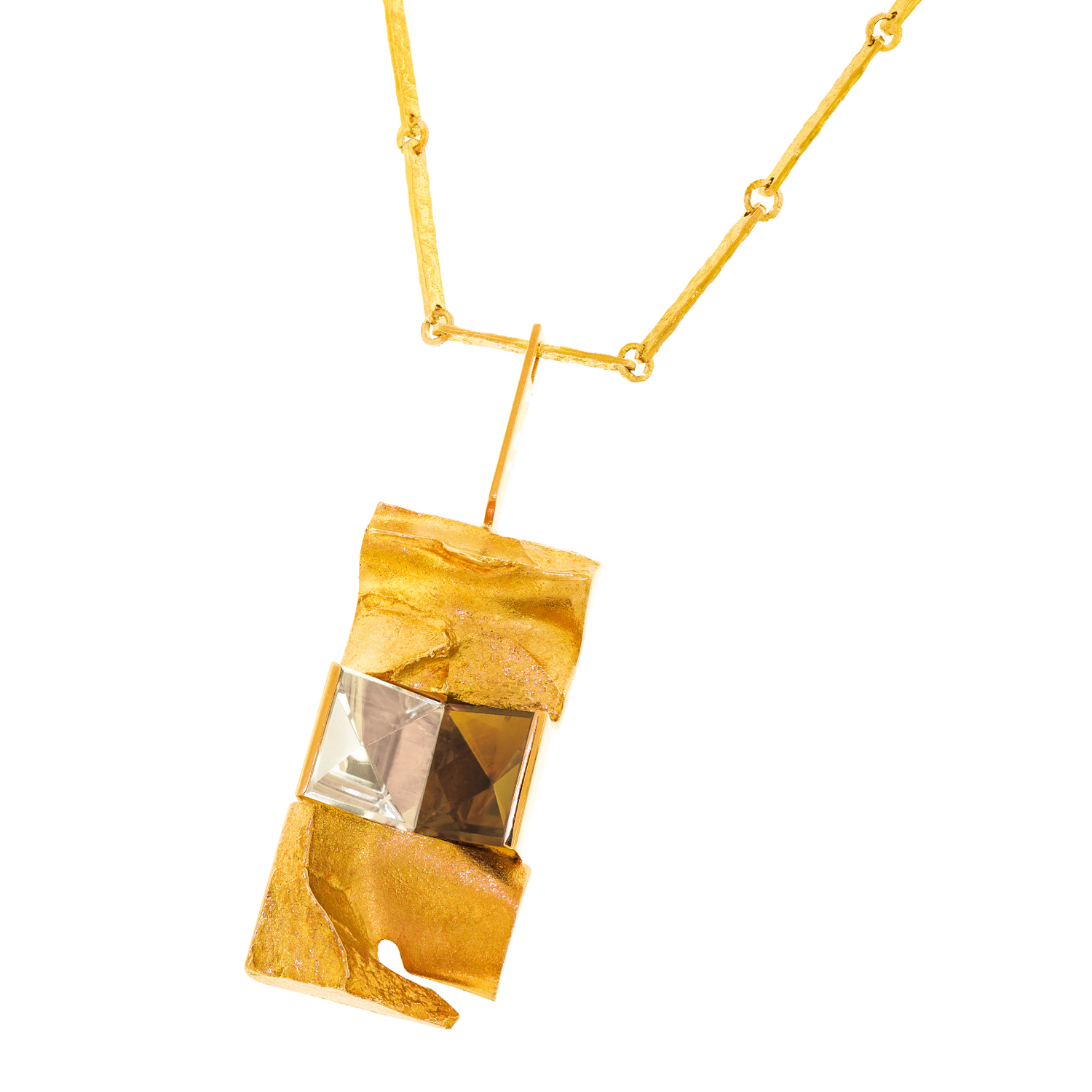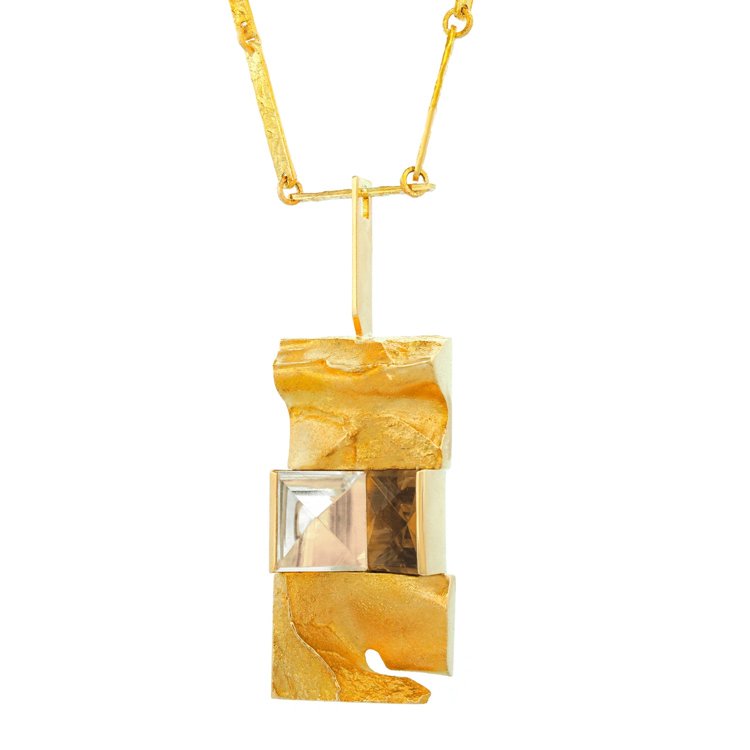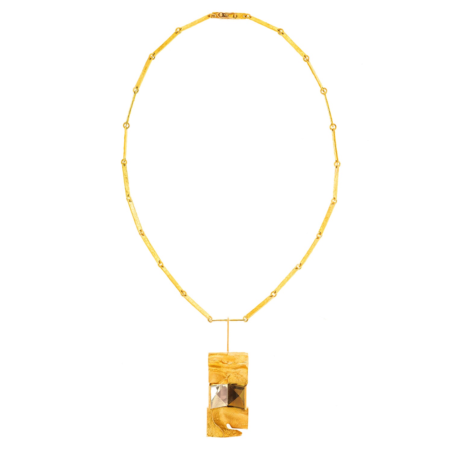 Dated 1971, 14k, by Bjorn Weckstrom, Finland.  Sculpture-to-go, this stylish yellow gold necklace designed by Bjorn Weckstrom for Lapponia is an exceptional example of the Finnish Post-Modern idiom expressed as Art Jewelry. The flowing brutalist forms and citrine and rock crystal stones are visually exciting. Excellent condition.