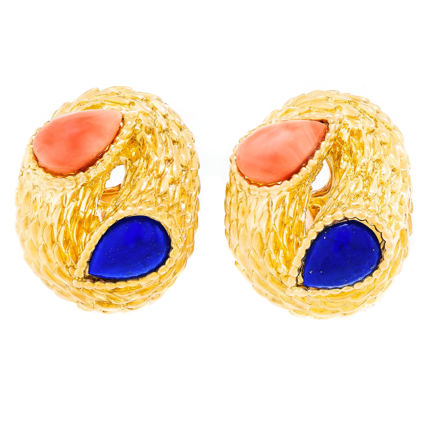 Circa 1970s, 18k, by Boucheron, France. These elegant earrings are very Parisian, very stylish and sooo... Boucheron! A signature style of the house, they are set with brilliant blue lapis and soft pink coral. Their restrained design effortlessly dresses up and down, perfect for any moment of fashion. Meticulously fabricated in eighteen-karat yellow gold, they are in excellent condition.
