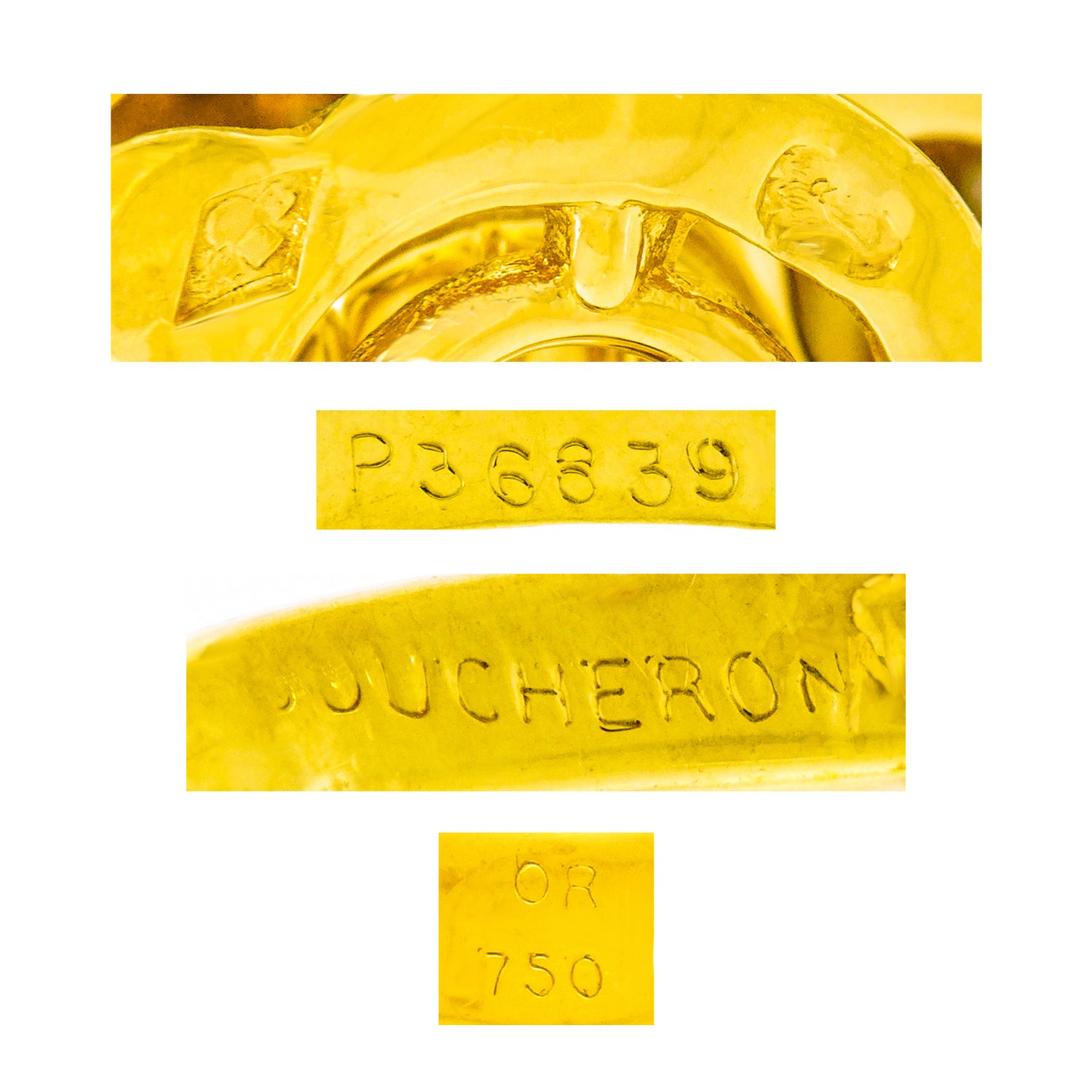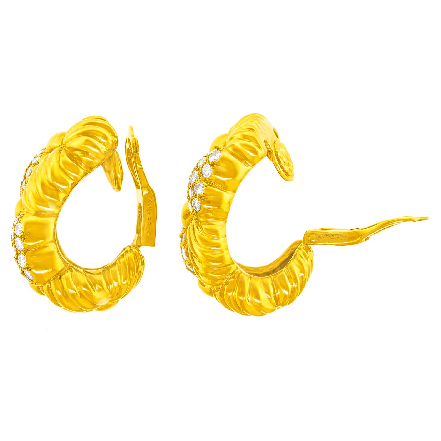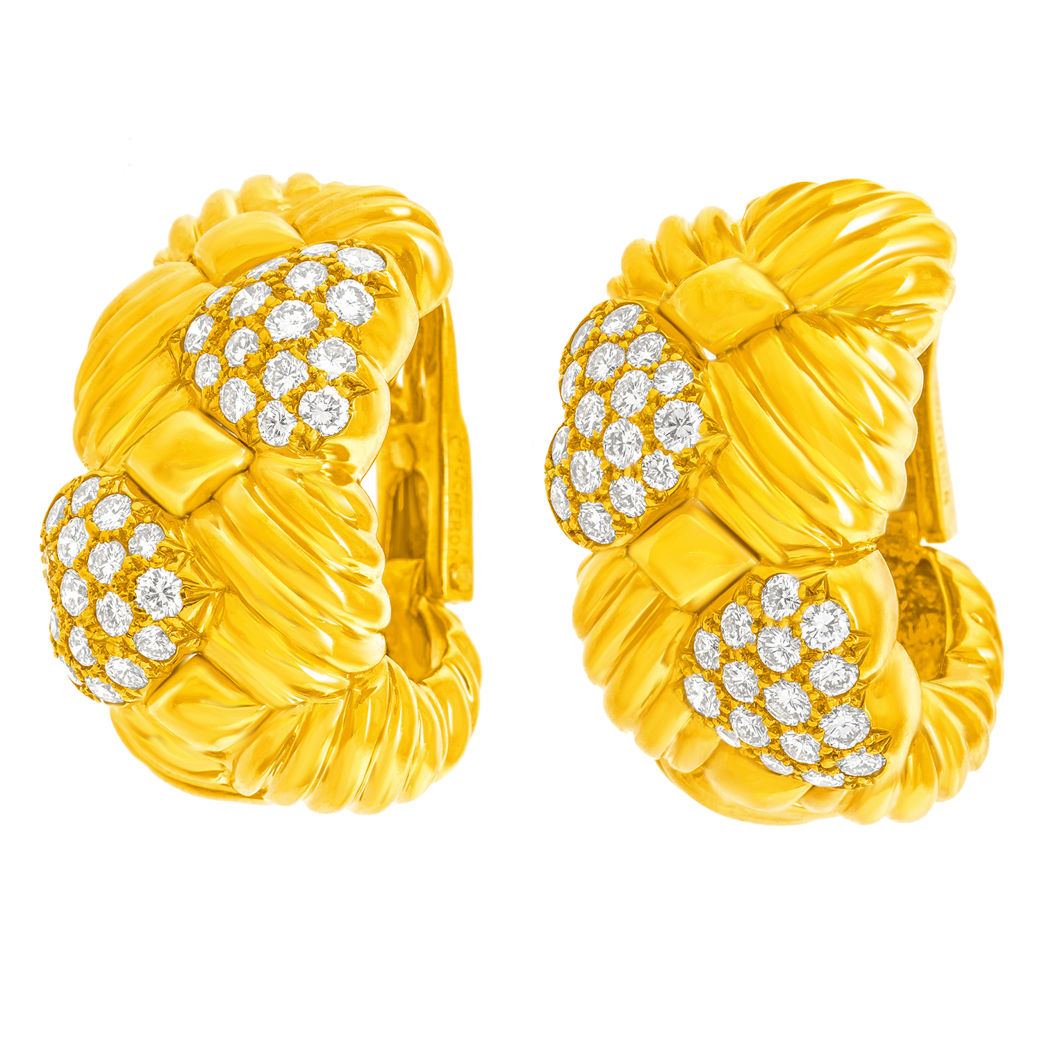 Circa 1960s, by Boucheron, Paris, France. These sublime diamond-set yellow gold earrings by the storied house of Boucheron feature an understated heart motif. The look is vintage French sixties jewelry at its fashionable Parisian best. The chic Gallic narrative is underscored by 3.0 carats of superb white diamonds (F color, VS clarity). These earrings are finely fashioned, beautifully designed, and very comfortable, all the qualities we expect from Boucheron. As an added bonus, these earrings were actually made in Boucheron’s own workshops (a rare occurrence). Excellent condition.