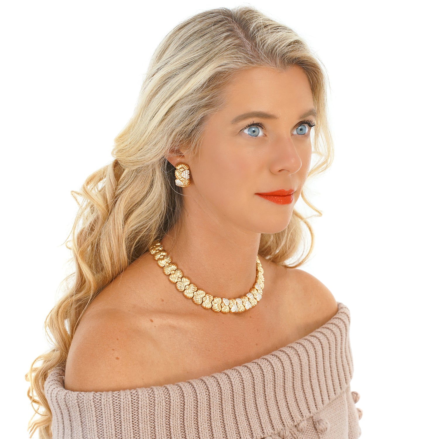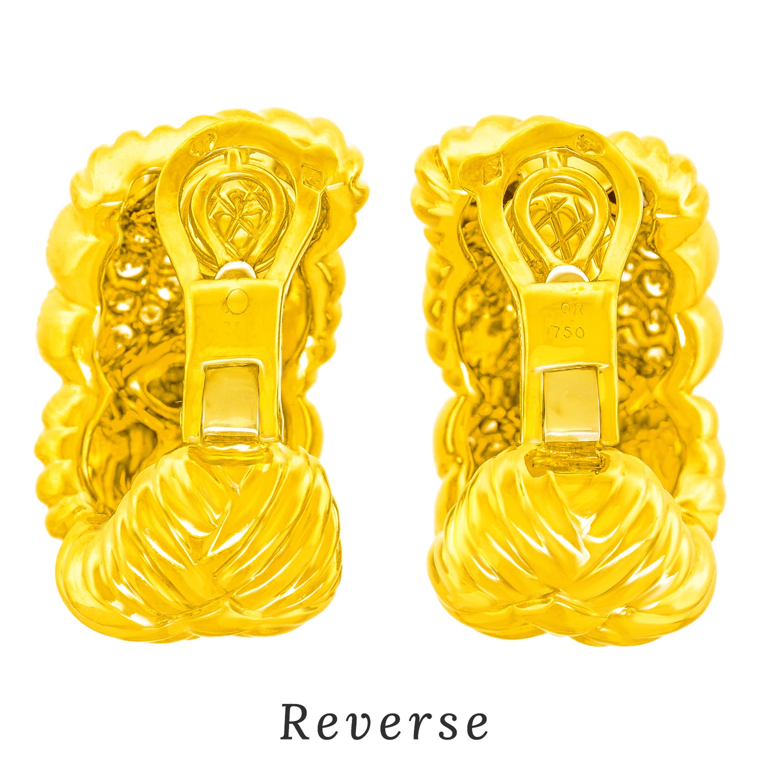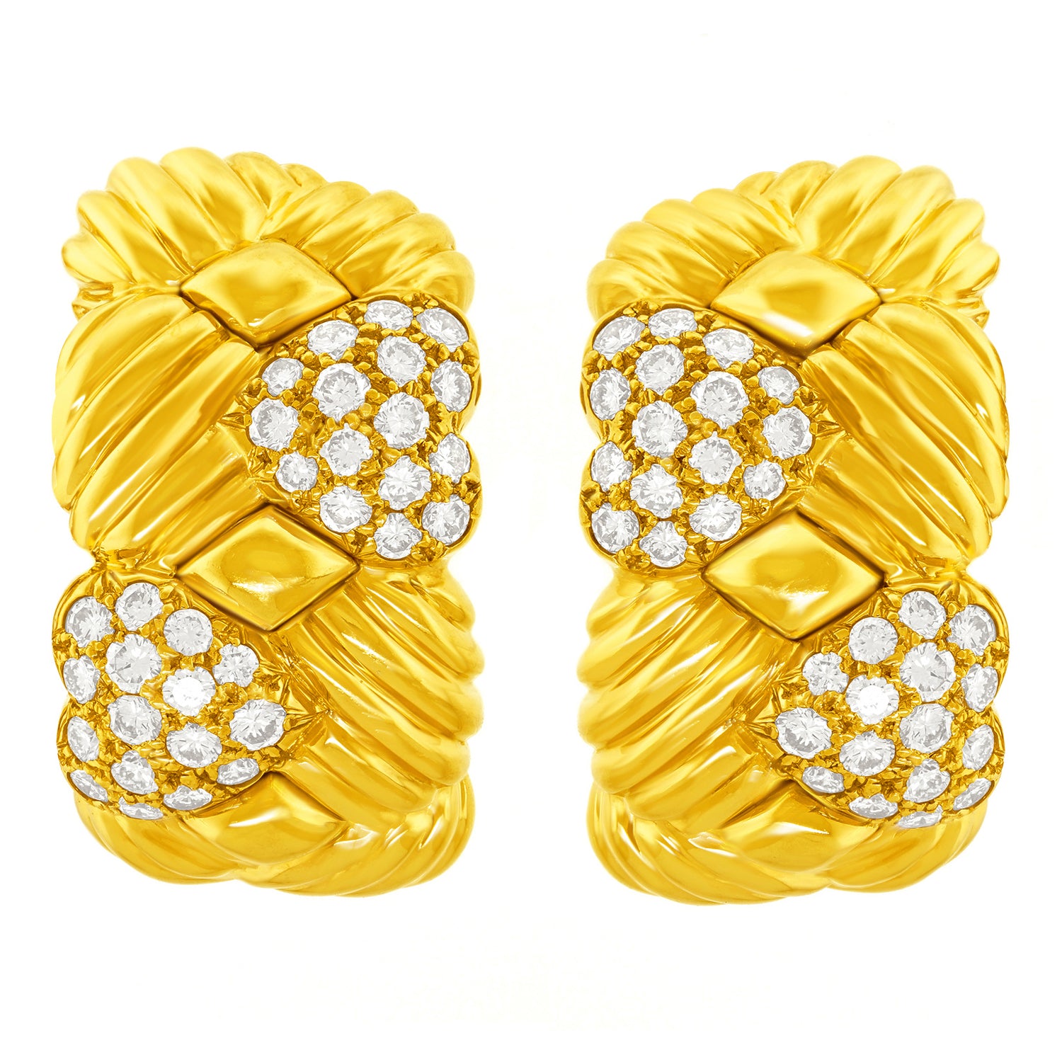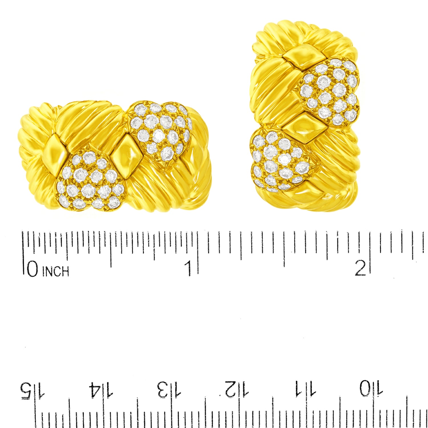 Circa 1960s, by Boucheron, Paris, France. These sublime diamond-set yellow gold earrings by the storied house of Boucheron feature an understated heart motif. The look is vintage French sixties jewelry at its fashionable Parisian best. The chic Gallic narrative is underscored by 3.0 carats of superb white diamonds (F color, VS clarity). These earrings are finely fashioned, beautifully designed, and very comfortable, all the qualities we expect from Boucheron. As an added bonus, these earrings were actually made in Boucheron’s own workshops (a rare occurrence). Excellent condition.