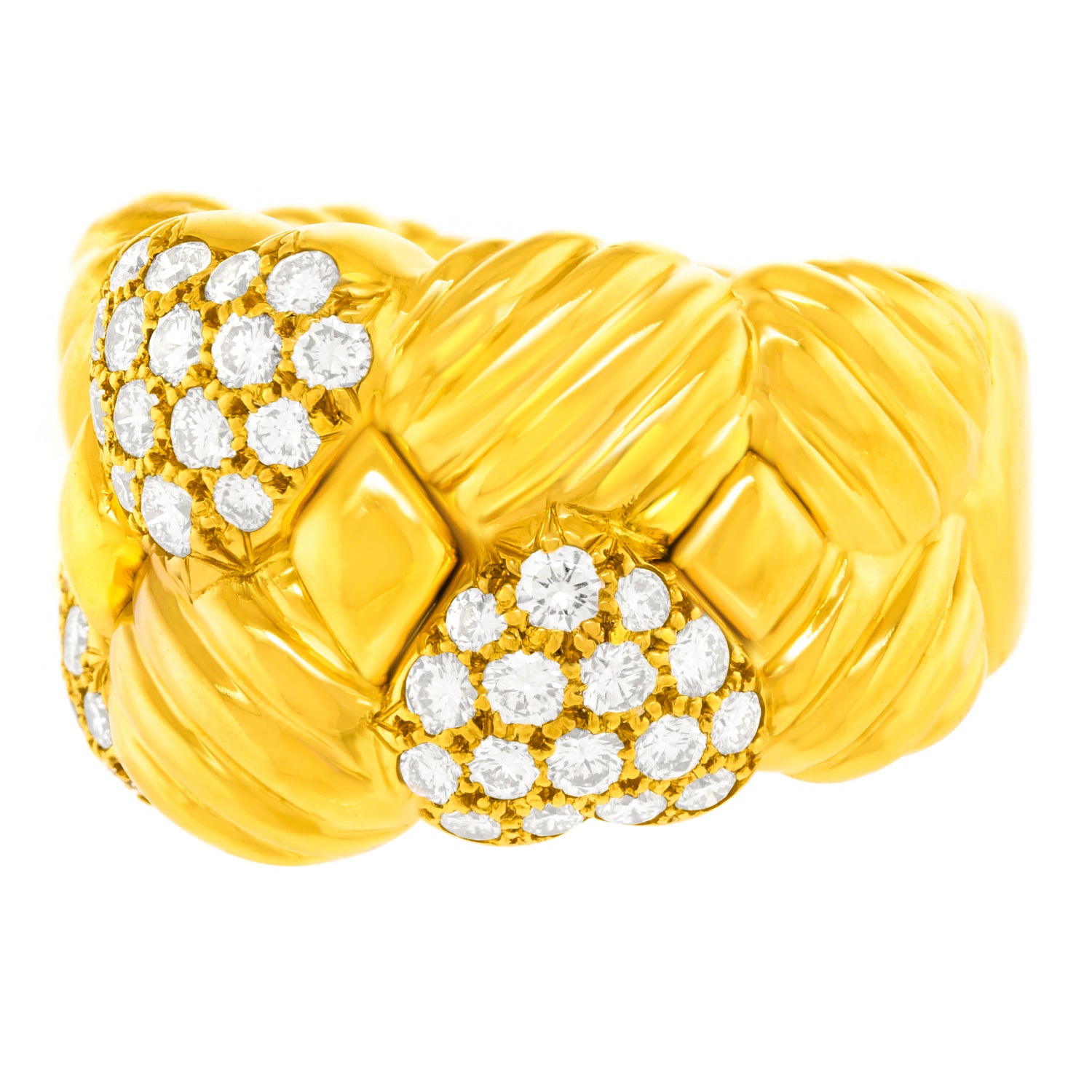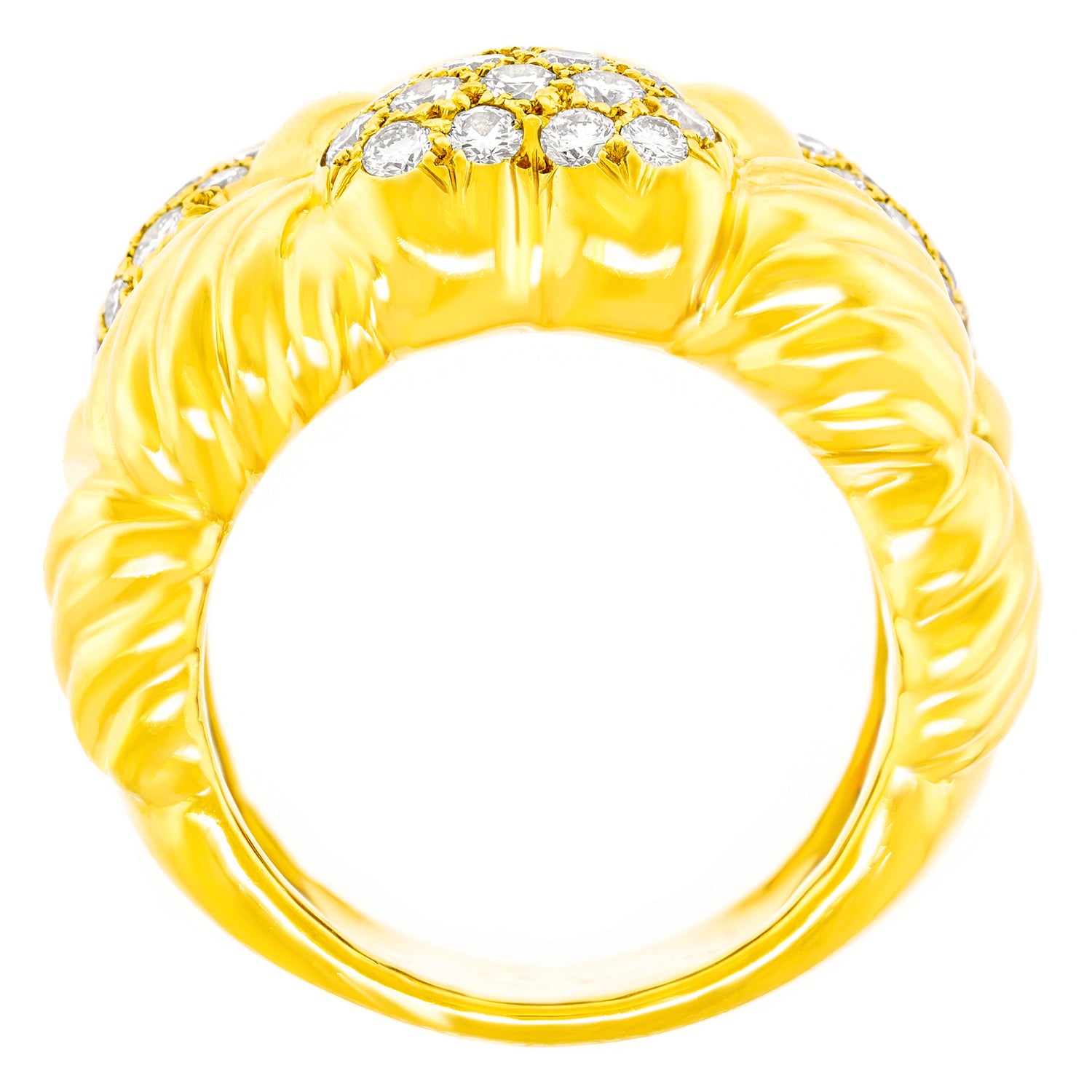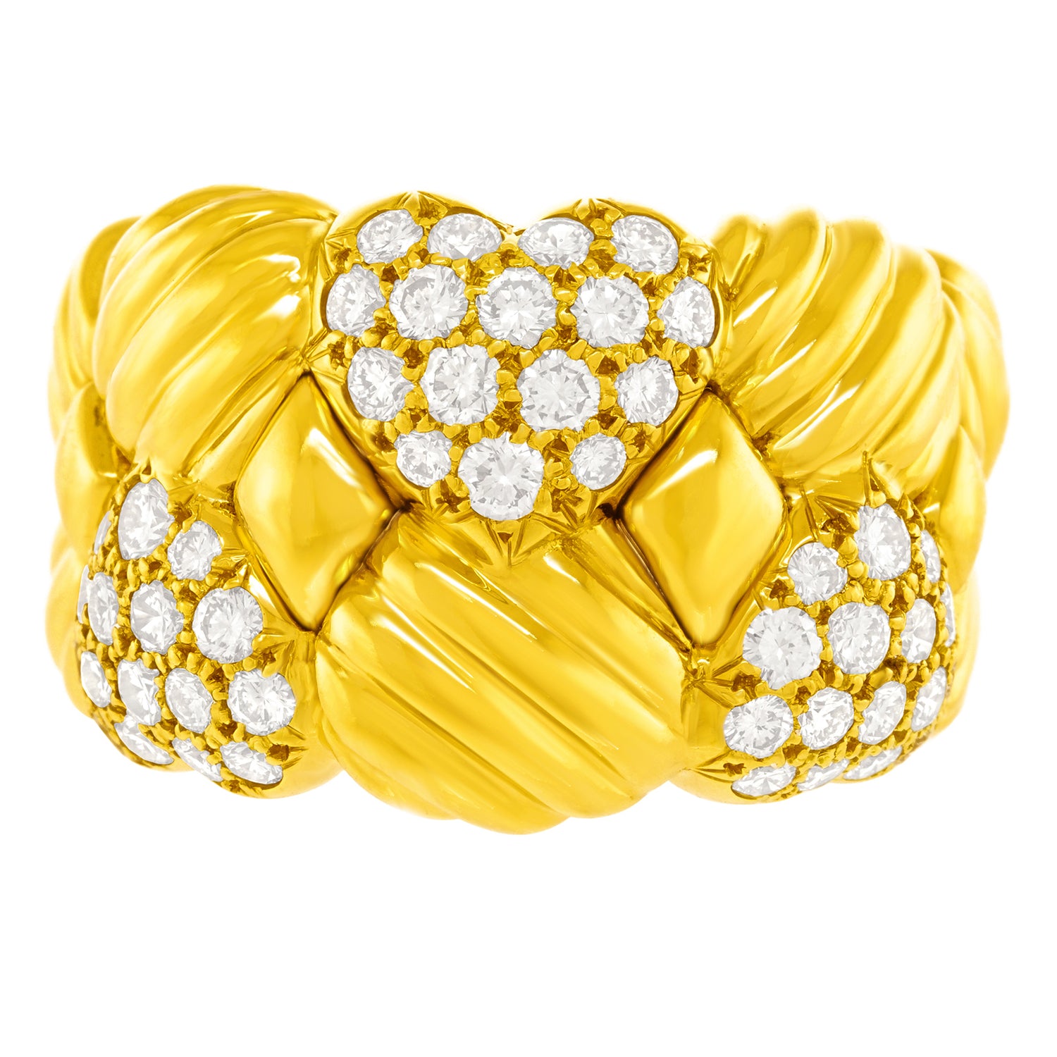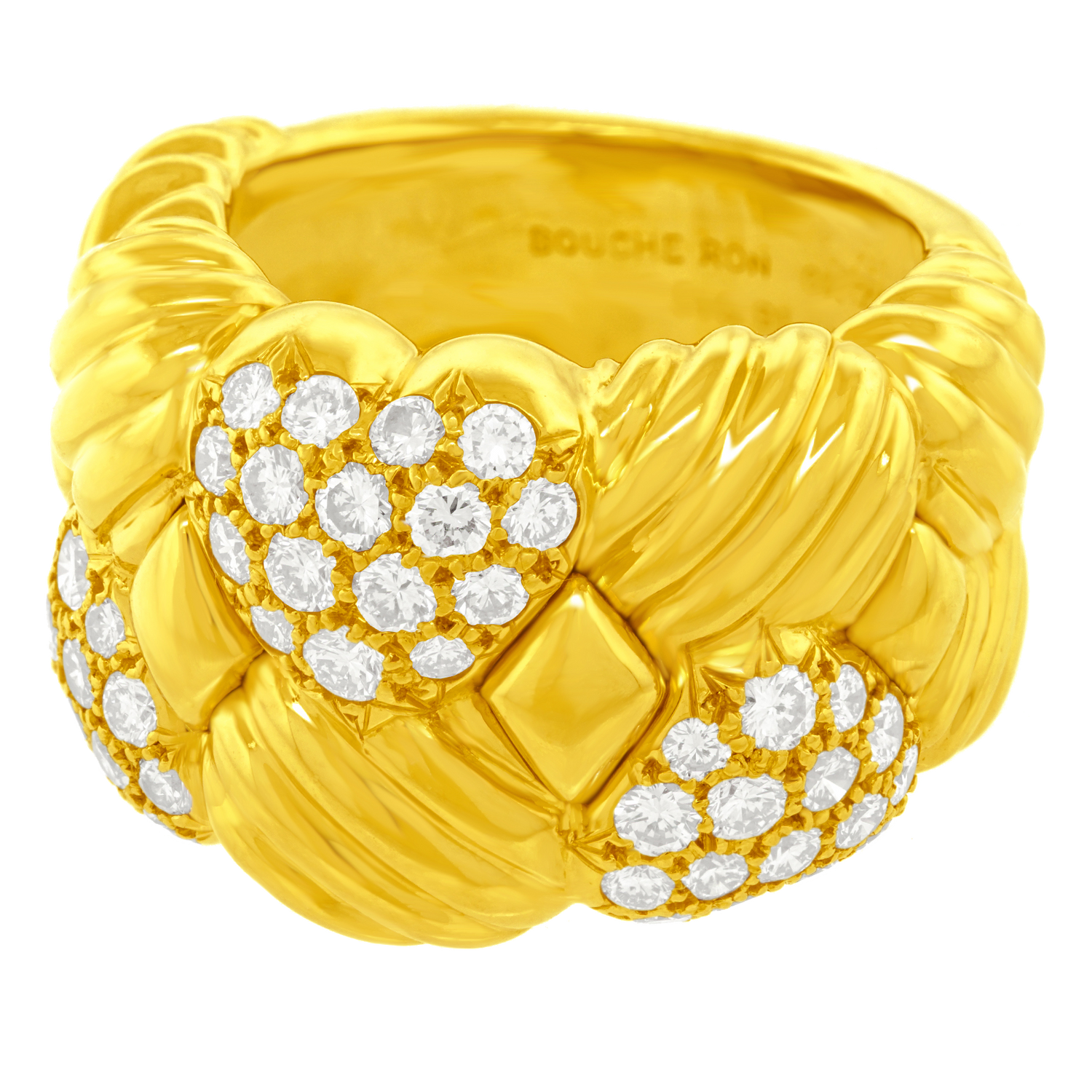 Circa 1970-80s, 18k, by Boucheron, Paris, France. This sublime diamond set yellow gold ring by the storied house of Boucheron features an understated heart motif. The look is sixties vintage French gold jewelry at its fashionable Parisian best. The chic Gallic narrative is underscored by 2.0 carats of superb white diamonds (F color, VS clarity). The ring is finely fashioned, substantial, and comfortable, all the qualities we expect from Boucheron. As an added bonus, this ring was actually made in Boucheron's own workshops (a rare occurrence). Excellent condition.