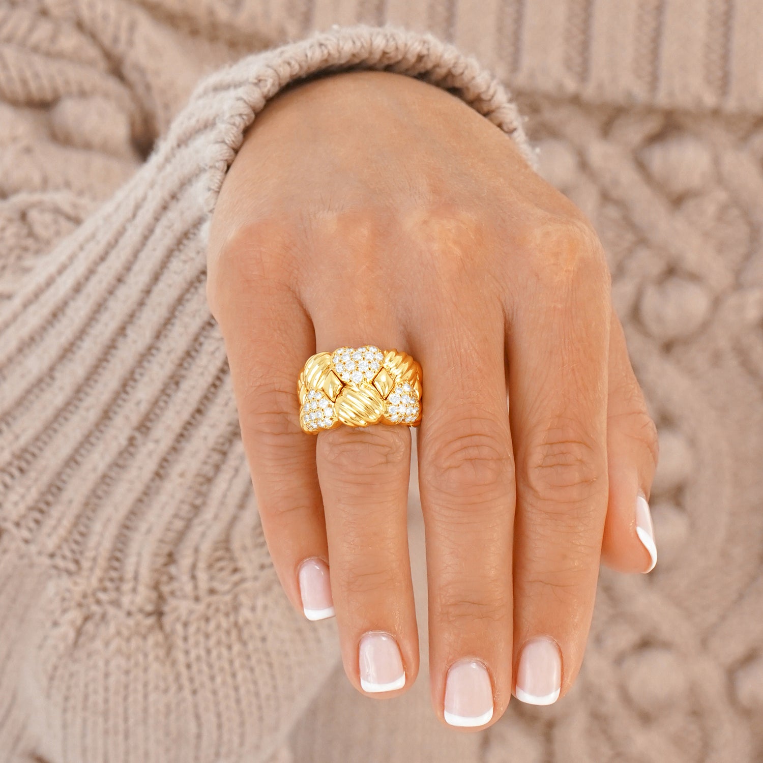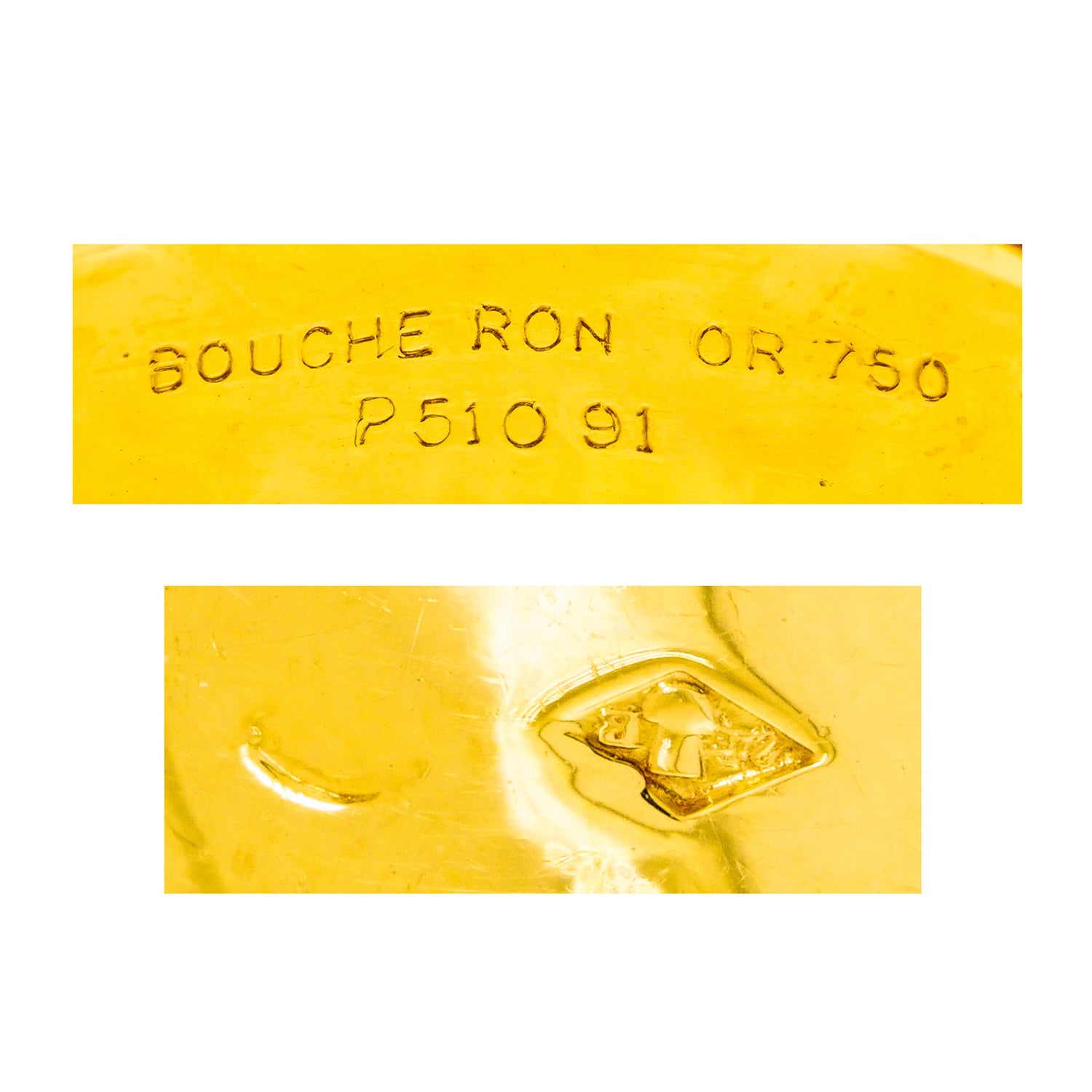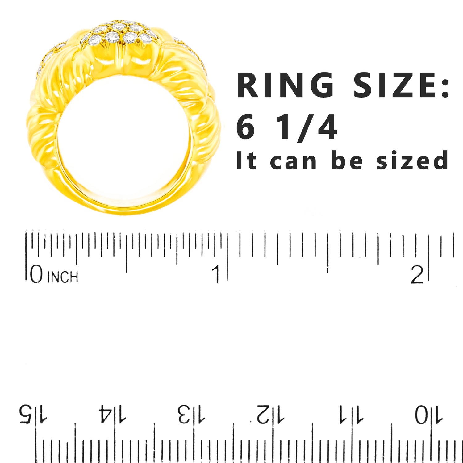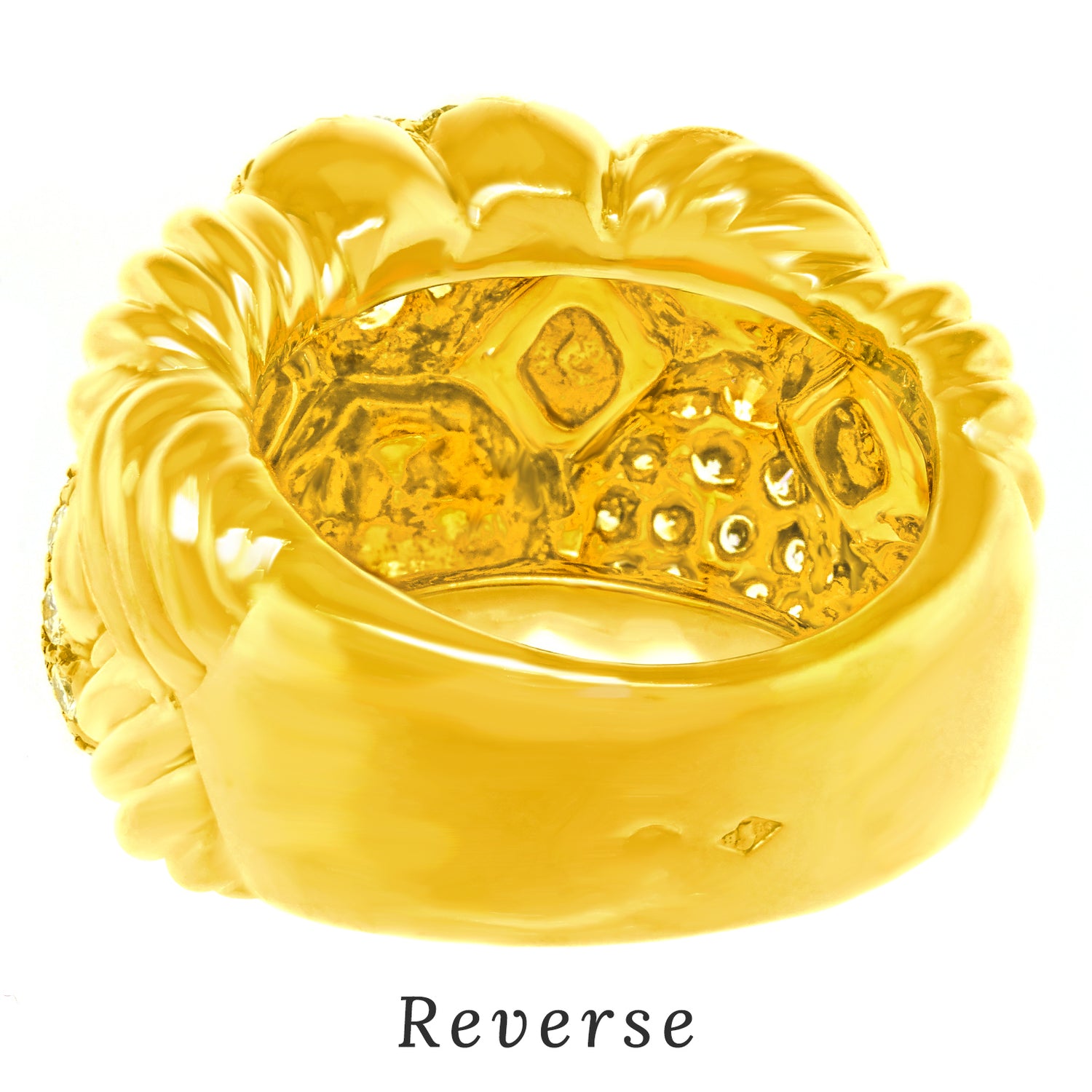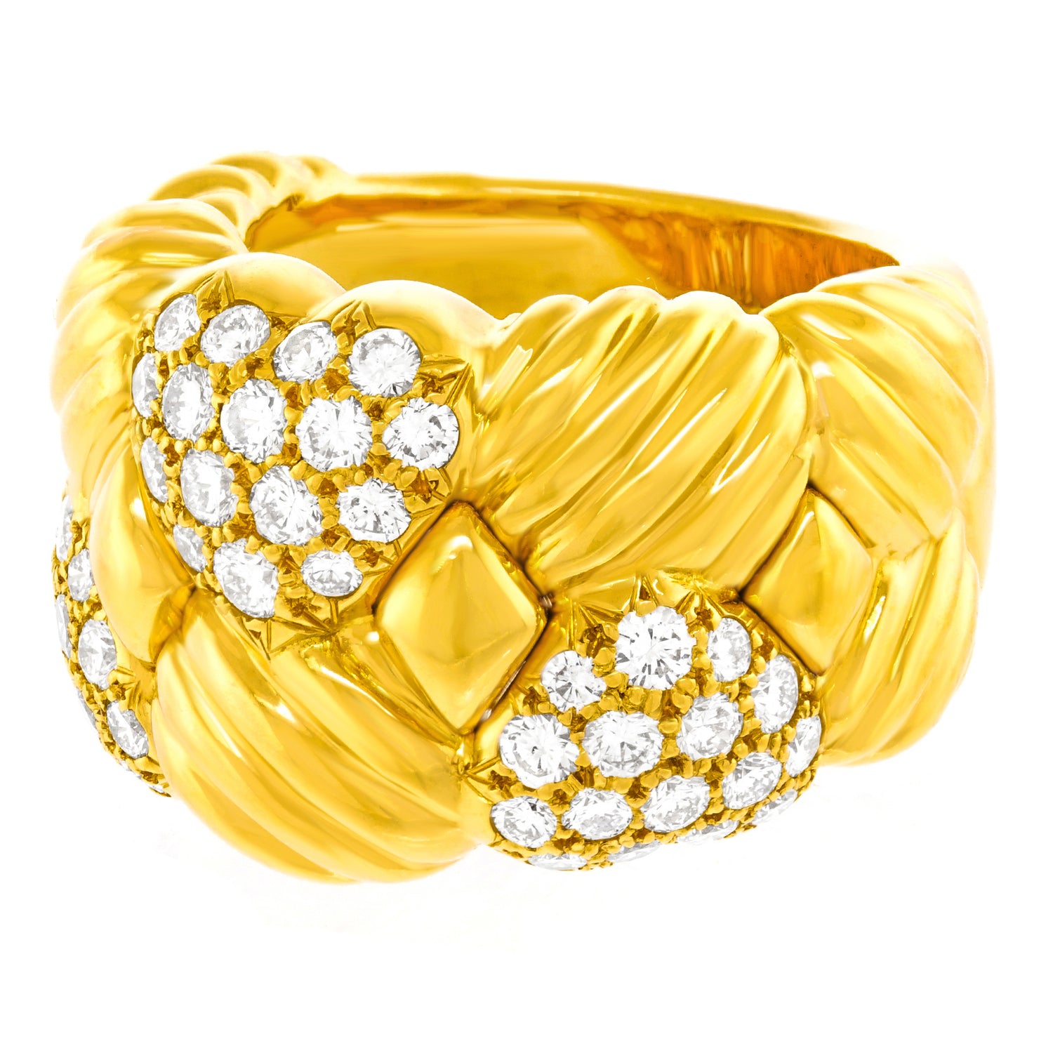 Circa 1970-80s, 18k, by Boucheron, Paris, France. This sublime diamond set yellow gold ring by the storied house of Boucheron features an understated heart motif. The look is sixties vintage French gold jewelry at its fashionable Parisian best. The chic Gallic narrative is underscored by 2.0 carats of superb white diamonds (F color, VS clarity). The ring is finely fashioned, substantial, and comfortable, all the qualities we expect from Boucheron. As an added bonus, this ring was actually made in Boucheron's own workshops (a rare occurrence). Excellent condition.