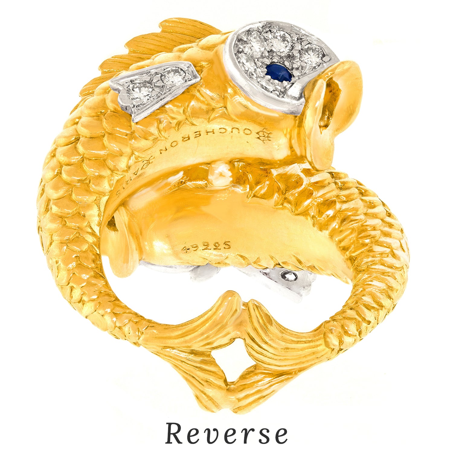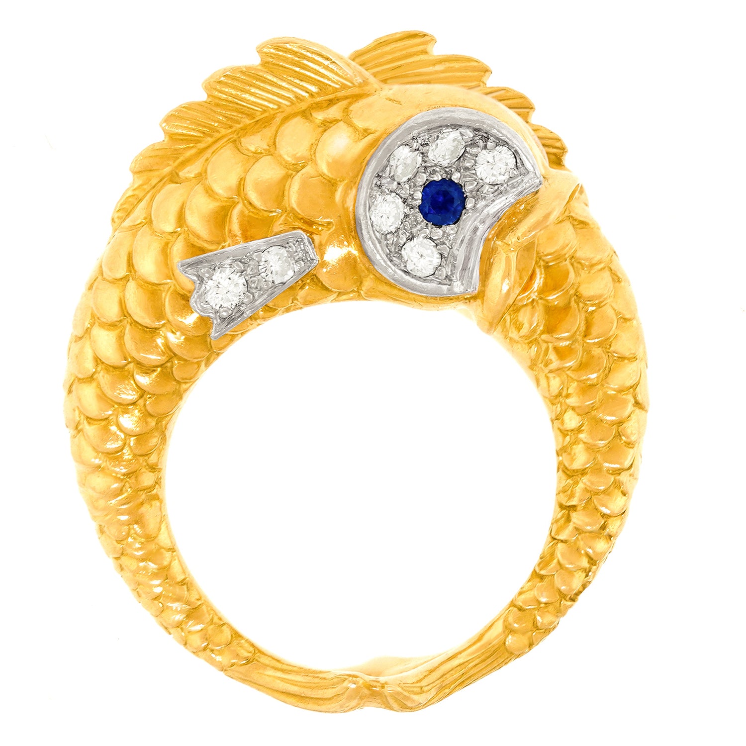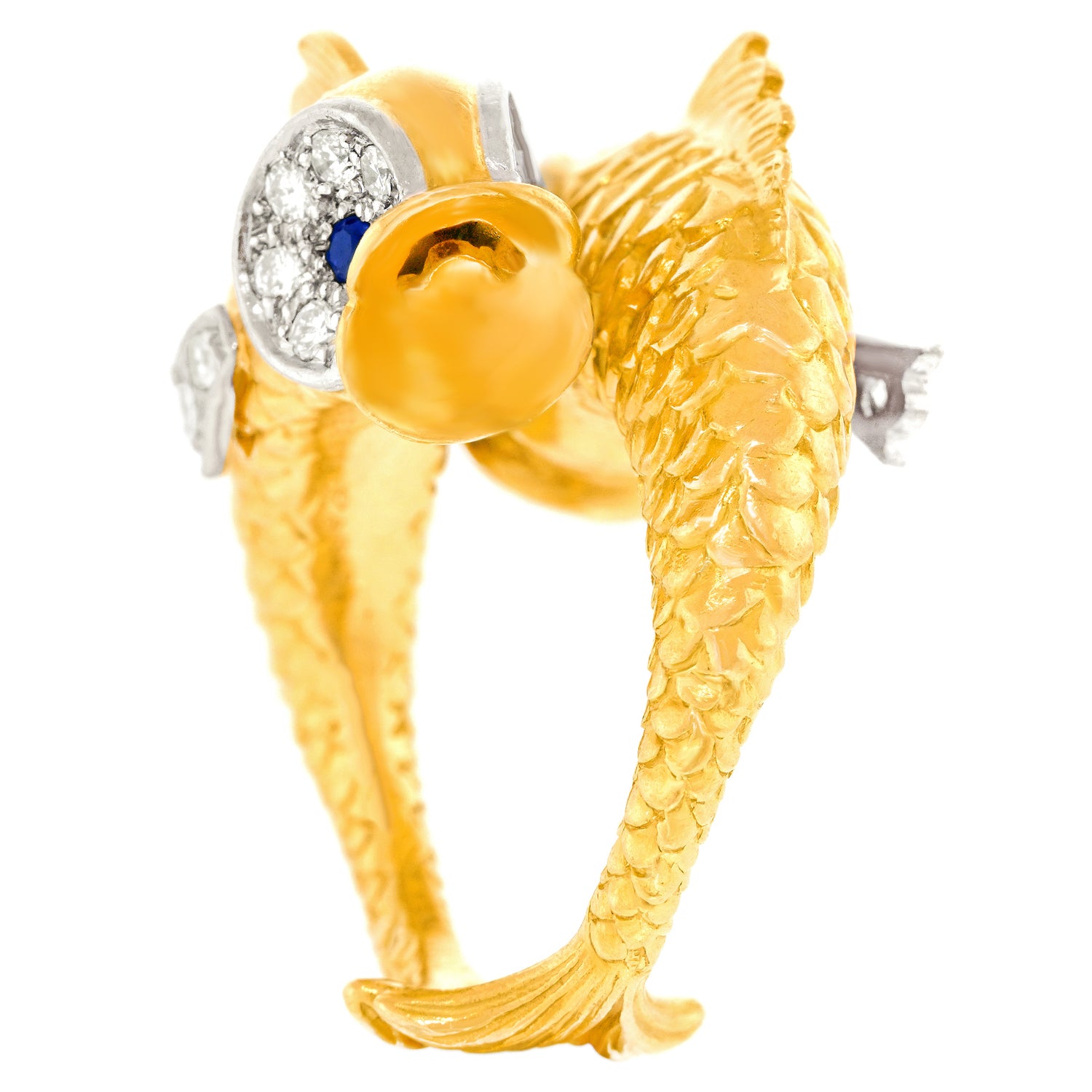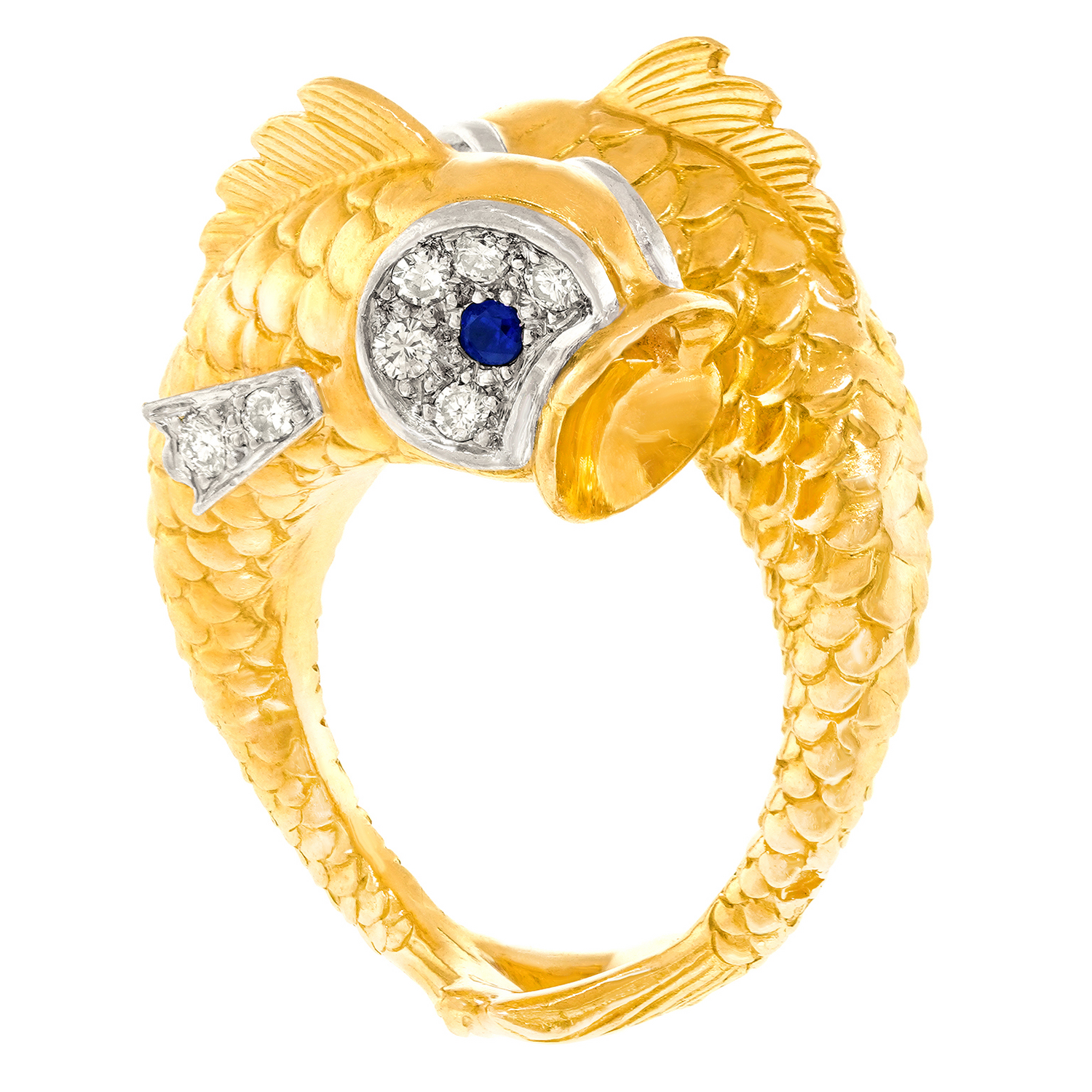 Circa 1960s, 18k and platinum, by Boucheron, France. Famous for their whimsical animal jewelry, Boucheron has crafted a double fish ring that is a complete joy! Two highly detailed fish set with .66 carats of fine white diamonds (G color and VS clarity) and sapphire eyes swim in opposite directions. Visually enchanting, every angle is a delight, from their fins to their touching tails! Excellent condition.