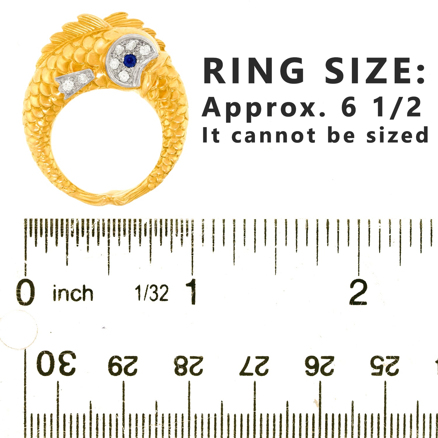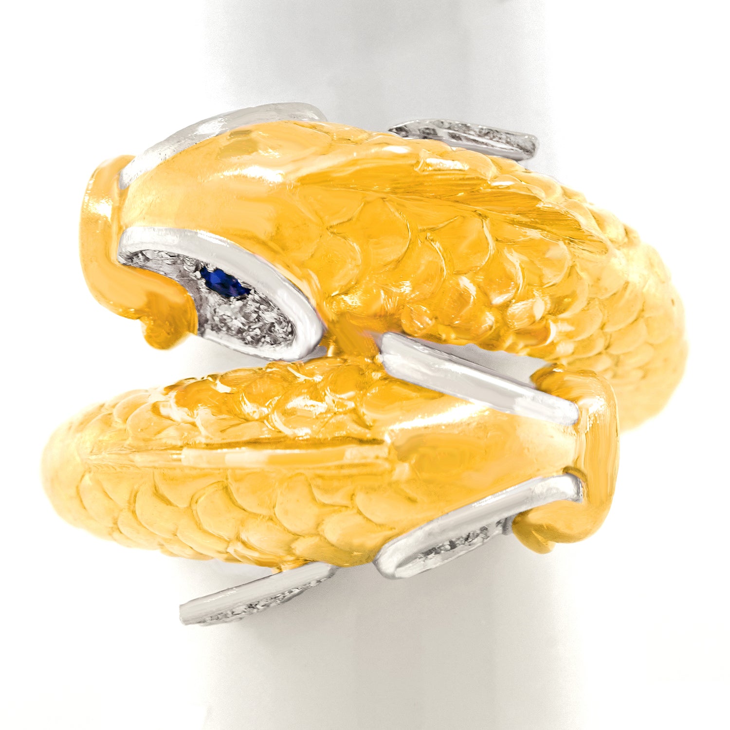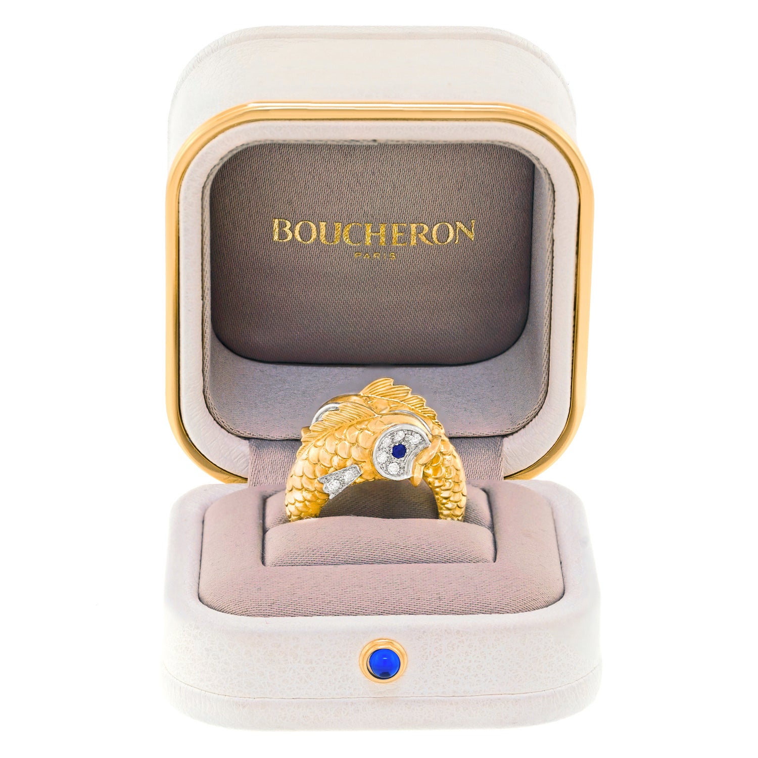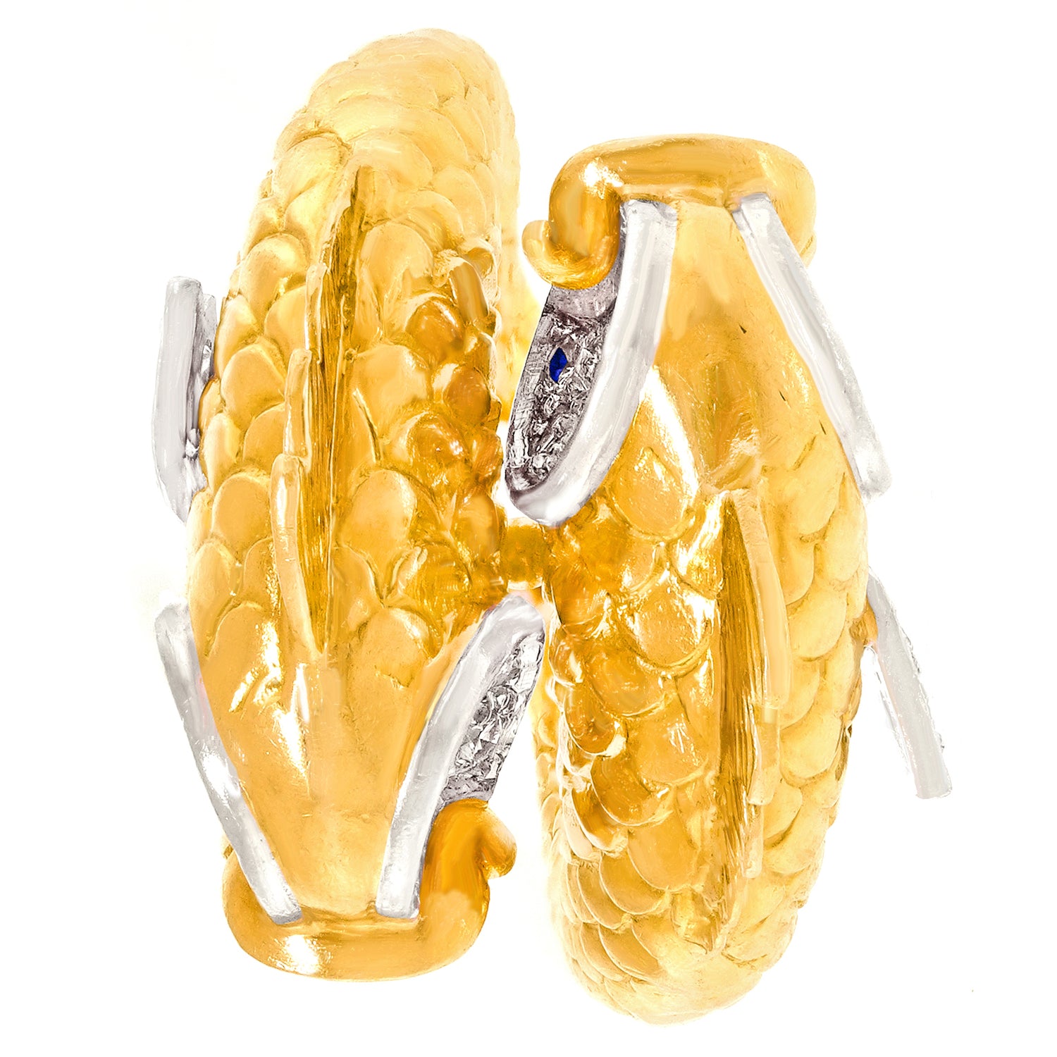 Circa 1960s, 18k and platinum, by Boucheron, France. Famous for their whimsical animal jewelry, Boucheron has crafted a double fish ring that is a complete joy! Two highly detailed fish set with .66 carats of fine white diamonds (G color and VS clarity) and sapphire eyes swim in opposite directions. Visually enchanting, every angle is a delight, from their fins to their touching tails! Excellent condition.