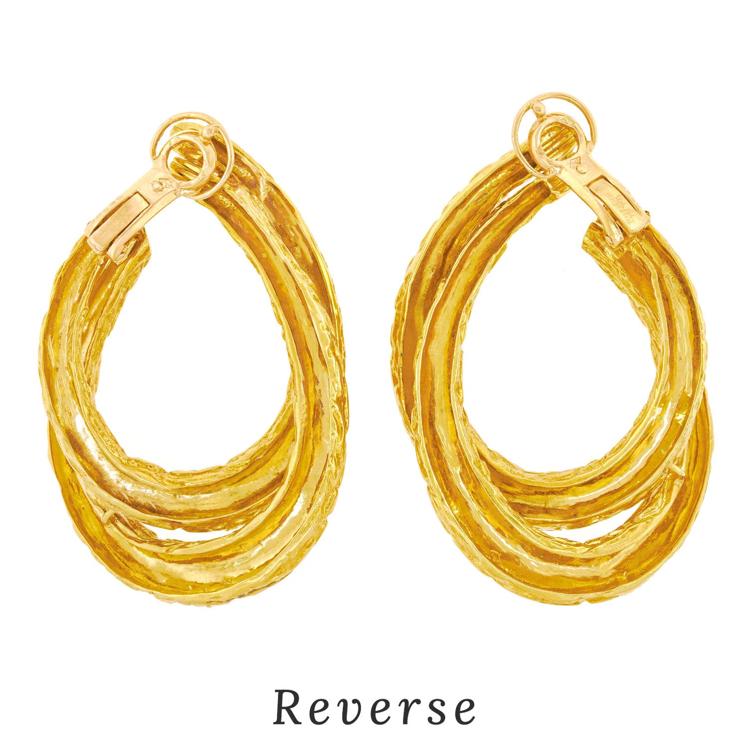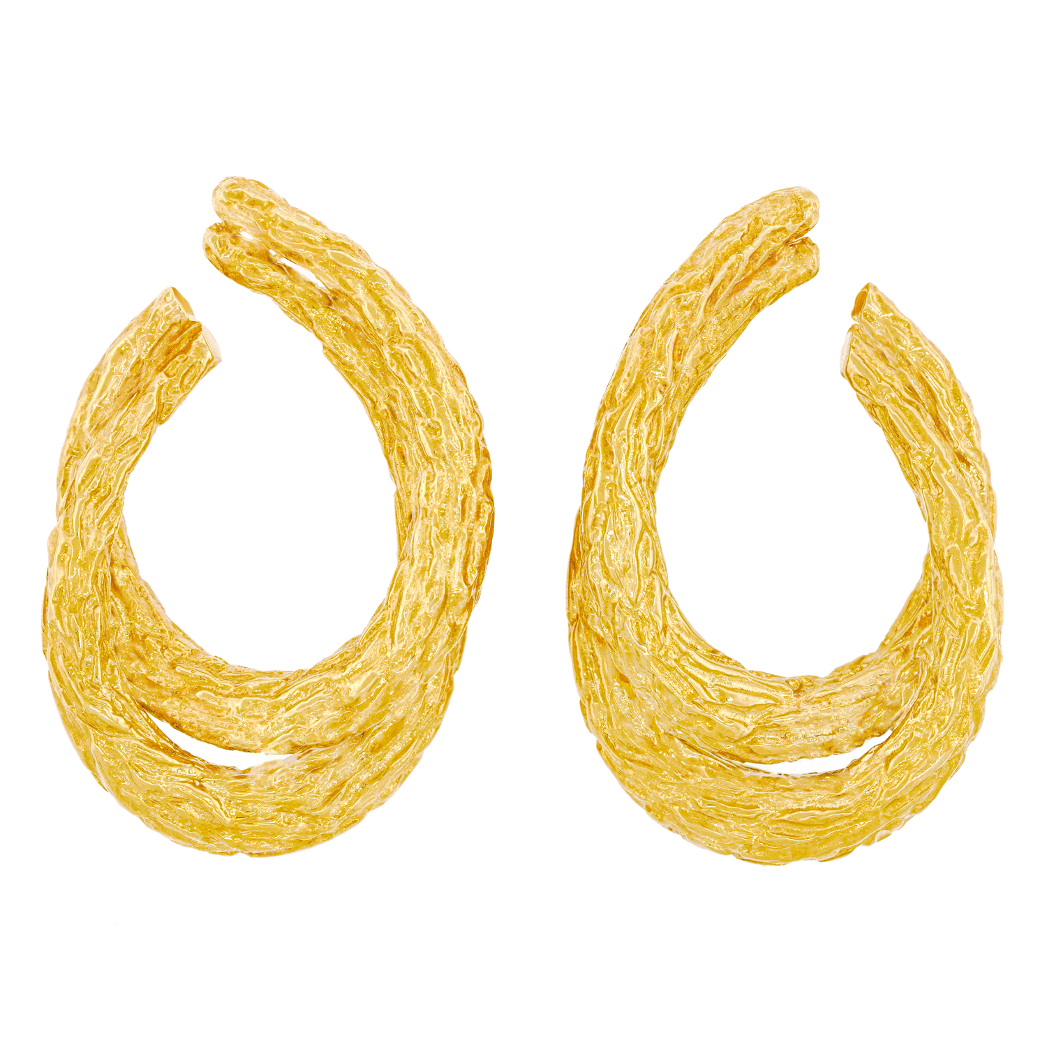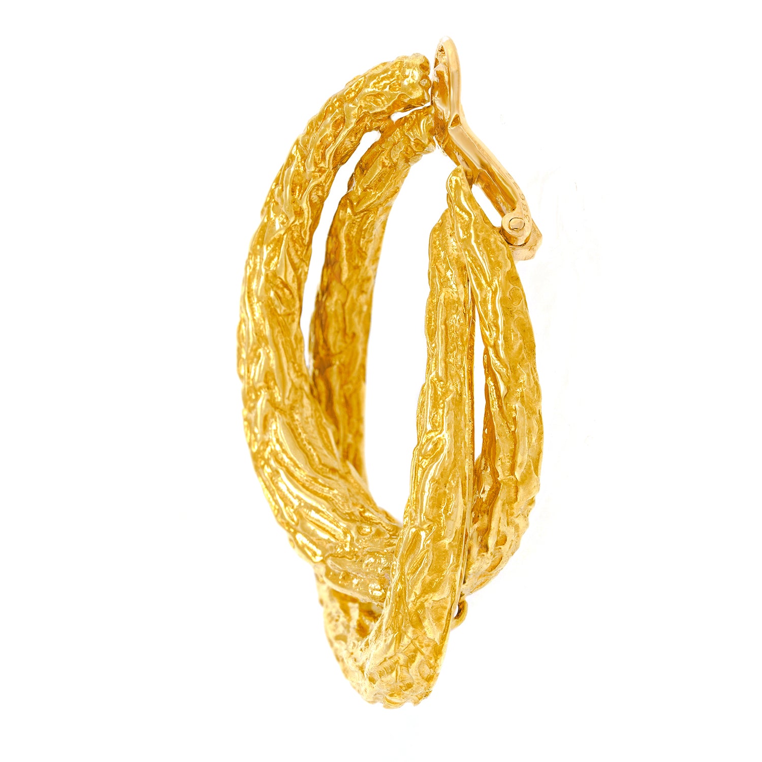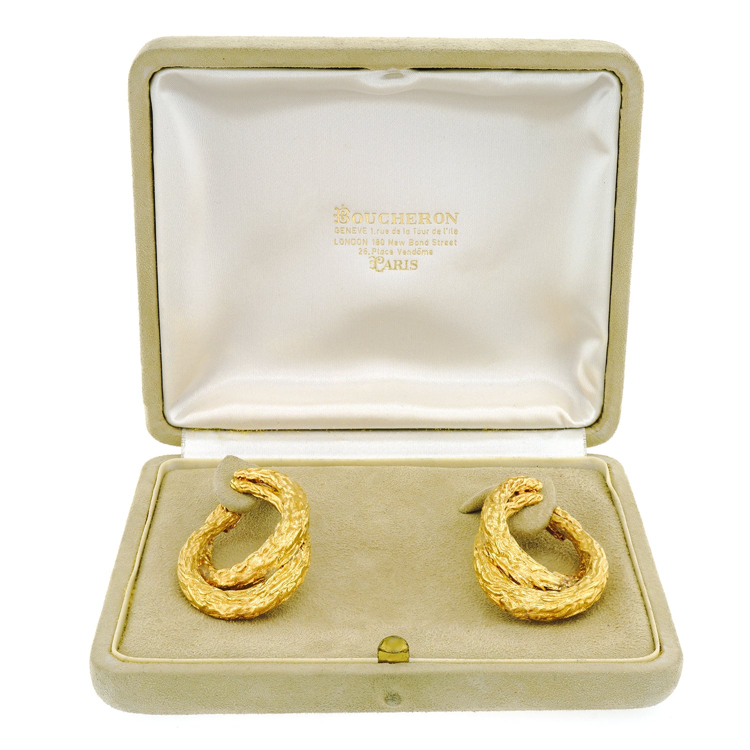 Circa 1970s, 18k, by Boucheron, Paris, France. Featuring organo-chic texture, a wonderful double hoop form, and epic size, these earrings are 18k yellow gold perfection. Boucheron, renowned for quality and style has been the cornerstone of Parisian jewelry fashion since 1858. Particularly fabulous, these versatile earrings effortlessly transition from day to night. They have a comfortable elegance that goes with everything.  Original box included.  Excellent condition.