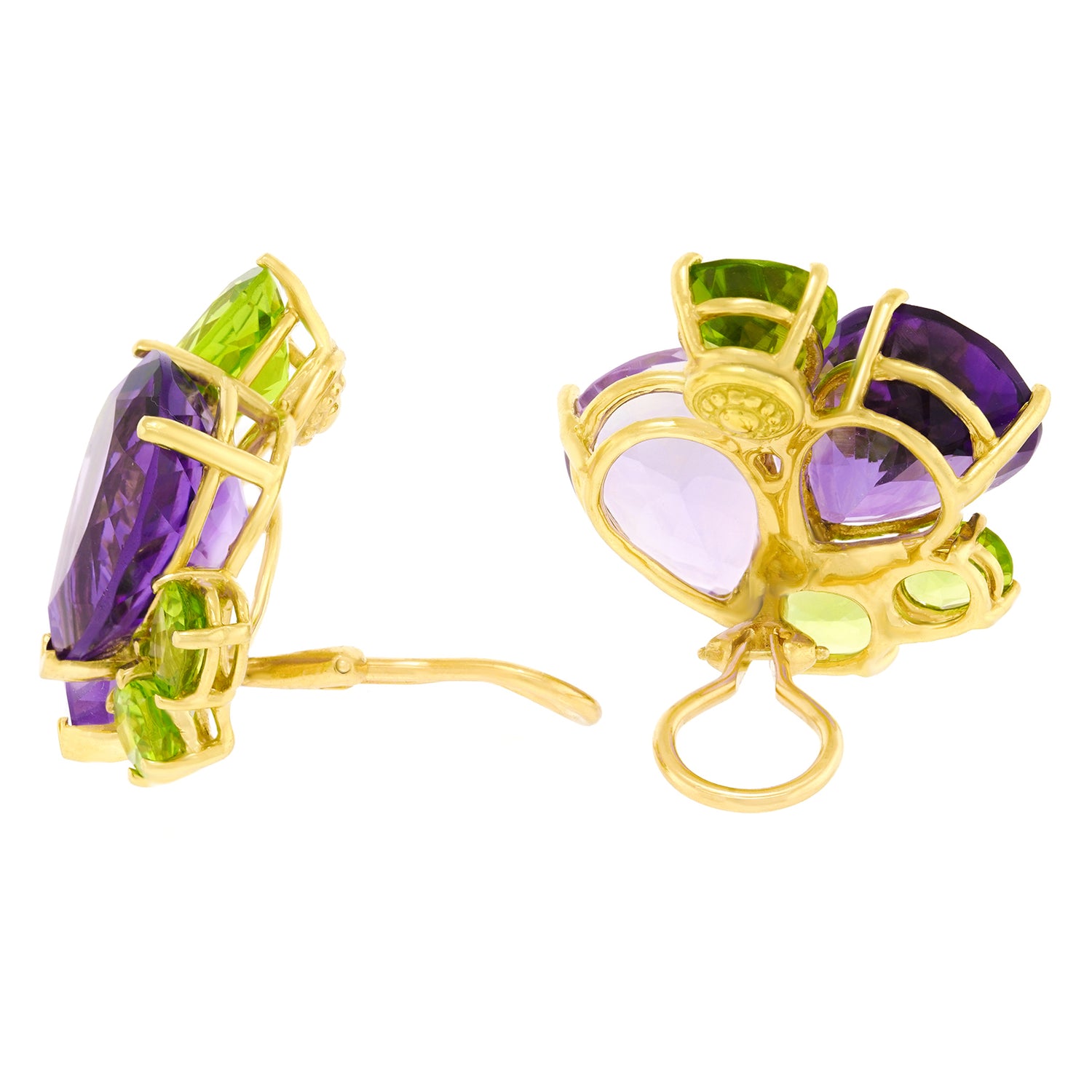 Circa 1980s, 14k, American.  Set with Amethyst, Rose-de-France, and Peridot these earrings have a charming style reminiscent of wildflowers. The leafy greens, soft lavender, and richly-hued amethyst beautifully complement one another. Quality construction throughout, these earrings are in excellent condition.