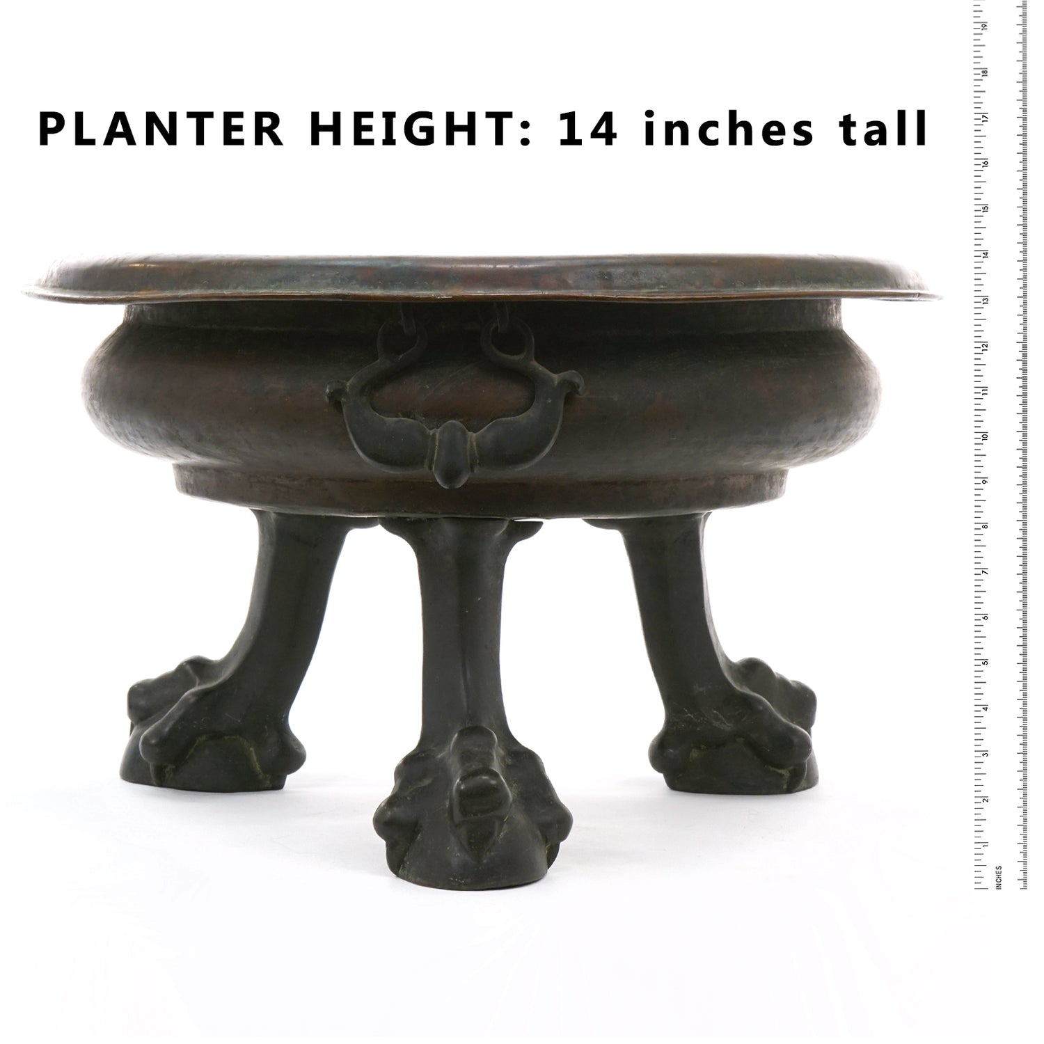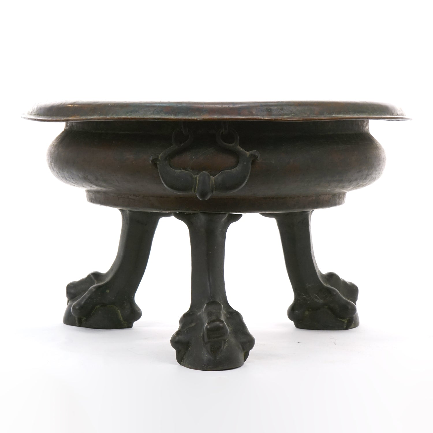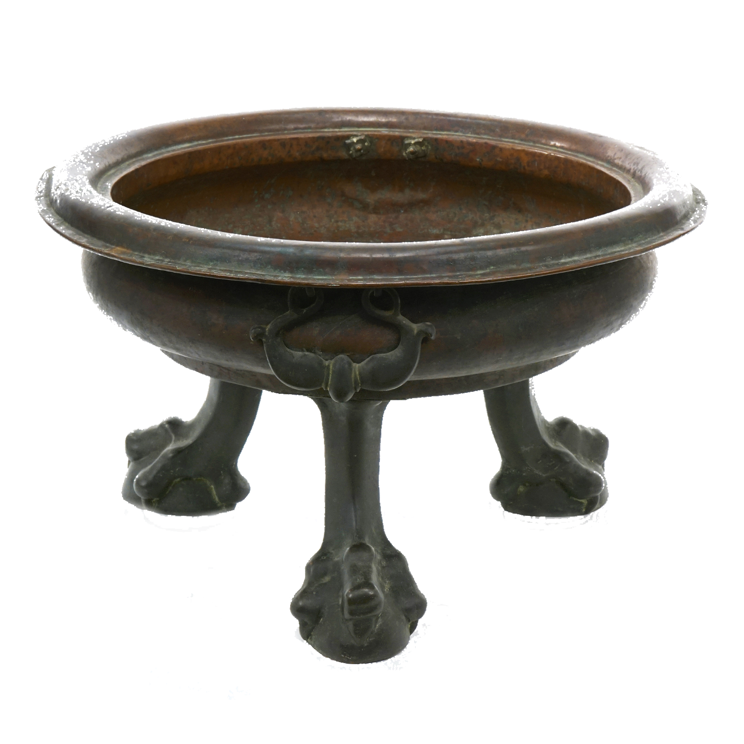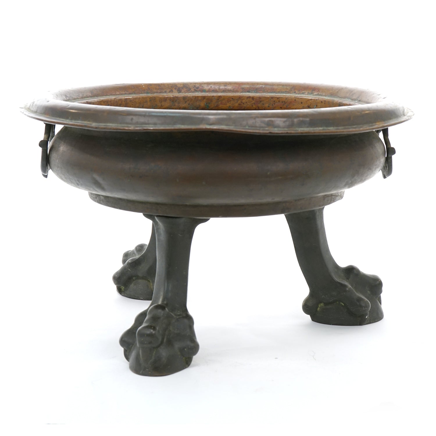 Circa 1820s, Straits Chinese, Copper and Bronze. This fabulous planter is perfect as a centerpiece or lined and pressed into service as a wine cooler. At 14 inches tall and 23 inches in diameter, it is an impressive size. The bowl is hand worked copper, and the feet cast bronze. The look is mythic meets modern! Perfect for any interior, it is in very good condition.