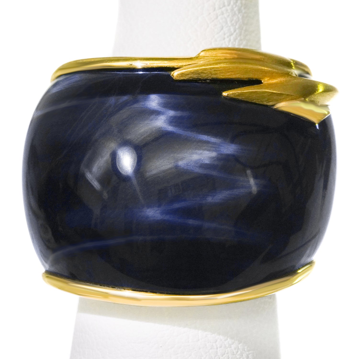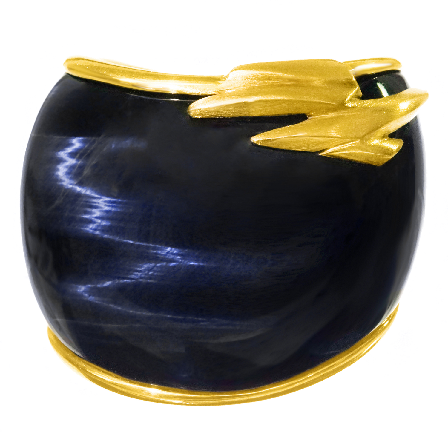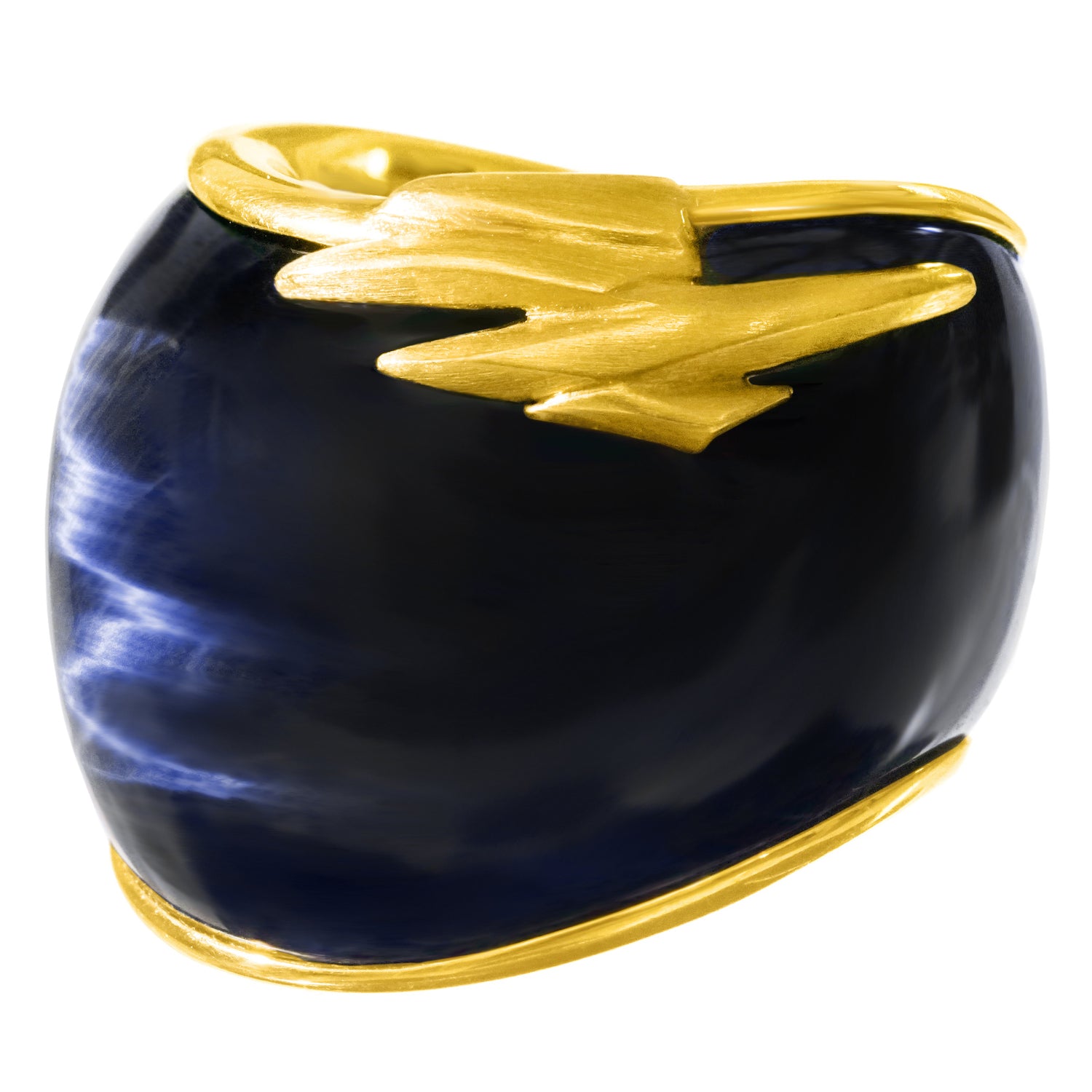 Circa 1990s, 18k, Swiss. This large Brutalist-style ring is all about abstract form, color, and shimmer. The deep blue labradorite is rife with flashes of light like sunshine on water and the gold work is reflectively abstract. This one-of-a-kind ring will become part of your signature style, a perfect goes-anywhere go-to! Handmade, it is in excellent condition.