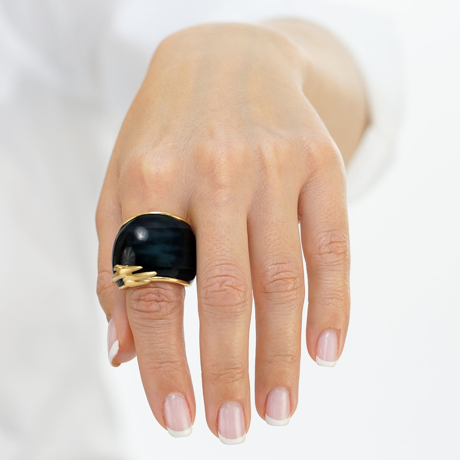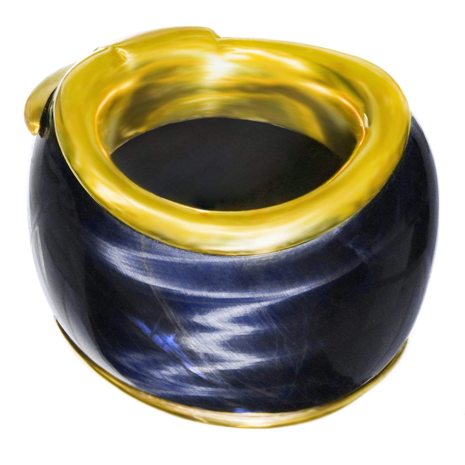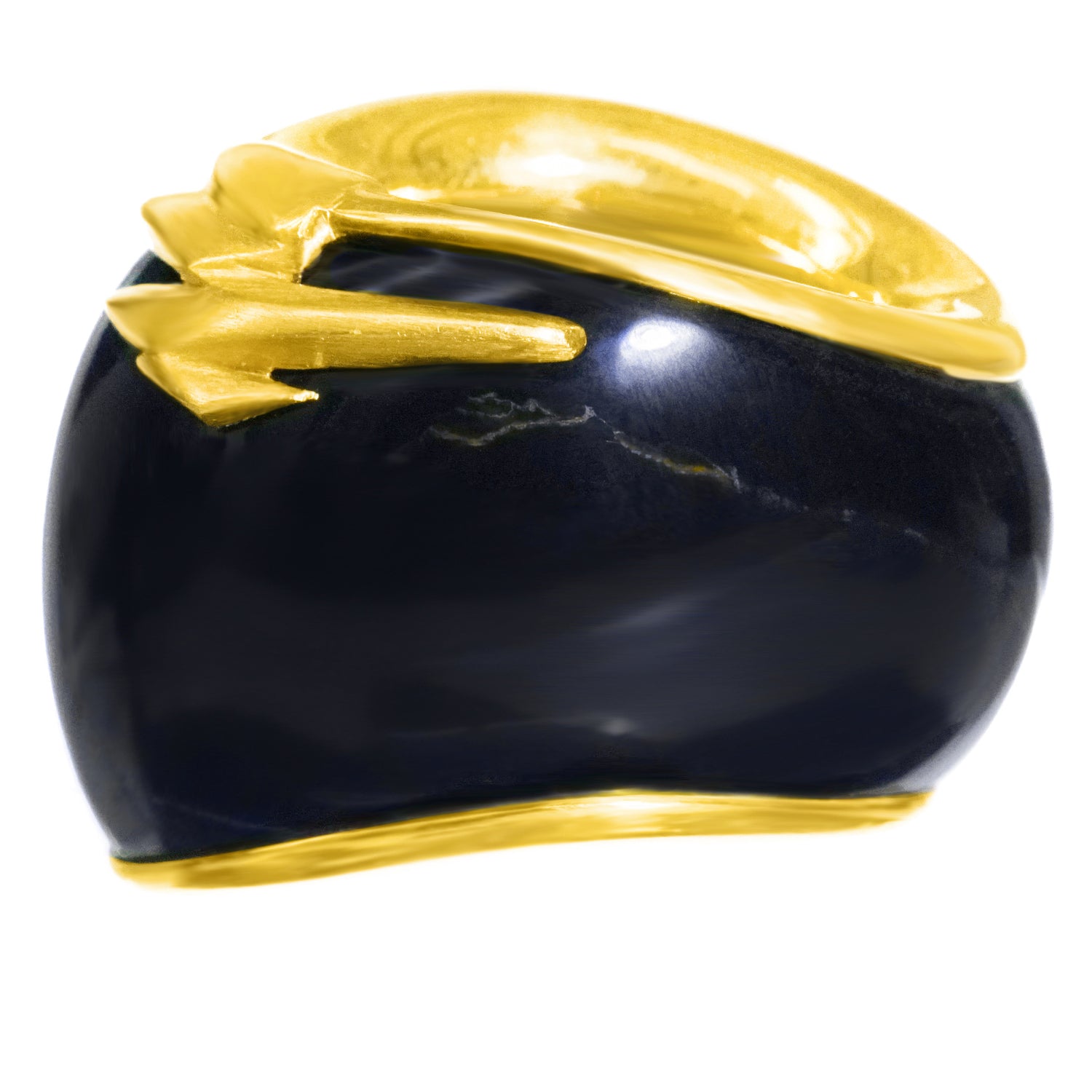 Circa 1990s, 18k, Swiss. This large Brutalist-style ring is all about abstract form, color, and shimmer. The deep blue labradorite is rife with flashes of light like sunshine on water and the gold work is reflectively abstract. This one-of-a-kind ring will become part of your signature style, a perfect goes-anywhere go-to! Handmade, it is in excellent condition.