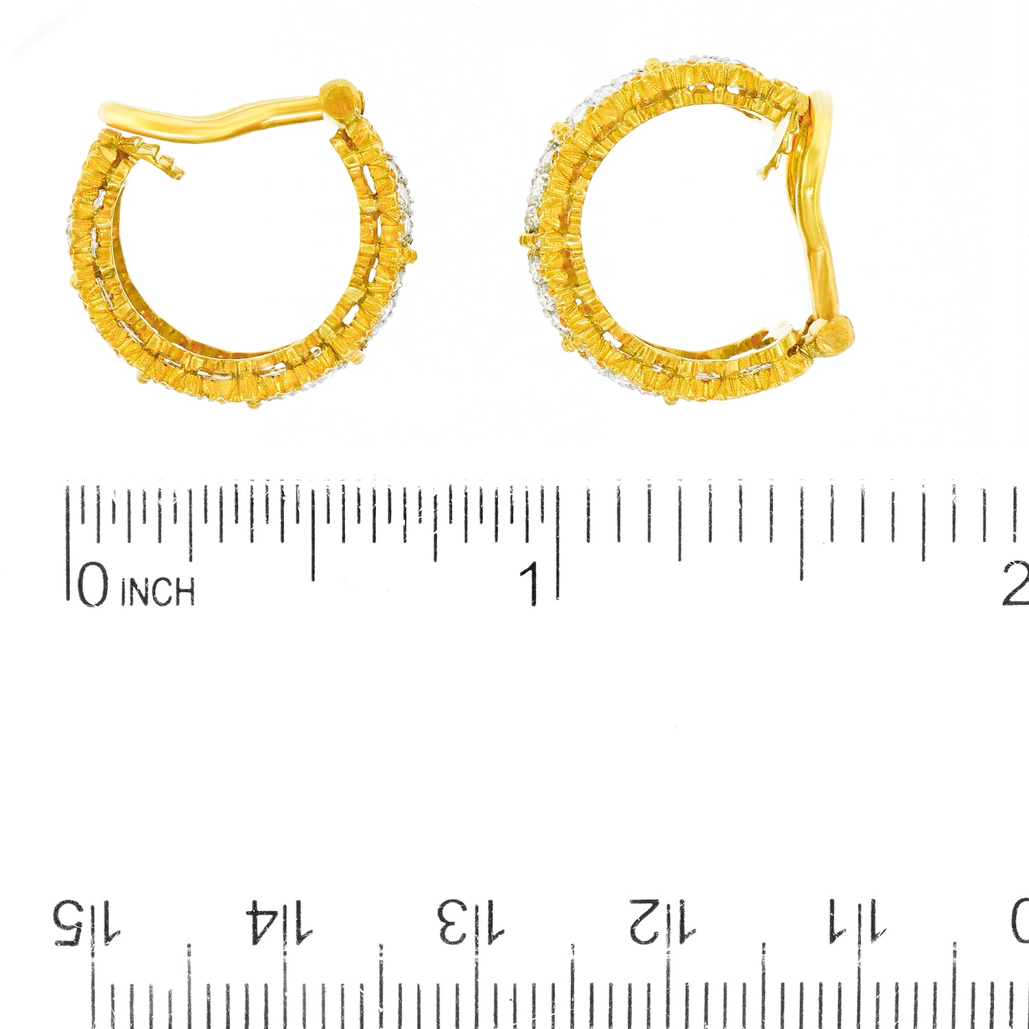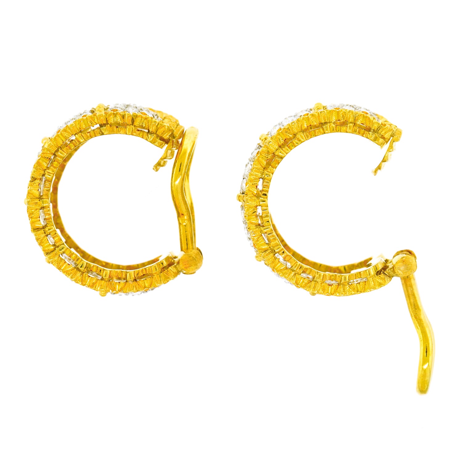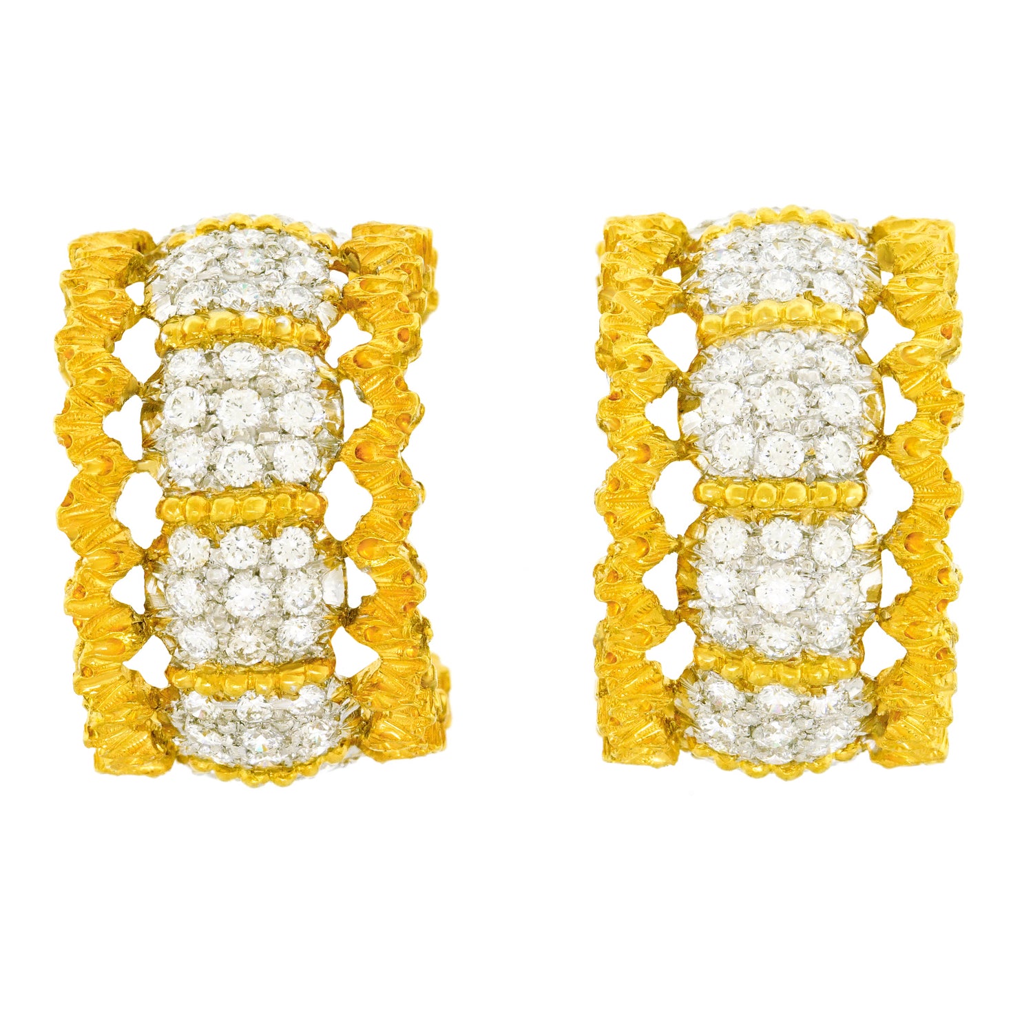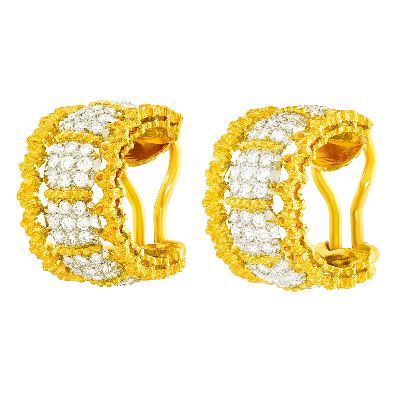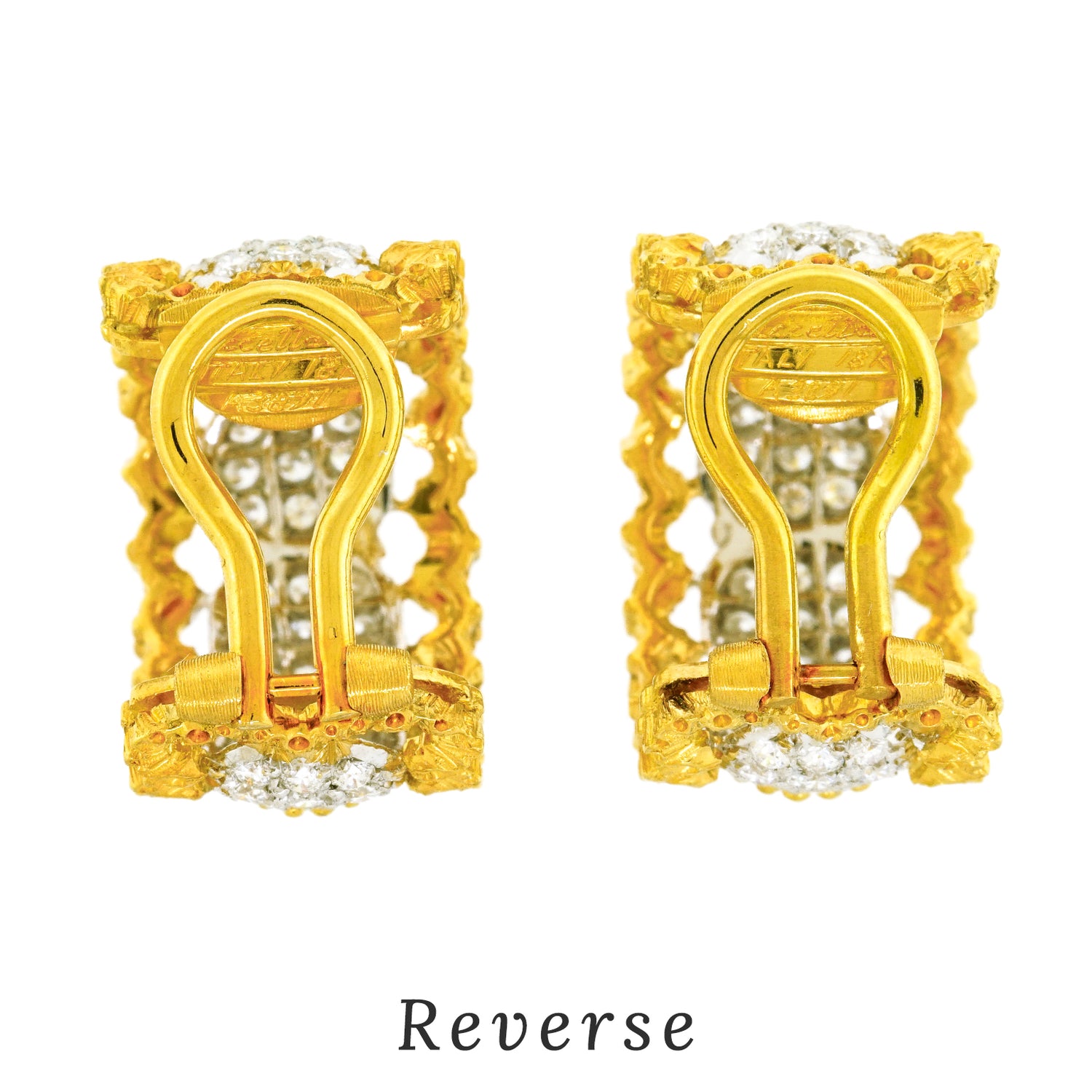 Circa 2000s, 18k, by Buccellati, Italy.     Blending superlative old-world craftsmanship with modern design, Buccellati is renowned for quality and style. These iconic 18k yellow and white gold earrings are set with 1.40 carats of brilliant white diamonds (G color, VS clarity). Perfect for any moment of fashion, they are completely handmade. Excellent condition.