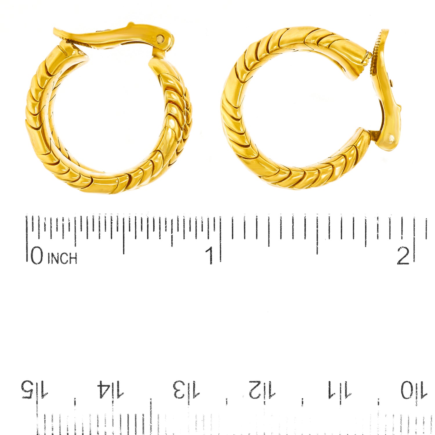 Circa 1980s, 18k, by Bvlgari, Italy. The very embodiment of chic, these Bvlgari Spiga earrings in all yellow gold will elevate any moment of fashion. Rooted in the brand's heritage of iconic designs, the look is effortless Italian. Impeccably made and displaying the quality that Bvlgari is famous for, these earrings are in excellent condition.