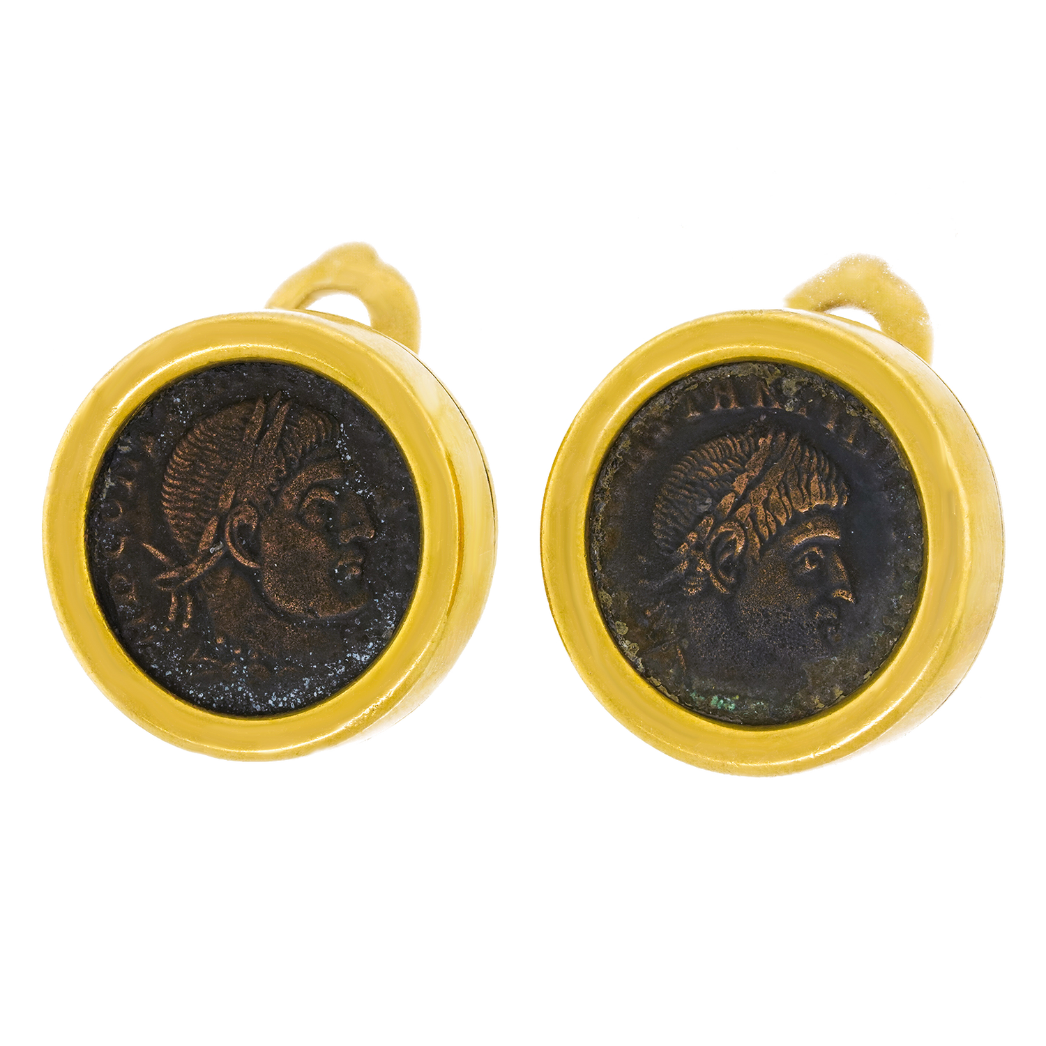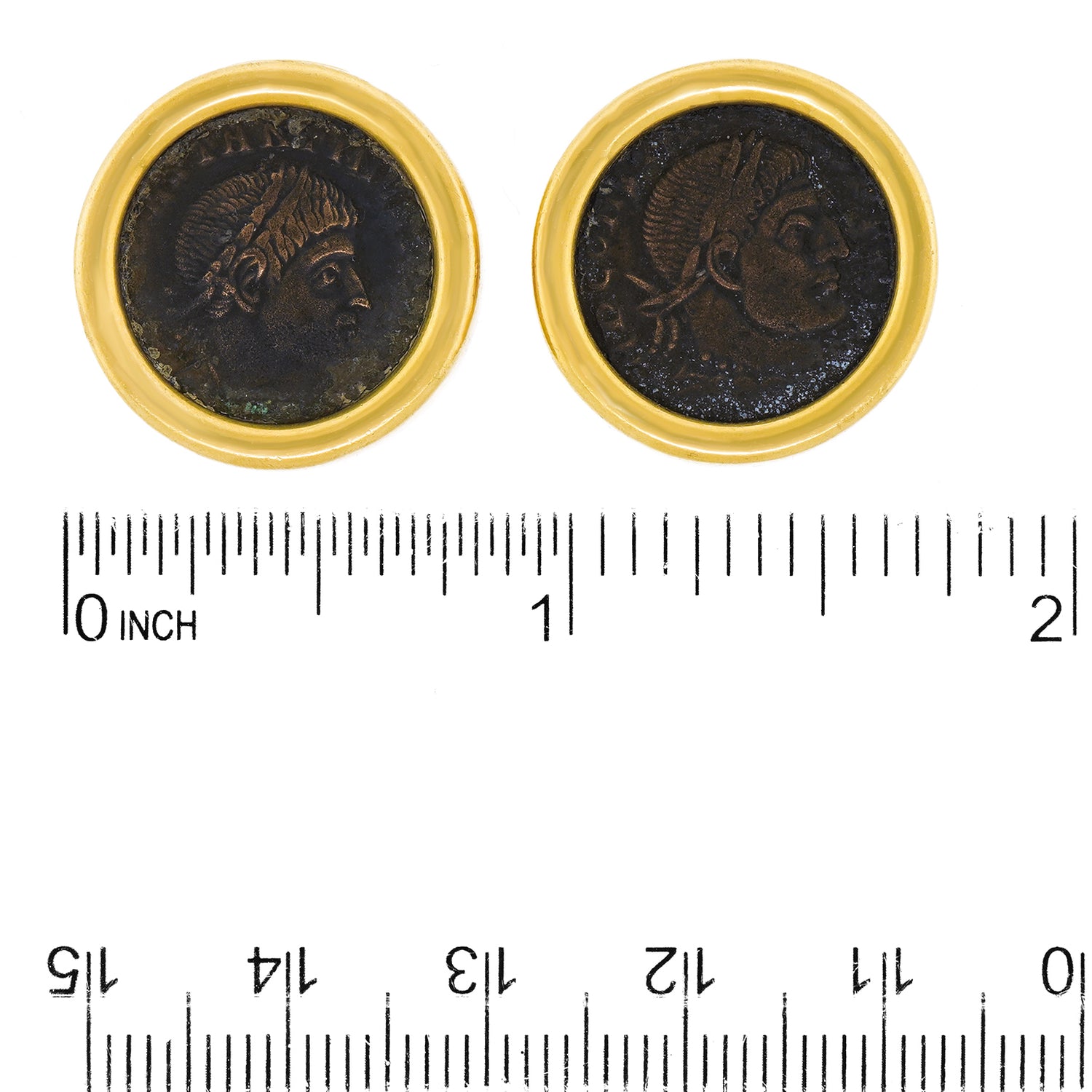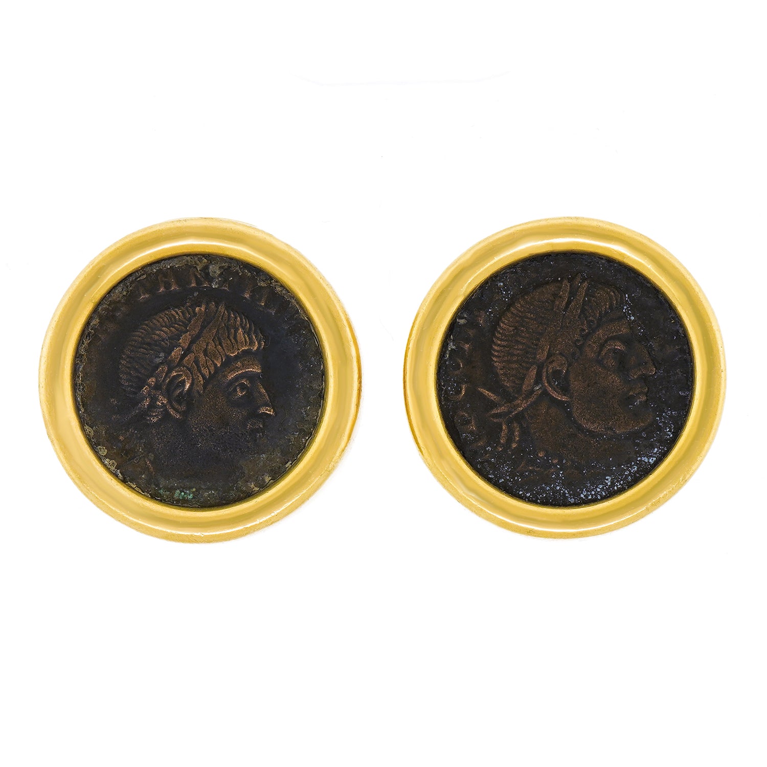 Circa 1970s, 18k, attributed to Bvlgari, Italy. These classic Bvlgari earrings are set with coins featuring Emperor Constantine dating from 306-307 AD. Framed in eighteen-karat gold, they are the ultimate in everyday chic. Well made and in excellent condition.