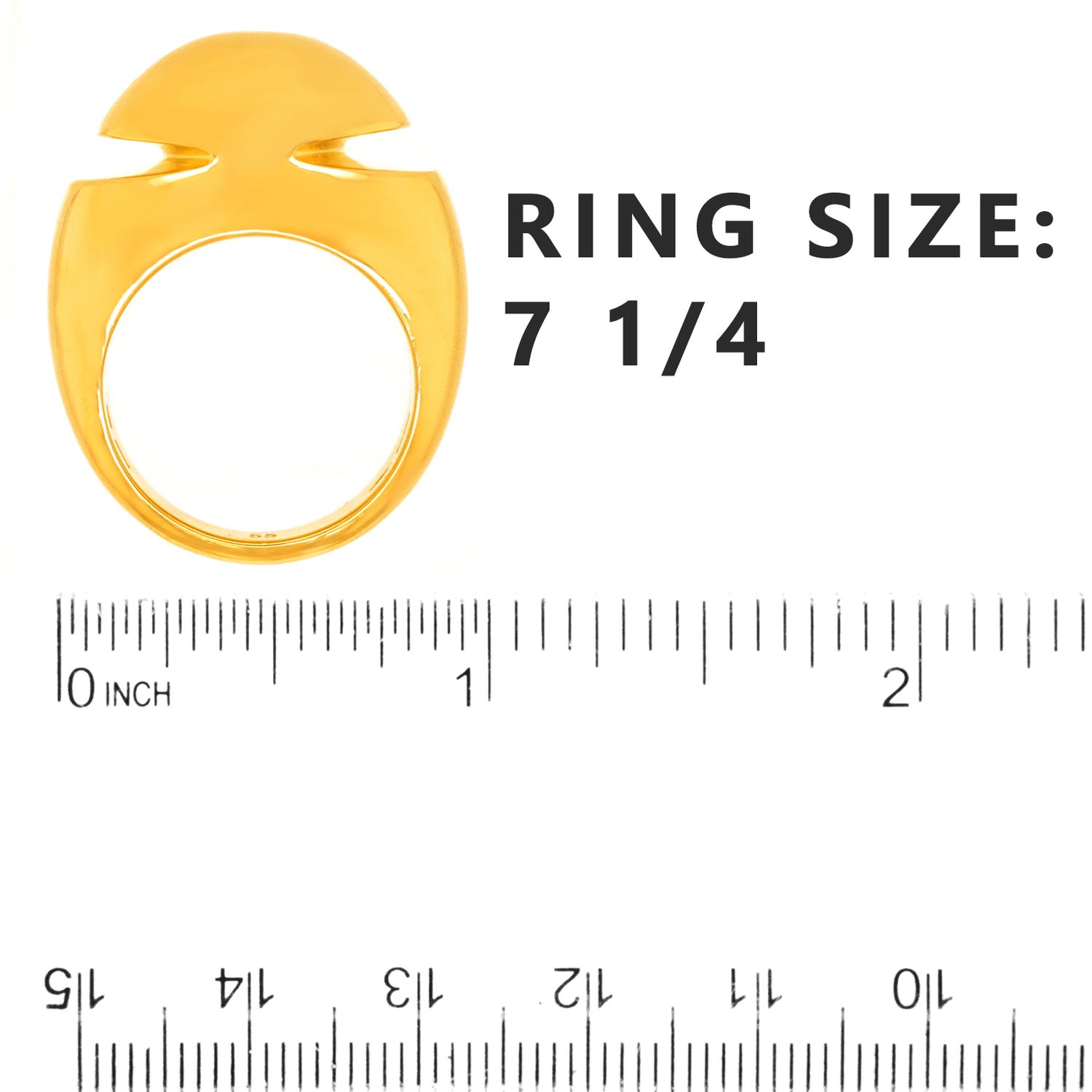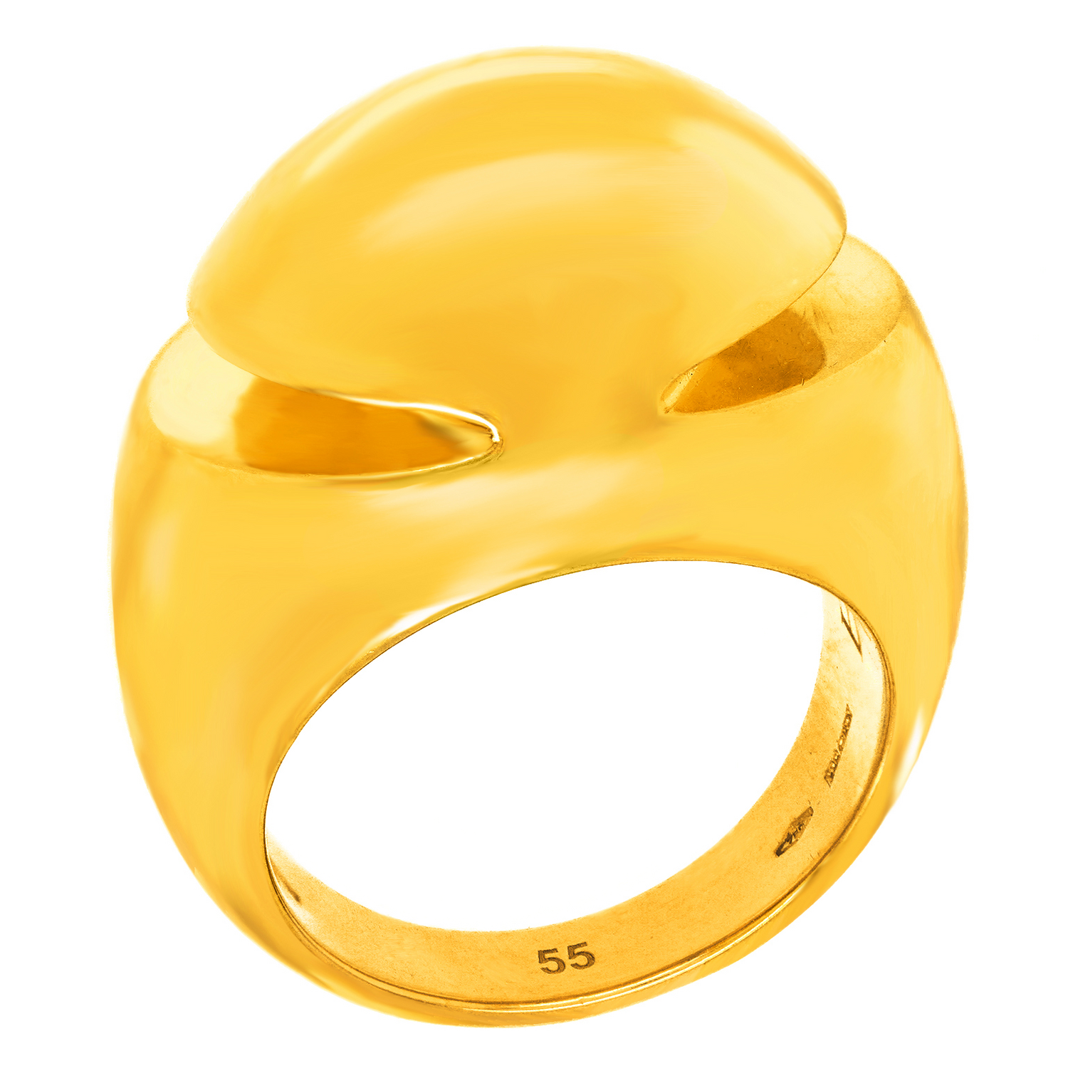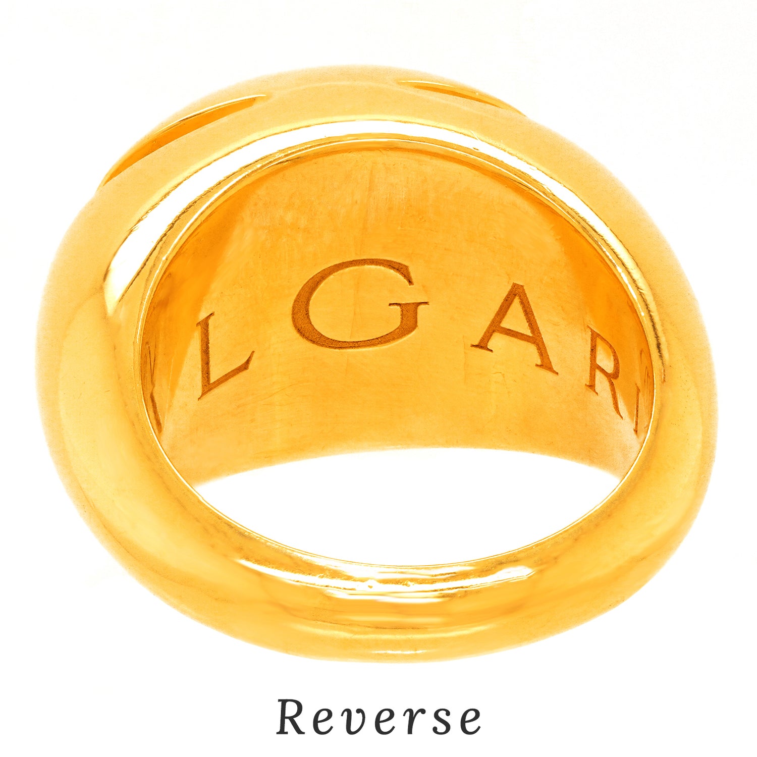 Circa 2000s, 18k, by Bvlgari, Italy. Count on Bvlgari to make it chic! Count on Bvlgari to make it cool! This heavy 18k yellow gold ring is all about sleek curves and crisp angles. Effortless, it is a visually enticing piece of wearable art. Excellent condition.