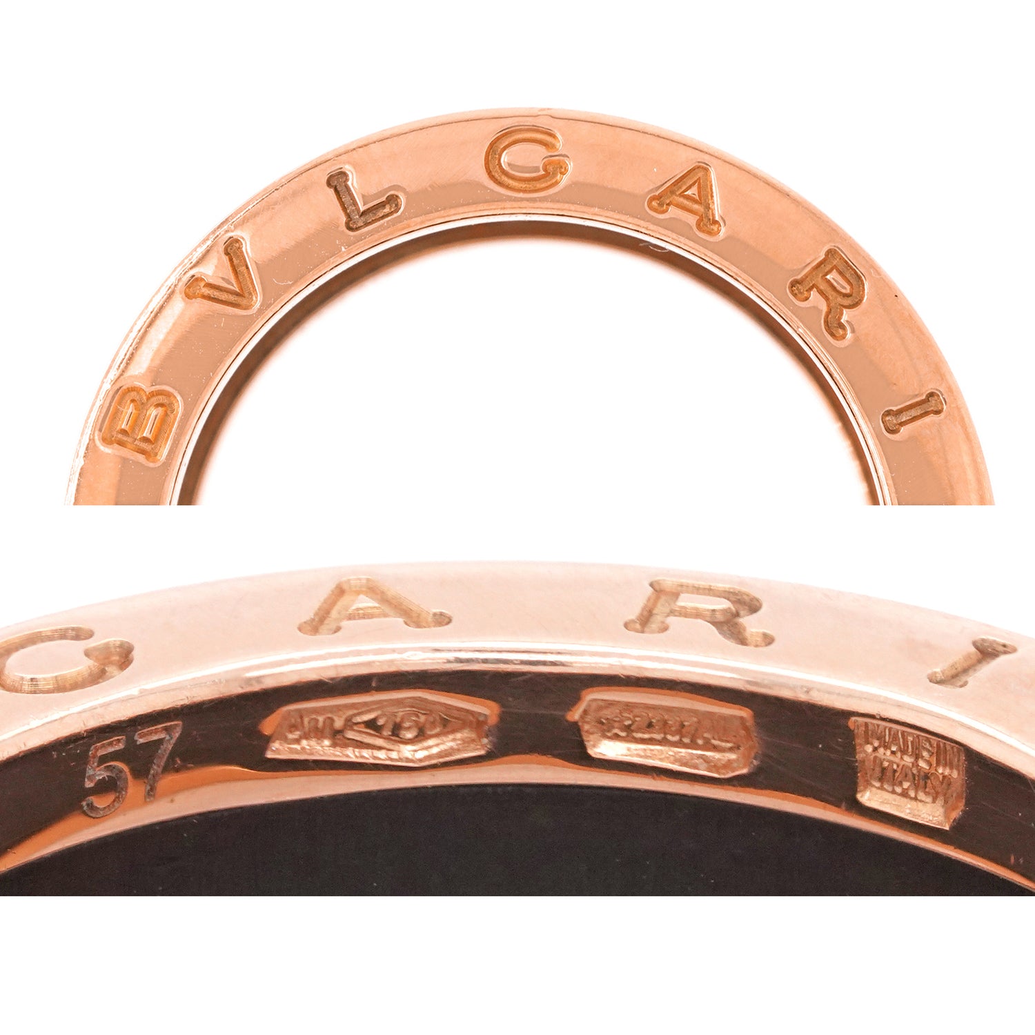 Hallmarks: 57, au 750 for 18k, Made in Italy, Italian Workshop Registration Number, CLKLL3, and BVLGARI