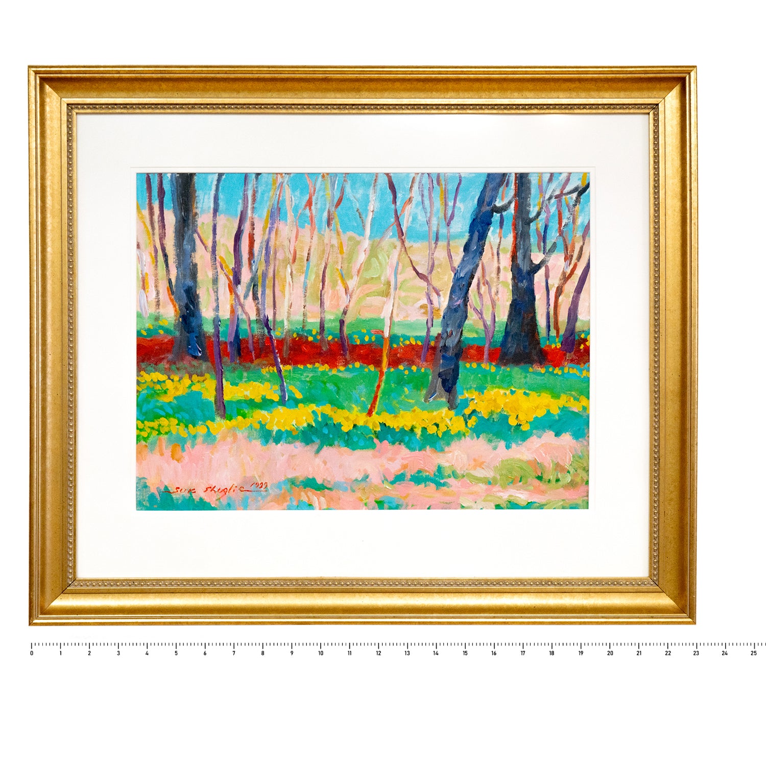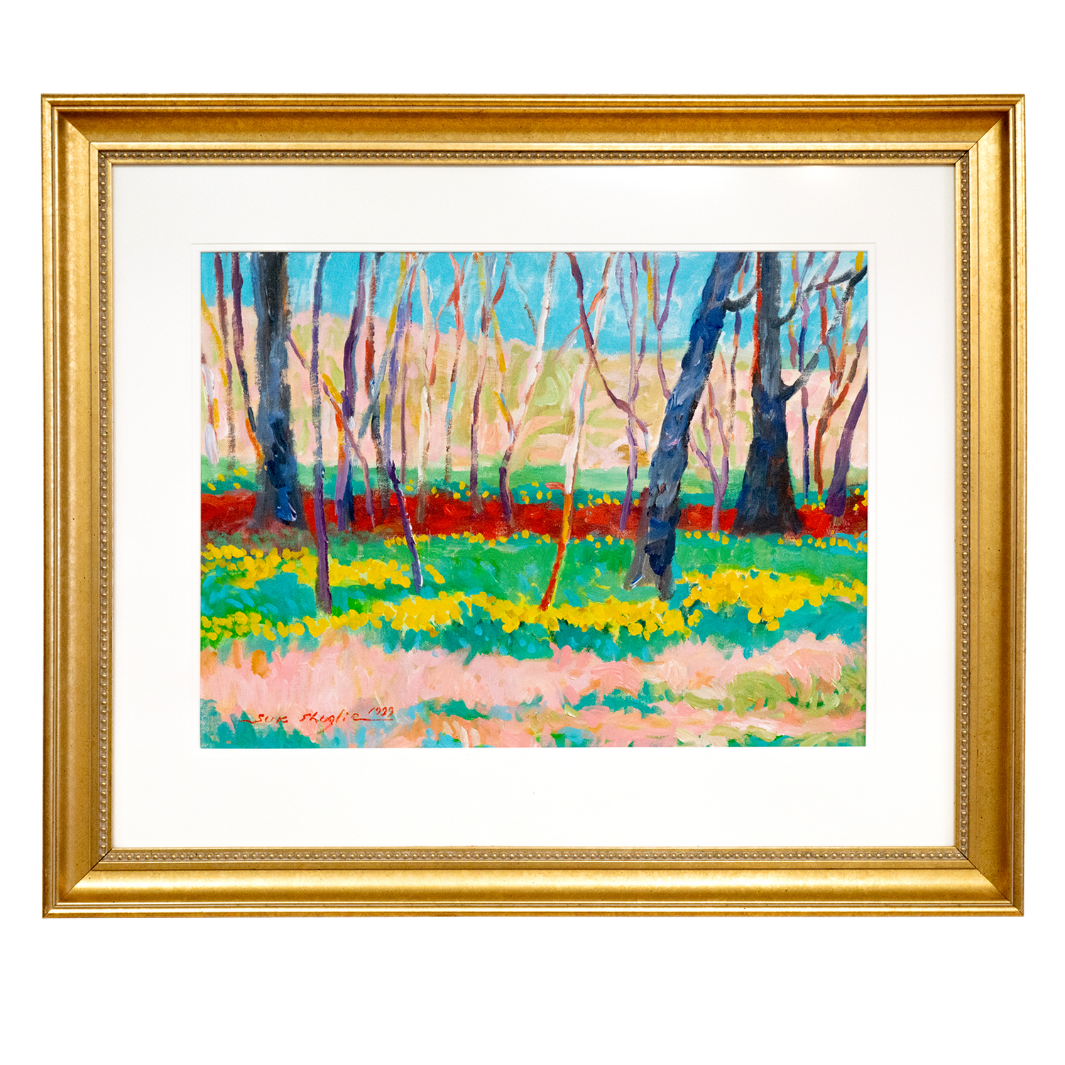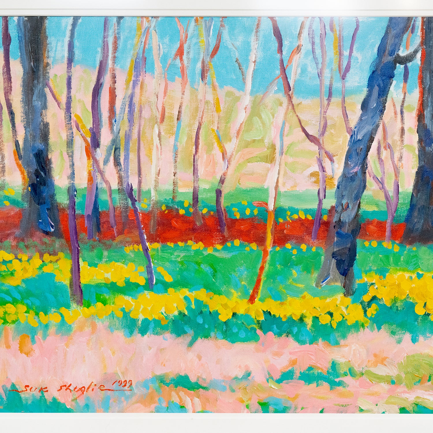 Circa 1999, Acrylic on "Canvas on board", by Suk Shuglie,  Pennsylvania.   Colorful and bright, this wooded scene leavens the moodiness of late Winter with the arrival of Spring. Pennsylvania artist Suk Shuglie has titled this painting "Spring trees". Born on a farm in rural Korea, Suk Shuglie came to America in 1980 where she studied and painted with distinction, earning regional and international recognition for her work. A larger example of her work, this painting is an acrylic on canvas board. It is signed lower left "Suk Shuglie 1999".  Artist's label and various on reverse. Excellent condition.