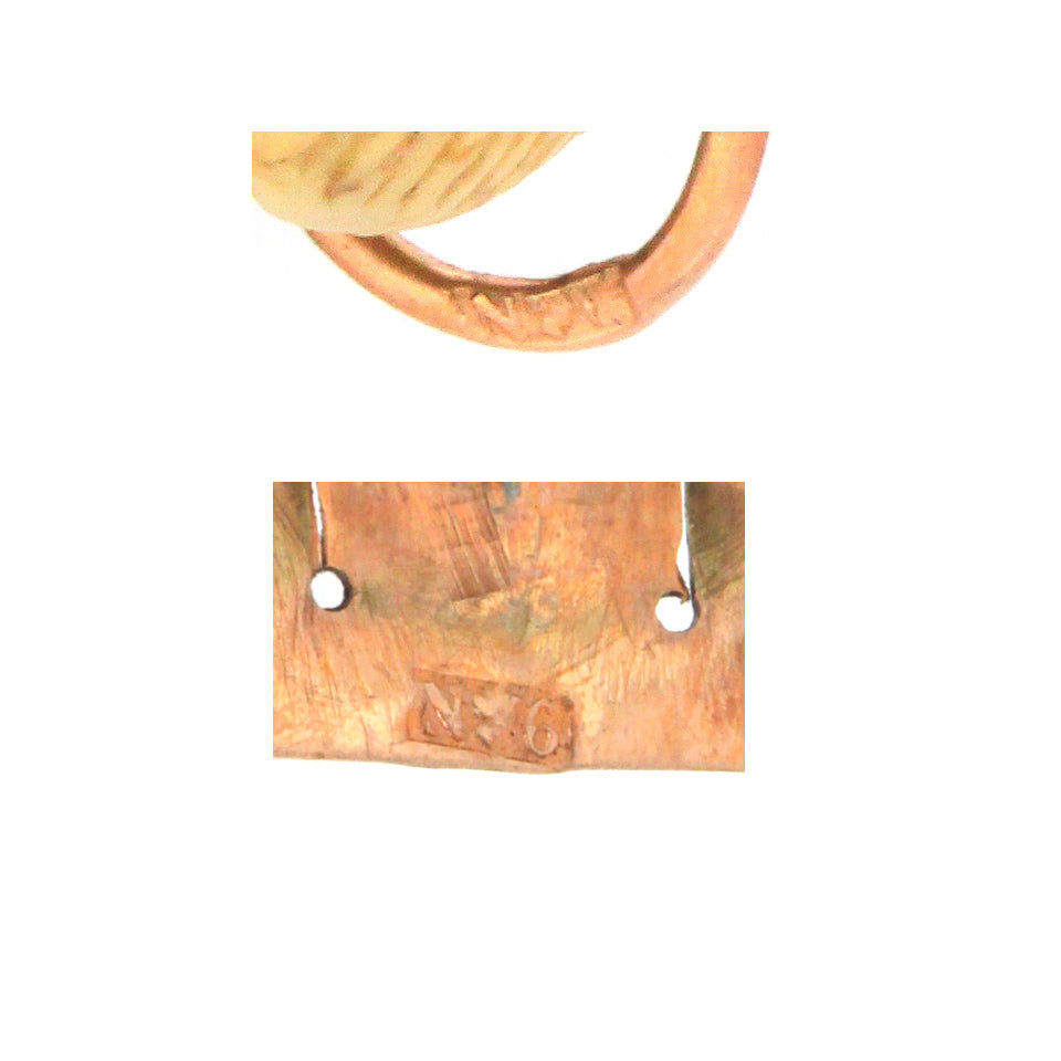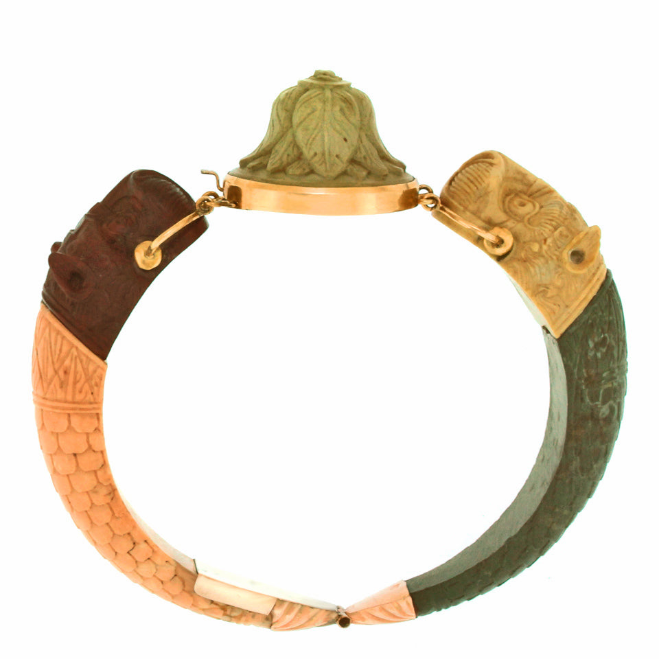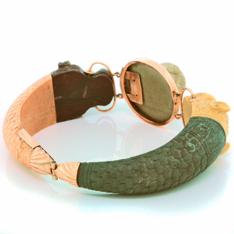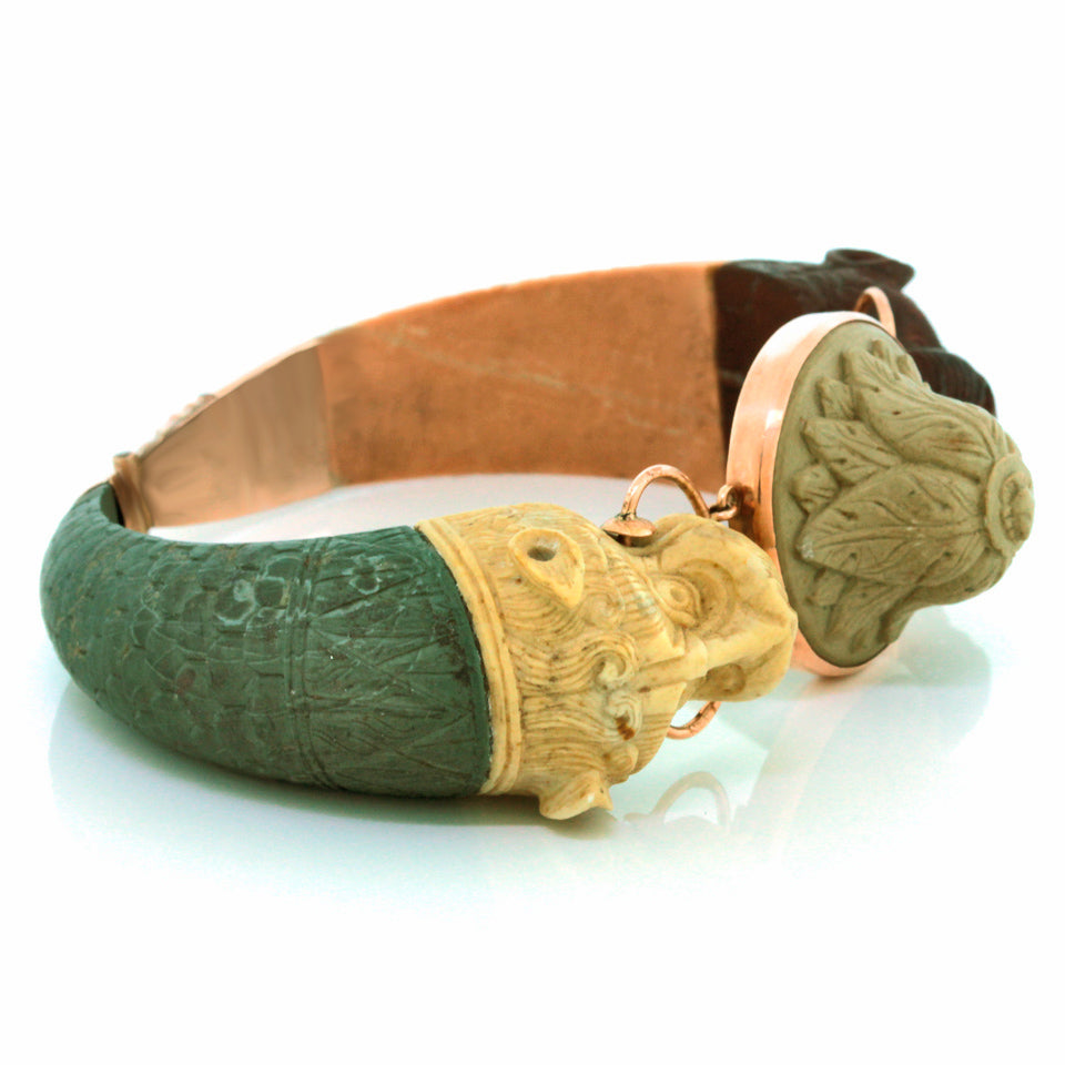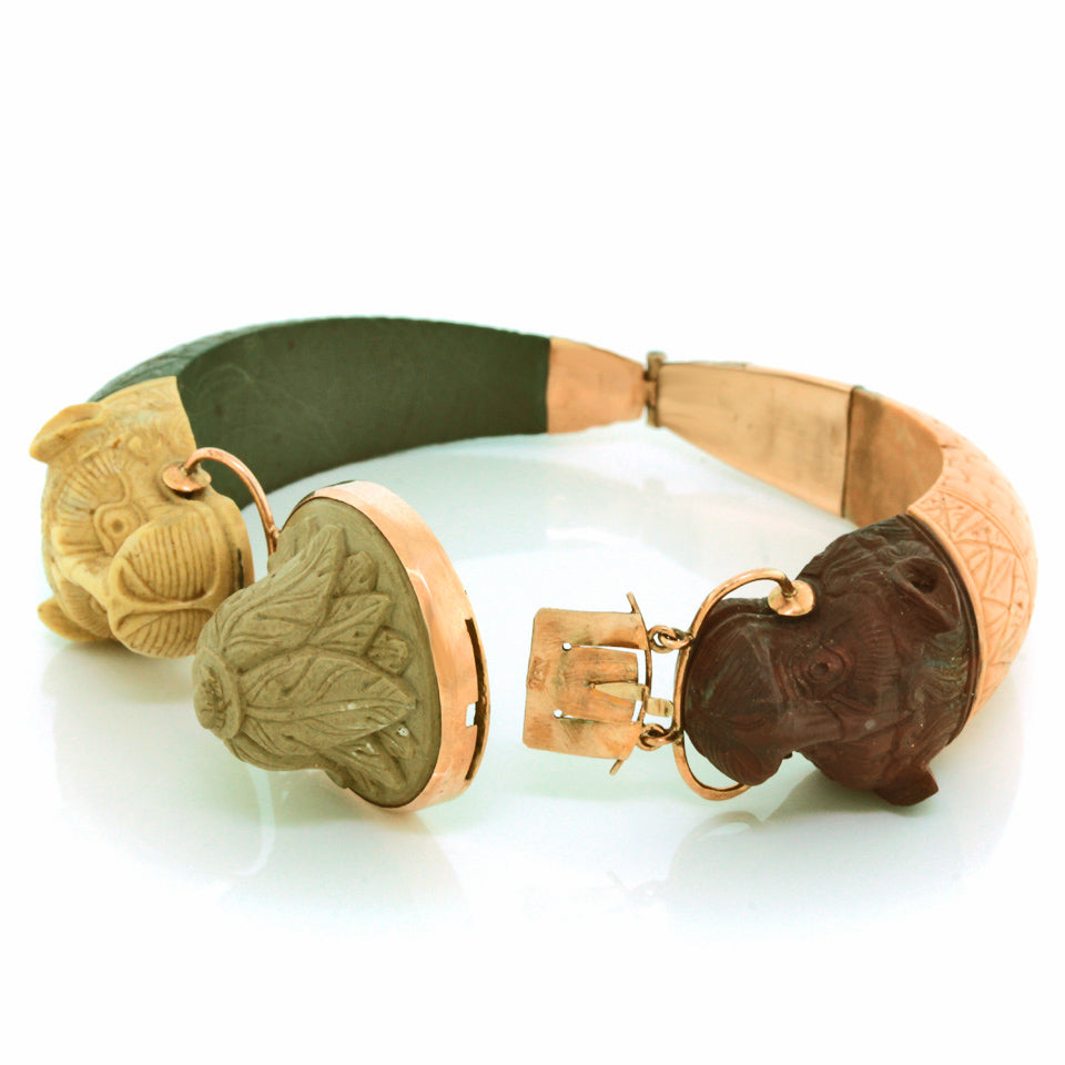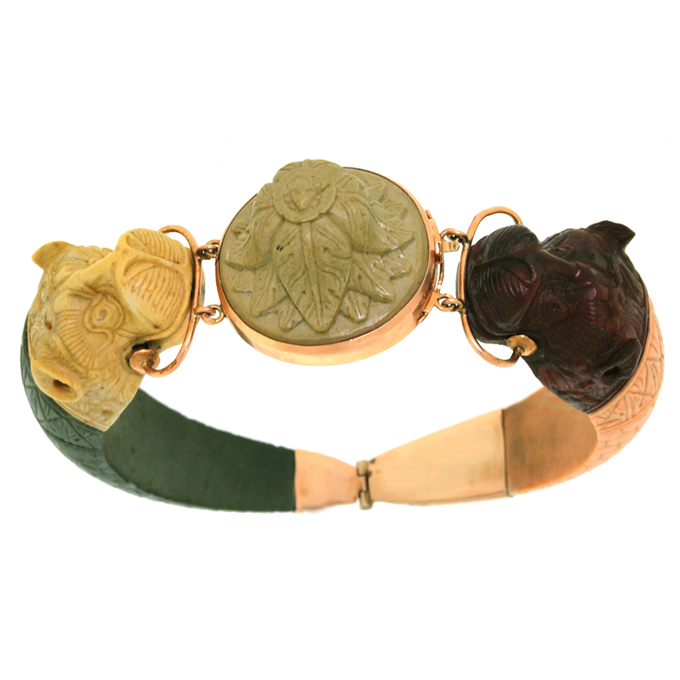Circa 1820-40s, 14k, Italy. This early nineteenth-century Etruscanate bracelet features enchanting carvings in lava. The chic architectural revival look is underscored by beautifully hued organic colors. Italian stone cutters began producing fine lava carvings for use in souvenir jewelry in the early 1800s. This type of jewelry was very popular with travelers on “The Grand Tour” and became a worldwide sensation. A sublime example of the genre, this 200-year-old bracelet is a remarkable find. It is in very good condition with an early meticulous repair noted.