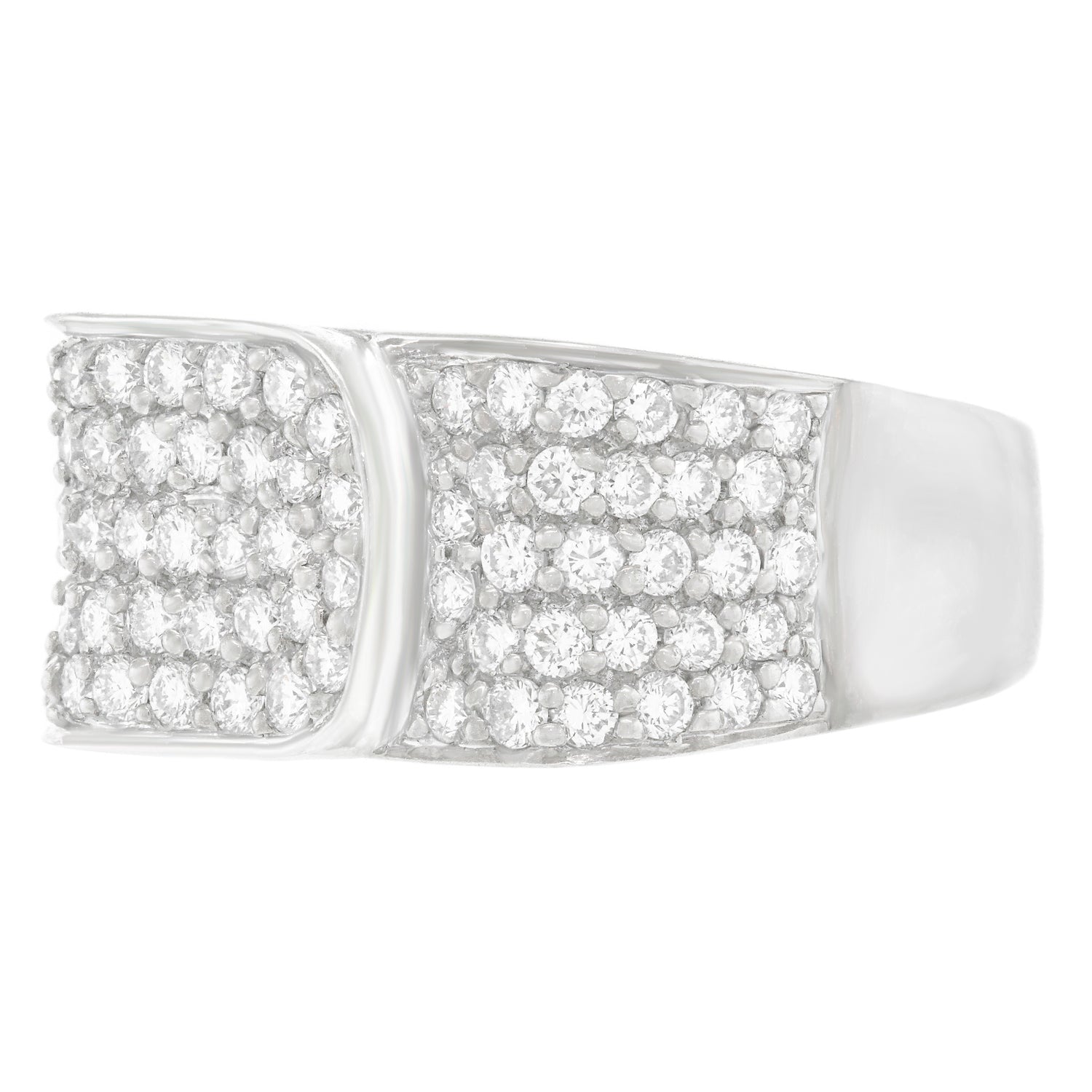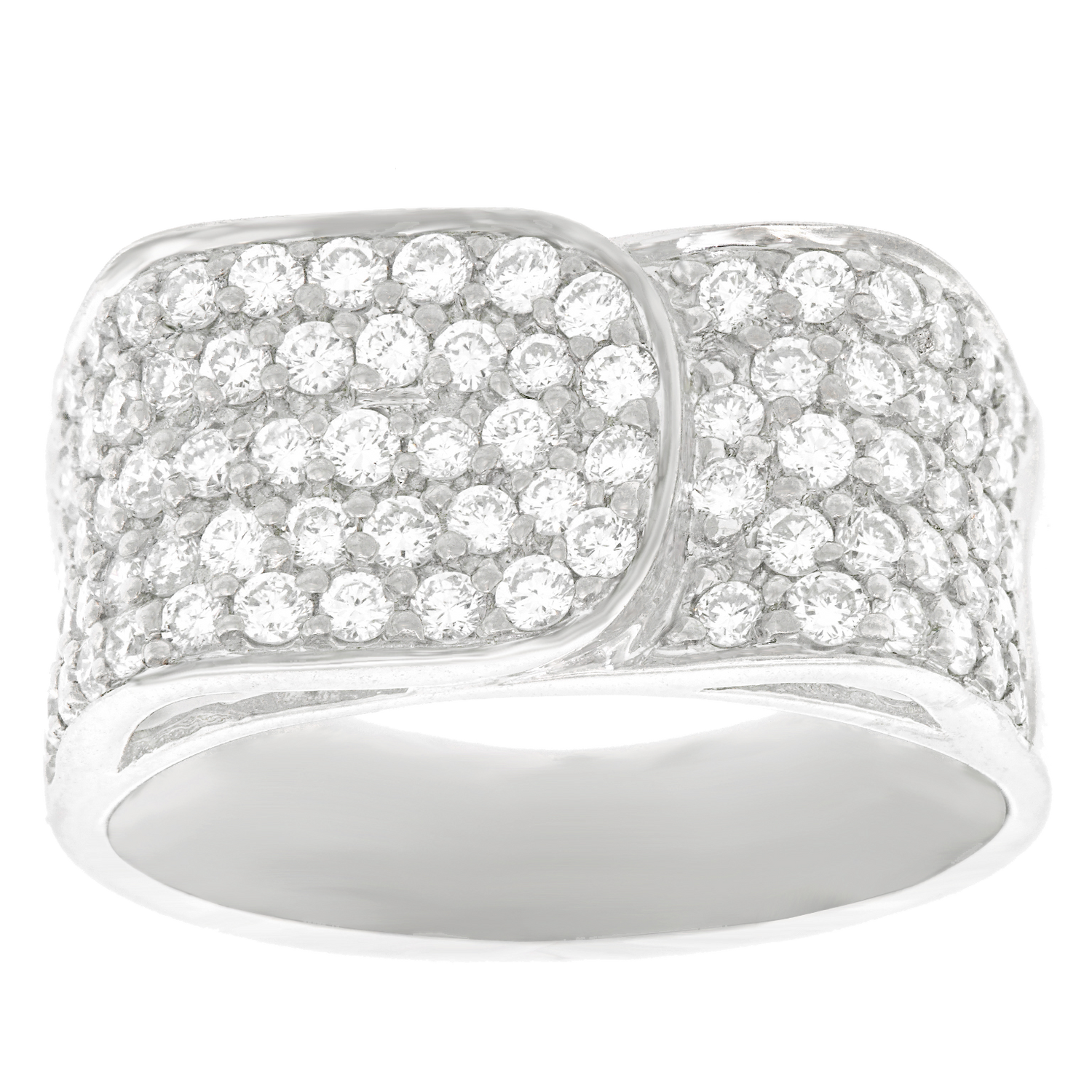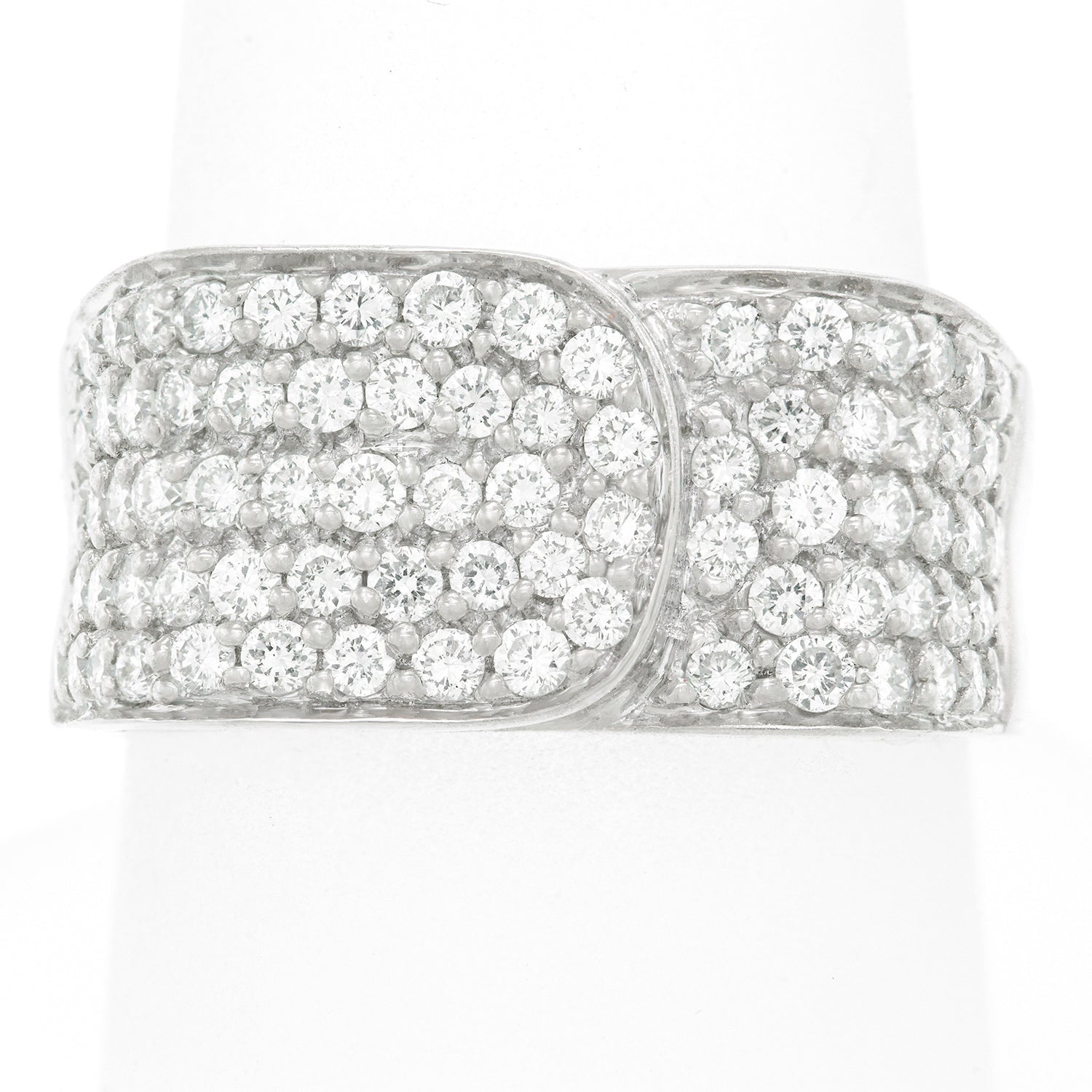 Circa 1980s, 18k, by Bucherer, Switzerland.  Set with 1.20 carats of fine white diamonds (G color, VS clarity), this very understated modernist buckle ring is crisp, clean, and stylishly contemporary. Carl Bucherer, renowned since 1888 for fine quality and distinctive style, embraces contemporary design, a very Swiss aesthetic. This ring is precisely constructed with each diamond individually hand-set, following the Swiss tradition of meticulous attention to detail. Excellent condition.