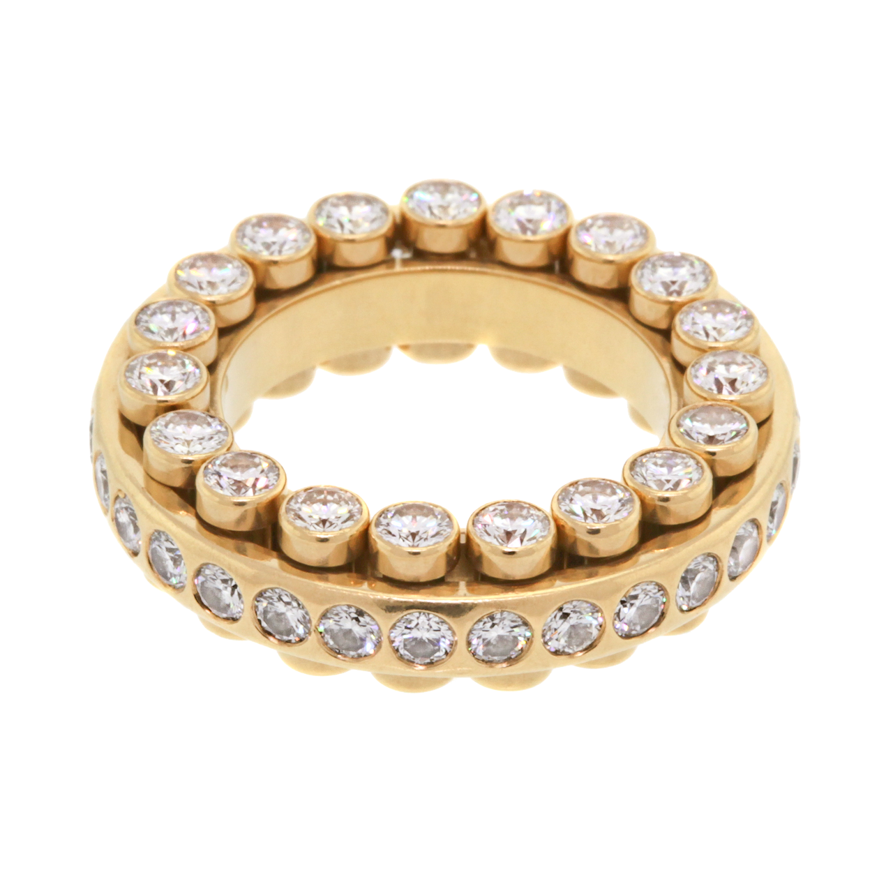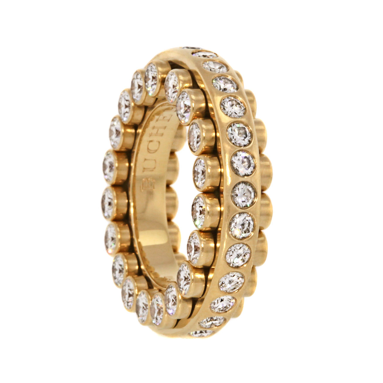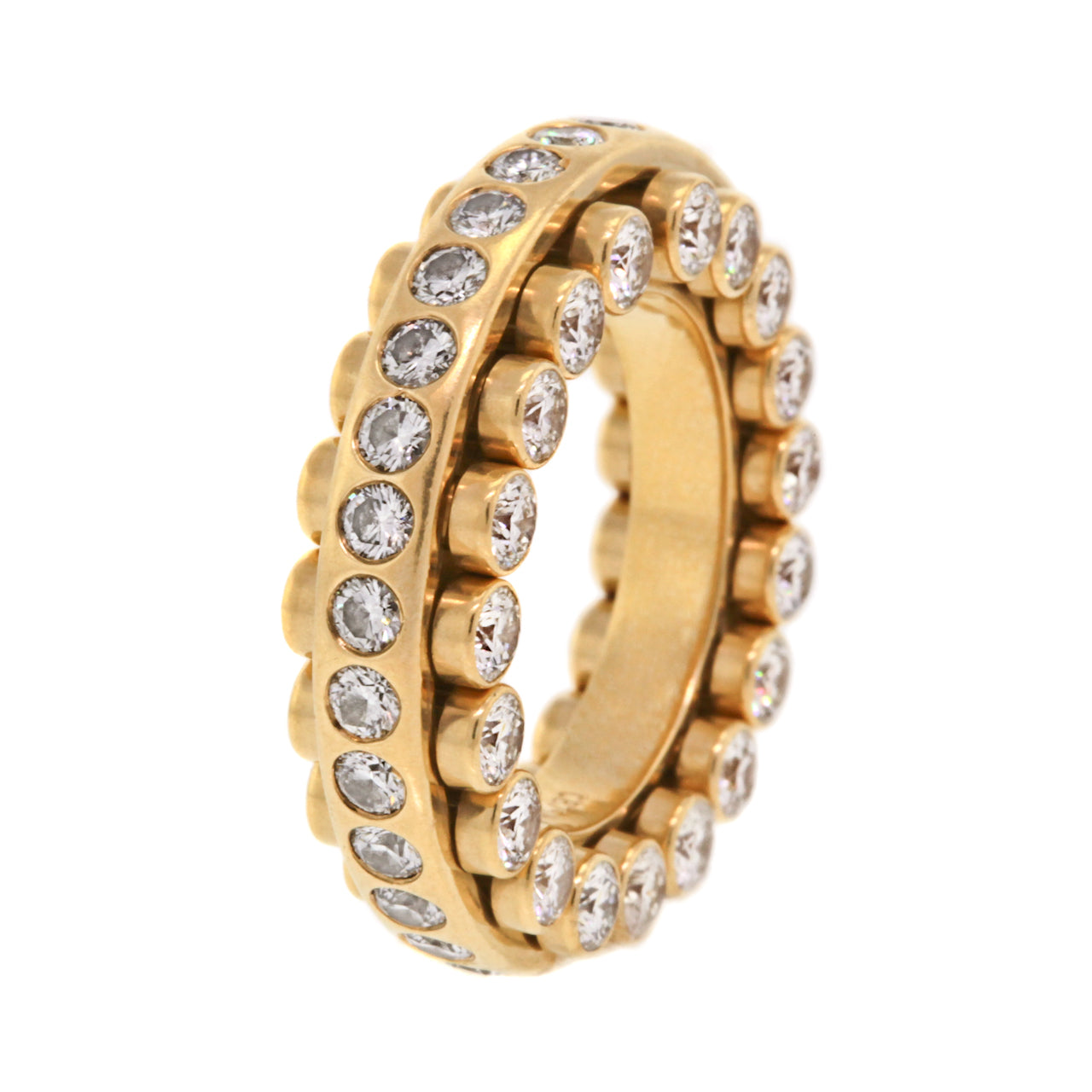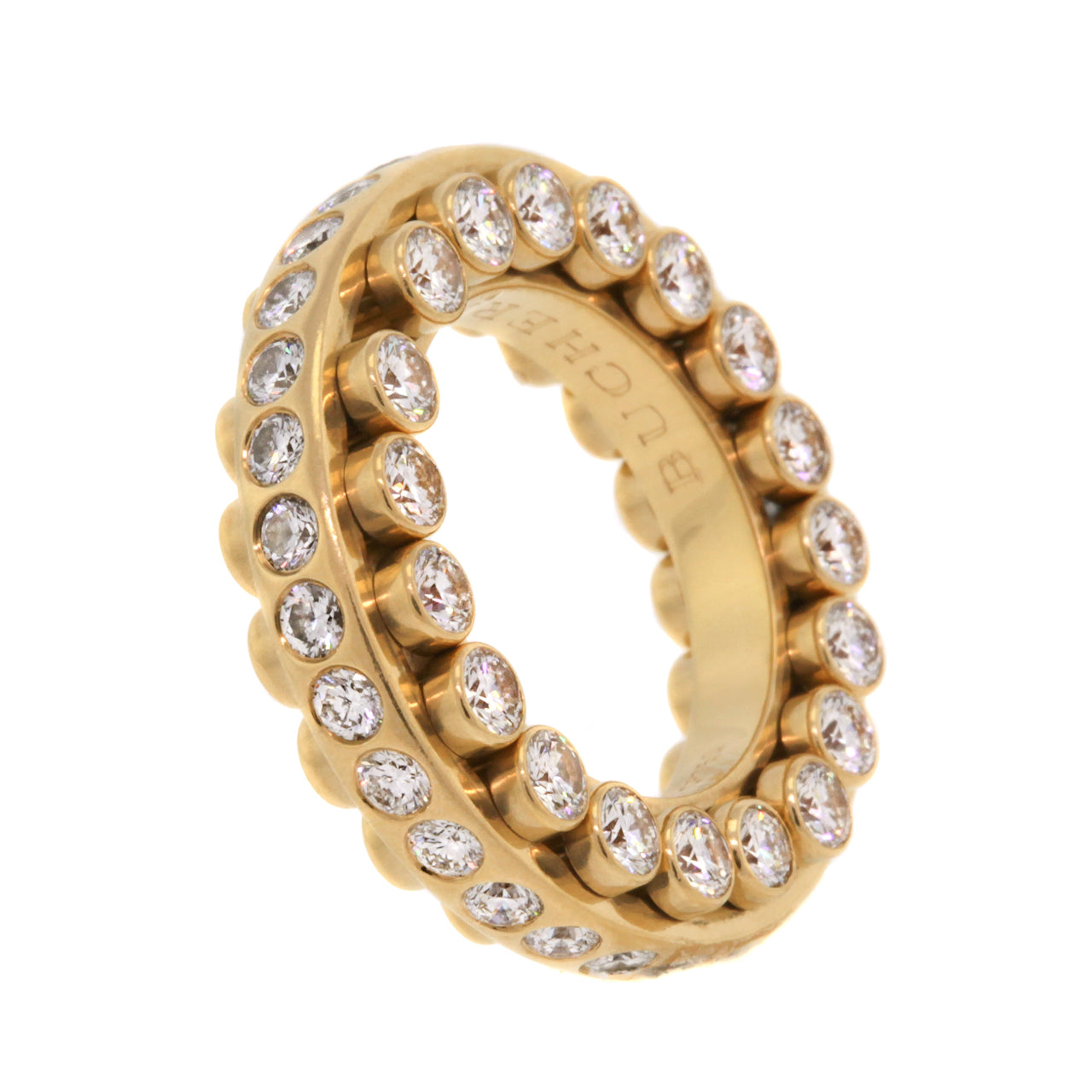 Circa 1980s, 18k, Carl F. Bucherer, Swiss. This signature piece from the world renown Swiss jeweler, Carl Bucherer, features a kinetic design that is reminiscent of a roller bearing. It has diamonds on three sides and every element is moveable. Famous for three sided eternity bands and mechanical two piece bands, Bucherer combines the best of both in this signature  masterpiece.  Excellent condition.