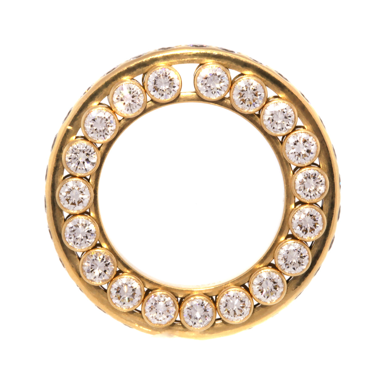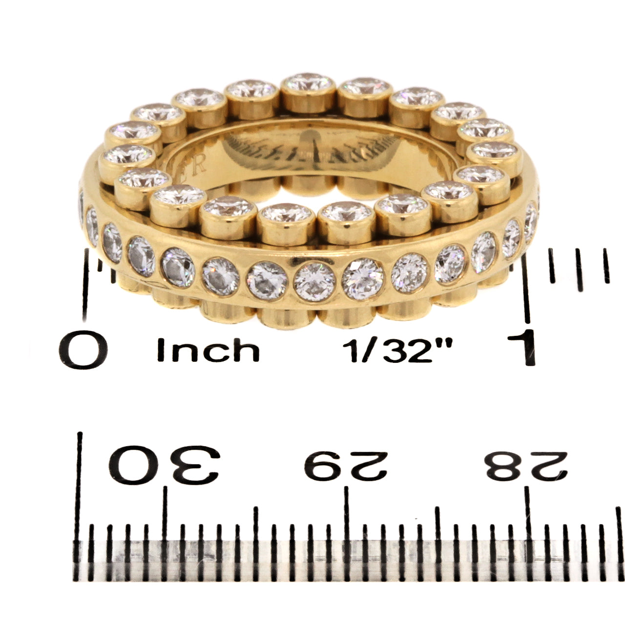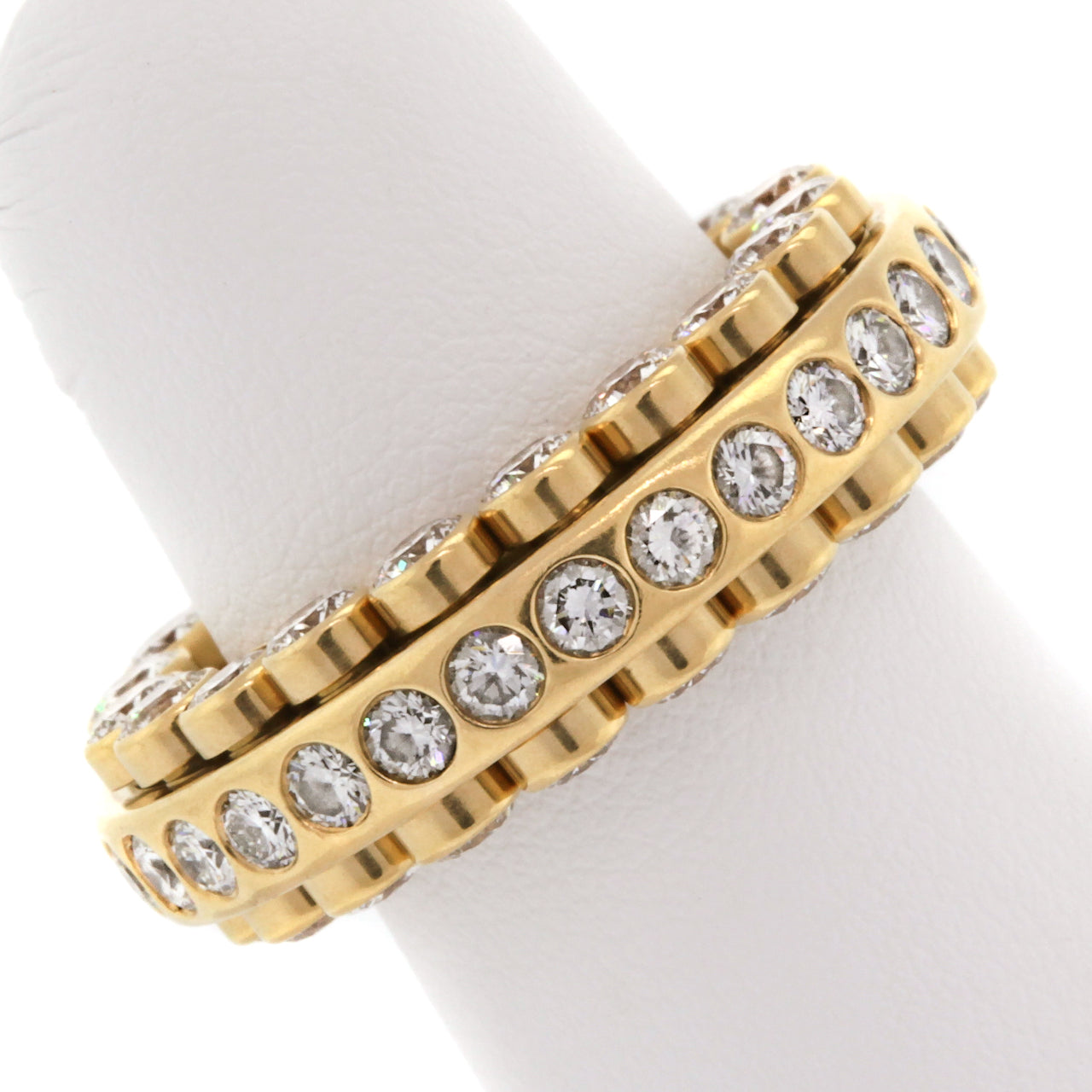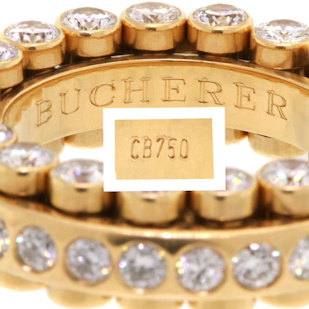 Circa 1980s, 18k, Carl F. Bucherer, Swiss. This signature piece from the world renown Swiss jeweler, Carl Bucherer, features a kinetic design that is reminiscent of a roller bearing. It has diamonds on three sides and every element is moveable. Famous for three sided eternity bands and mechanical two piece bands, Bucherer combines the best of both in this signature  masterpiece.  Excellent condition.