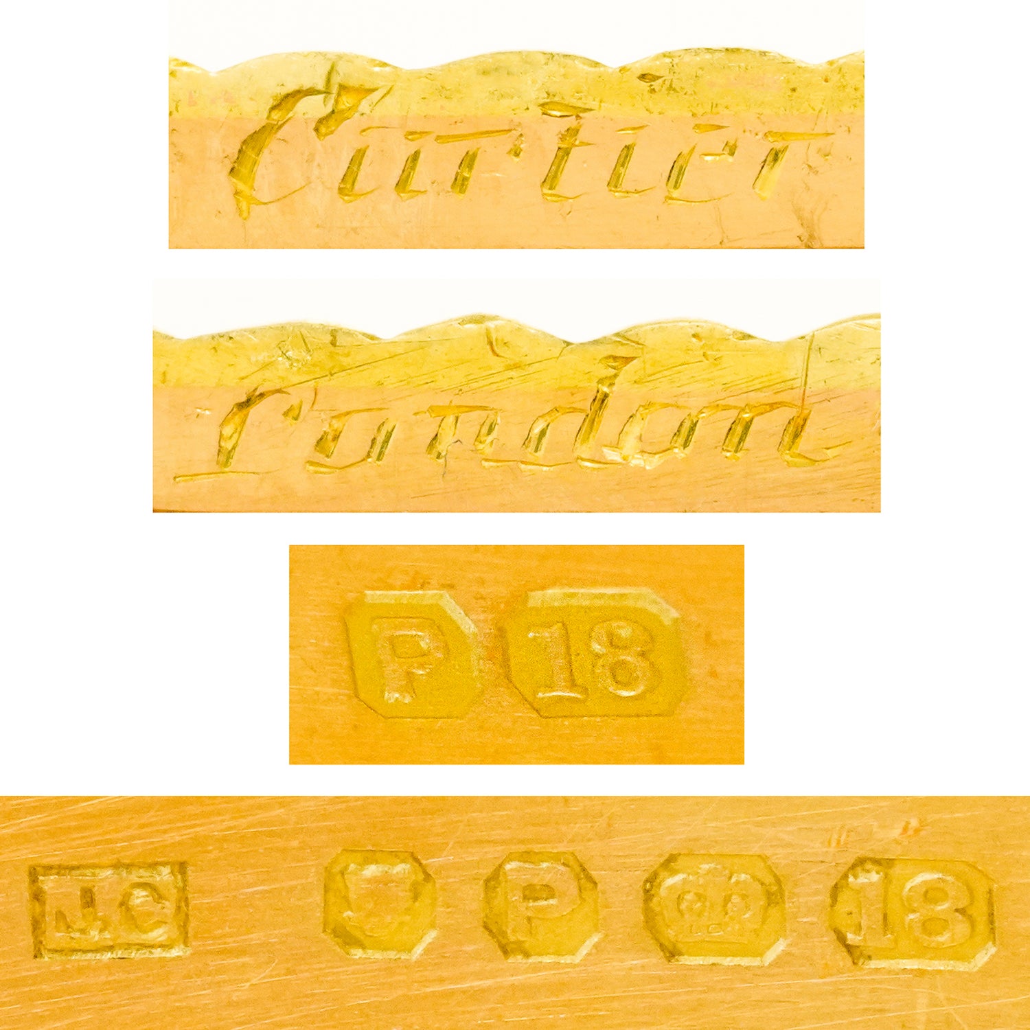 Cartier, London, 18 for 18k, JC hallmark for Jacques Cartier, Leopard head for London, date letter P for 1950-51, and Royal assay mark crown