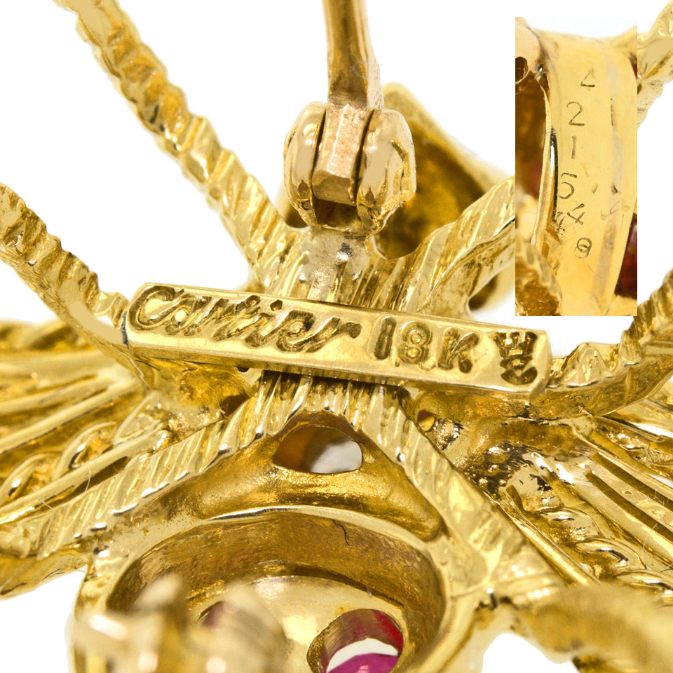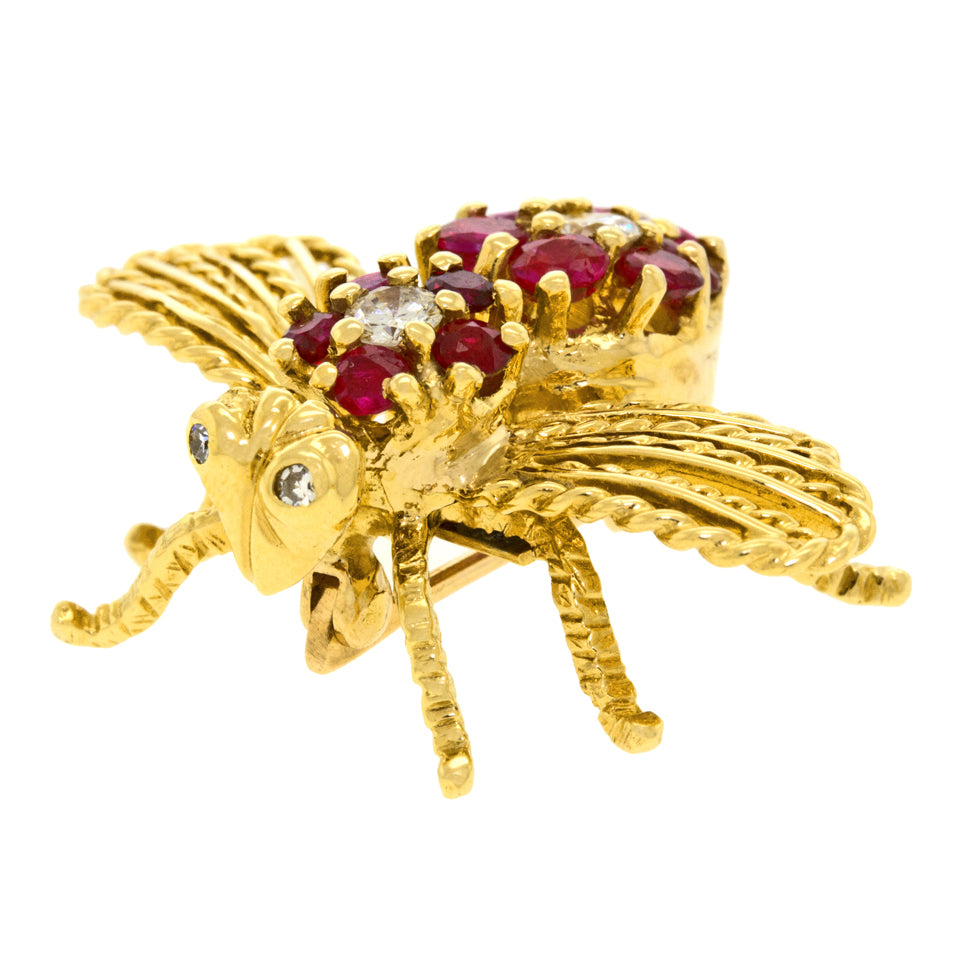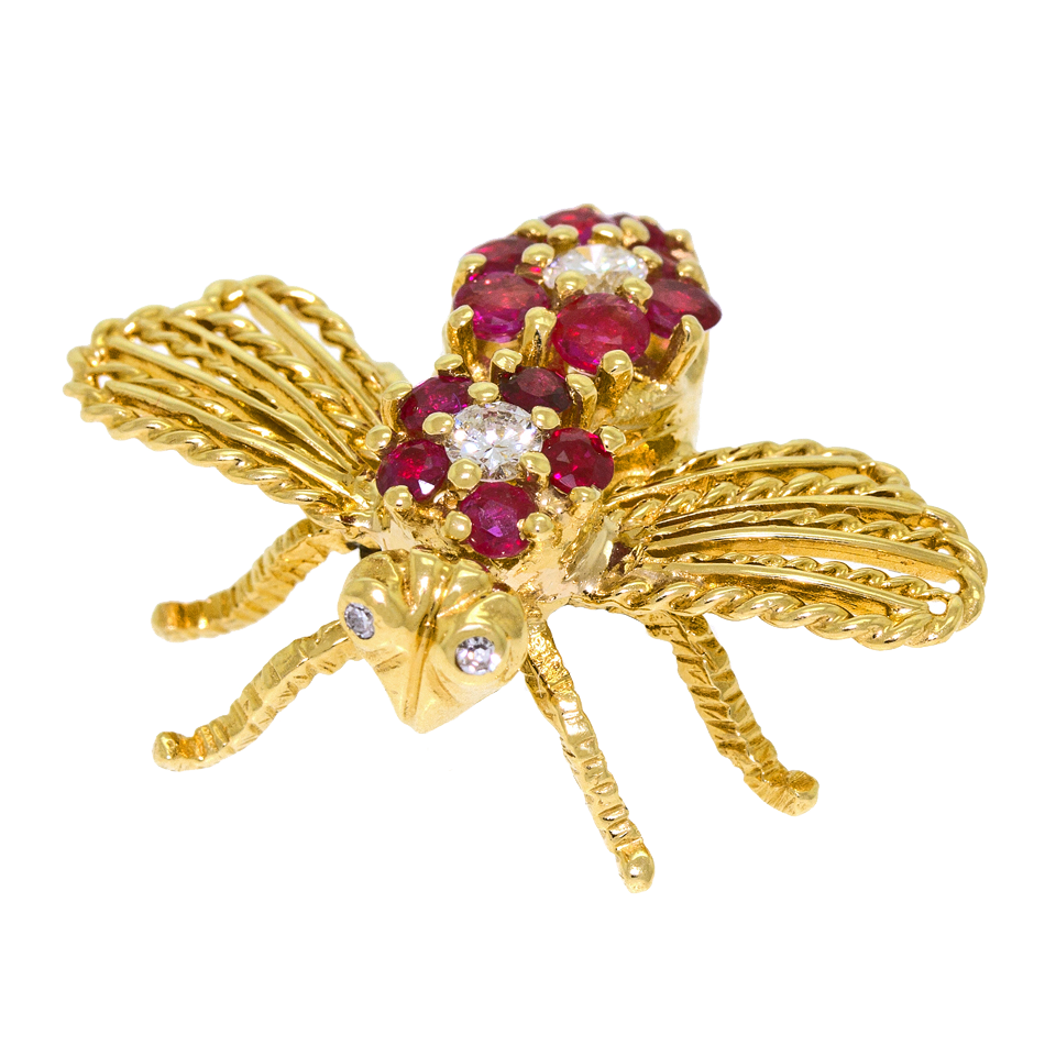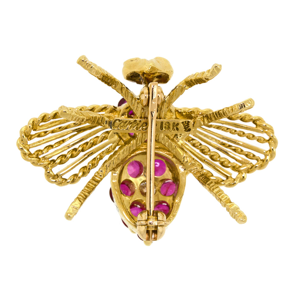 Circa 1980s, 18k, Cartier. Always in style, bee pins are classic fashion at their fanciful best. This 18-karat gold Bee by Cartier is set with 1.0 carats of superb rubies and .25 carats of brilliant white diamonds. With its unusual wing design, this is a particularly charming example of the genre.