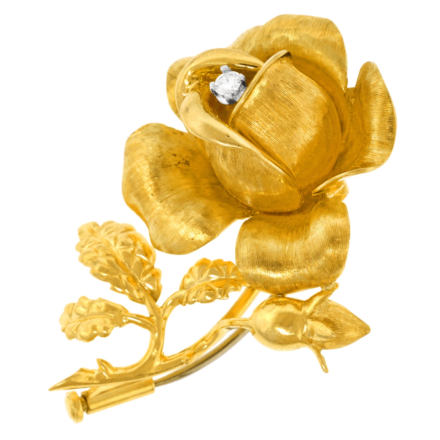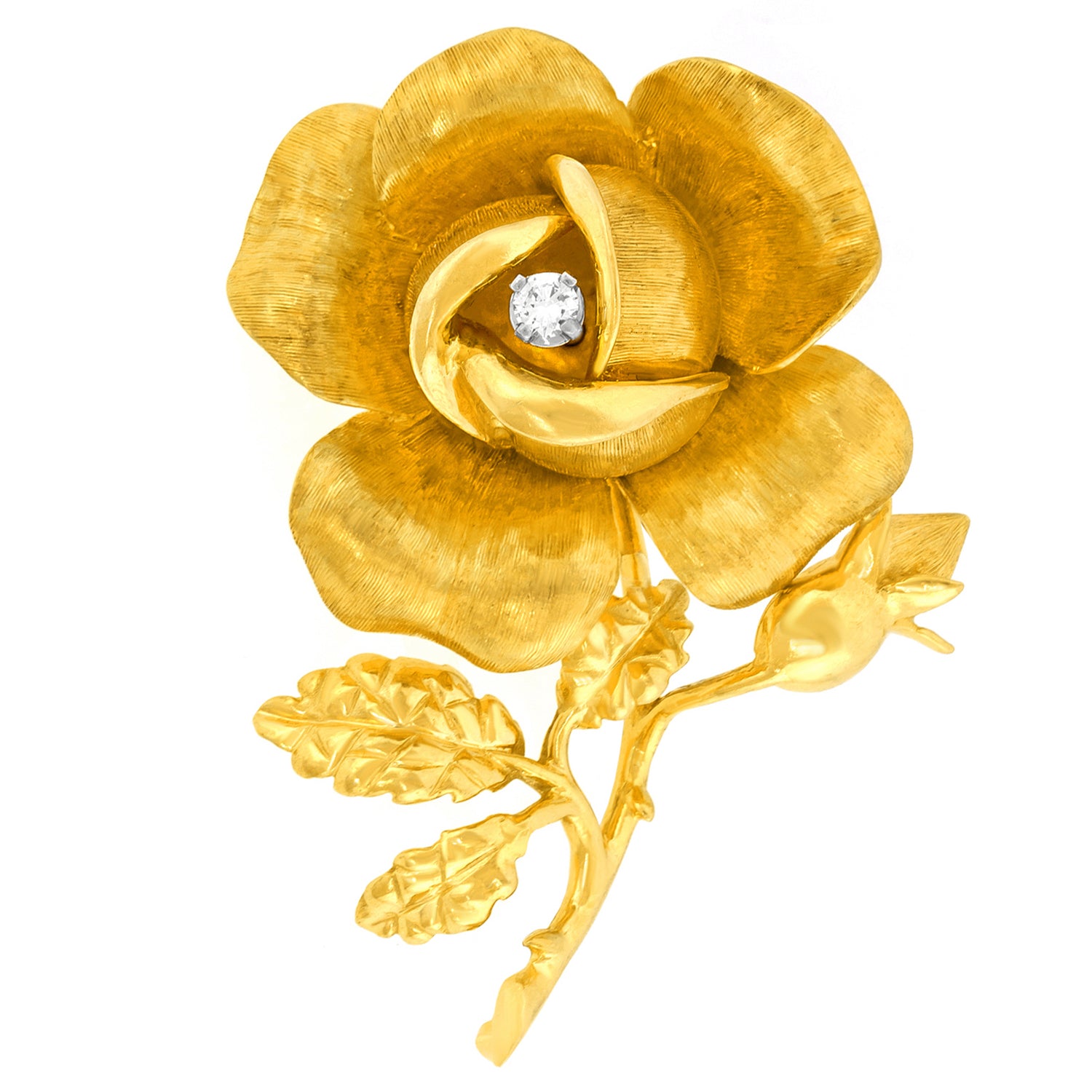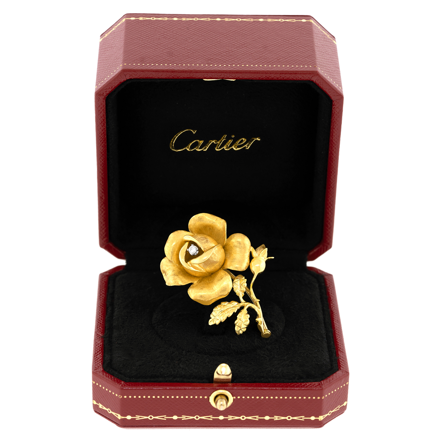 Circa 1960s, 18k, by Cartier. This charming sixties rose brooch in eighteen-karat yellow gold has a pleasing style. A brilliant white diamond sits at the center of the petals. Beautifully made, this brooch will effortlessly go with any classic look. Excellent condition. Comes with an original Cartier box.