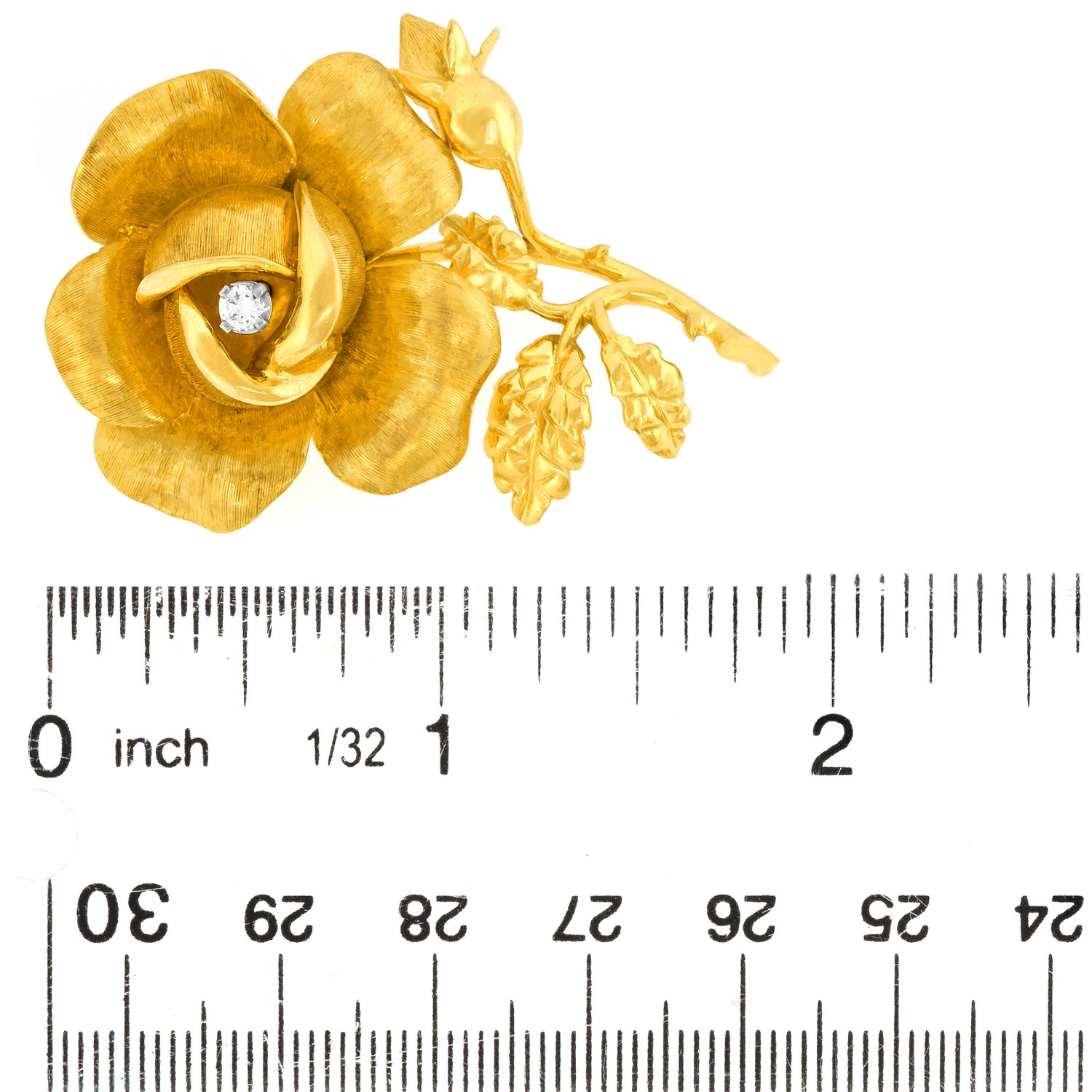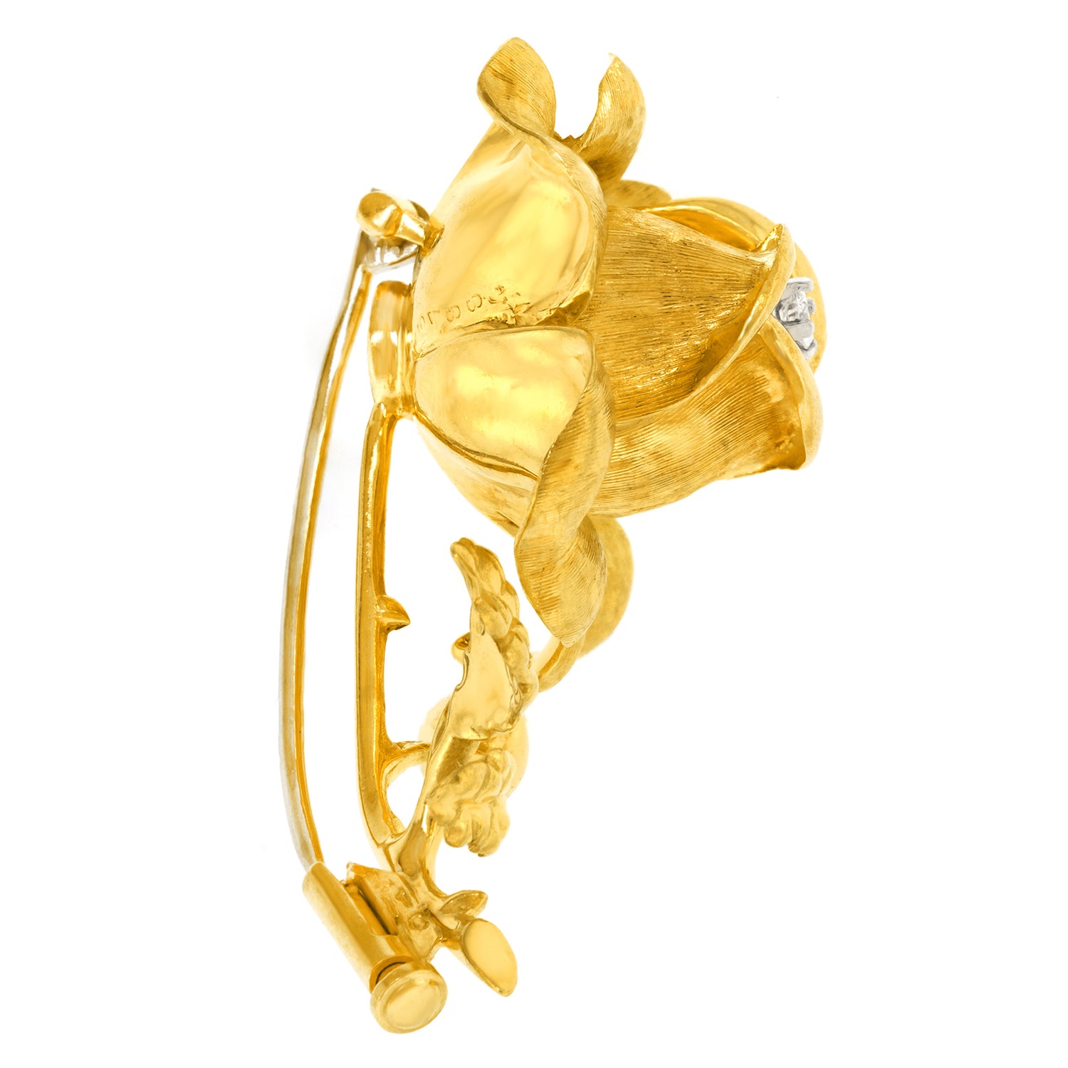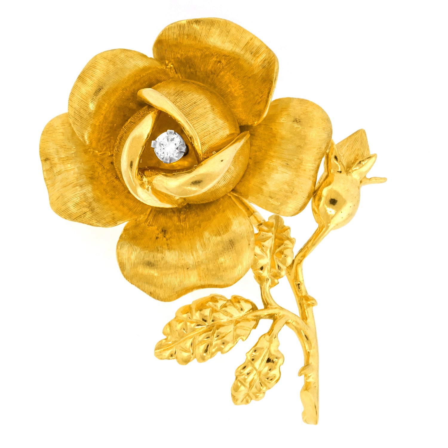 Circa 1960s, 18k, by Cartier. This charming sixties rose brooch in eighteen-karat yellow gold has a pleasing style. A brilliant white diamond sits at the center of the petals. Beautifully made, this brooch will effortlessly go with any classic look. Excellent condition. Comes with an original Cartier box.