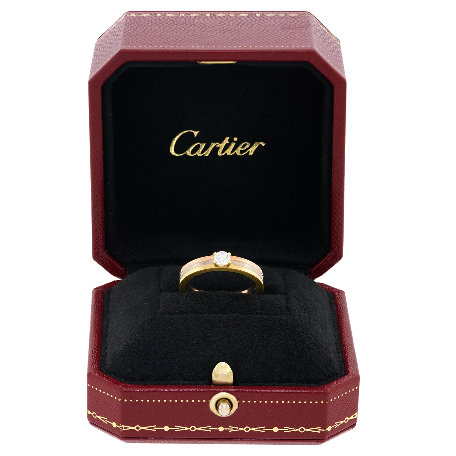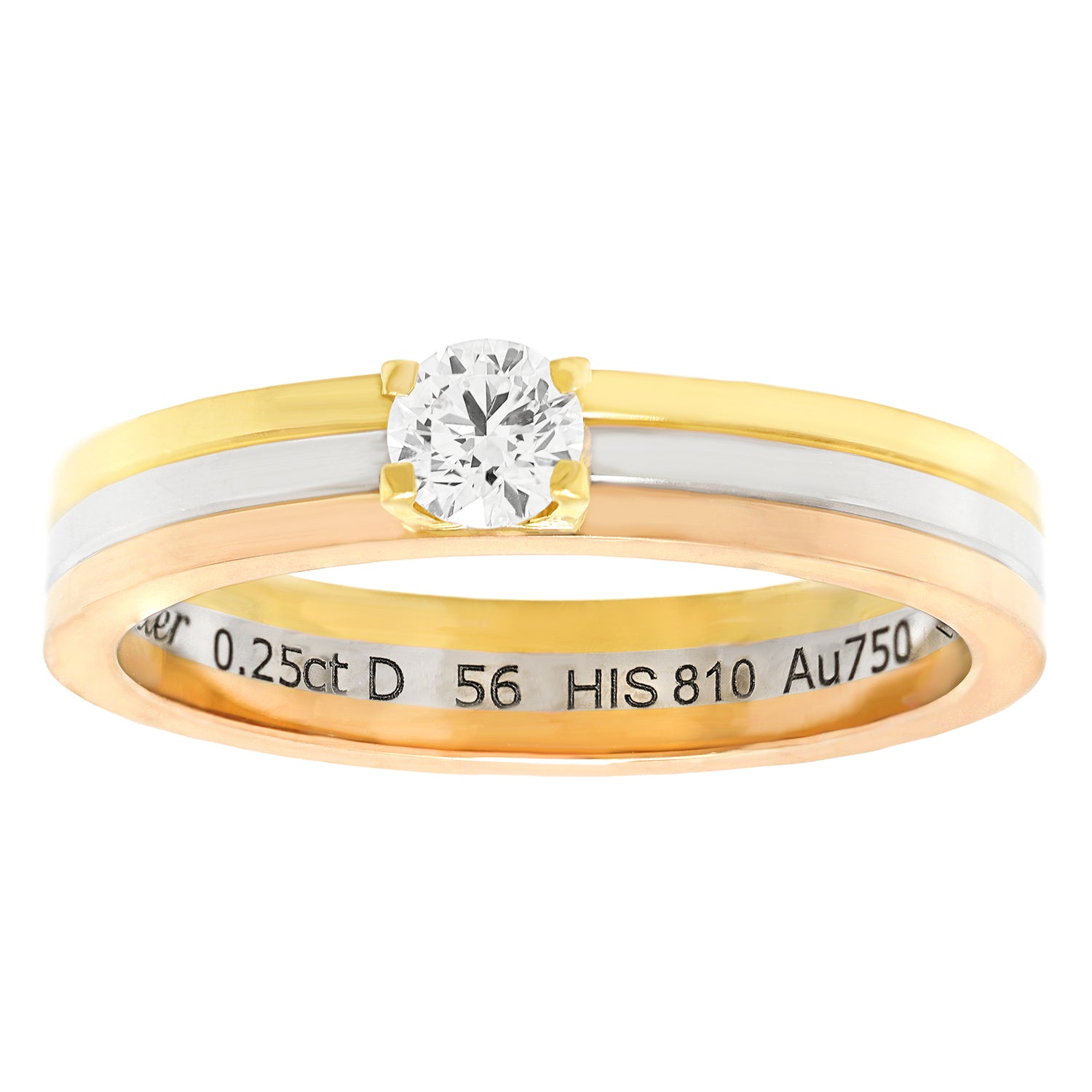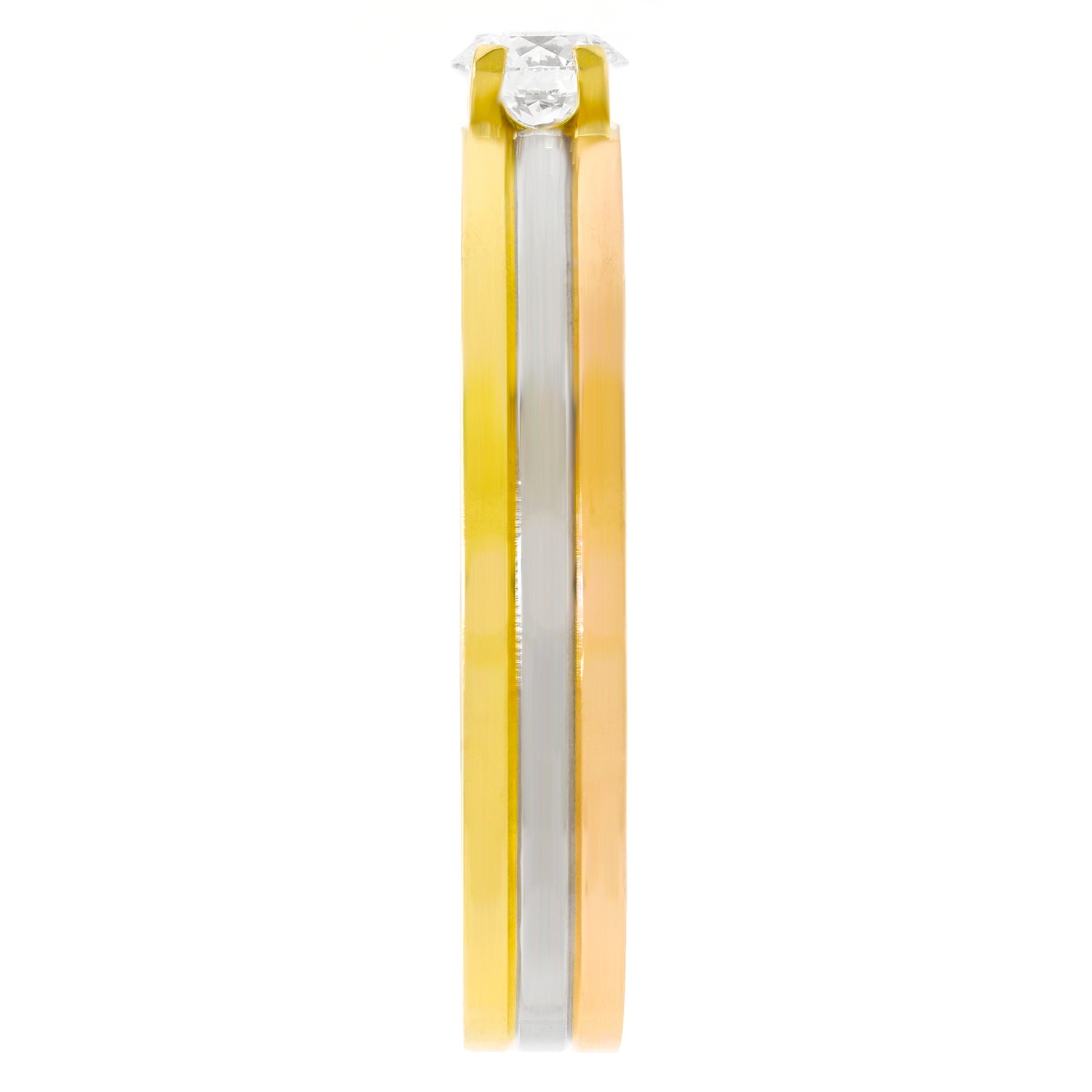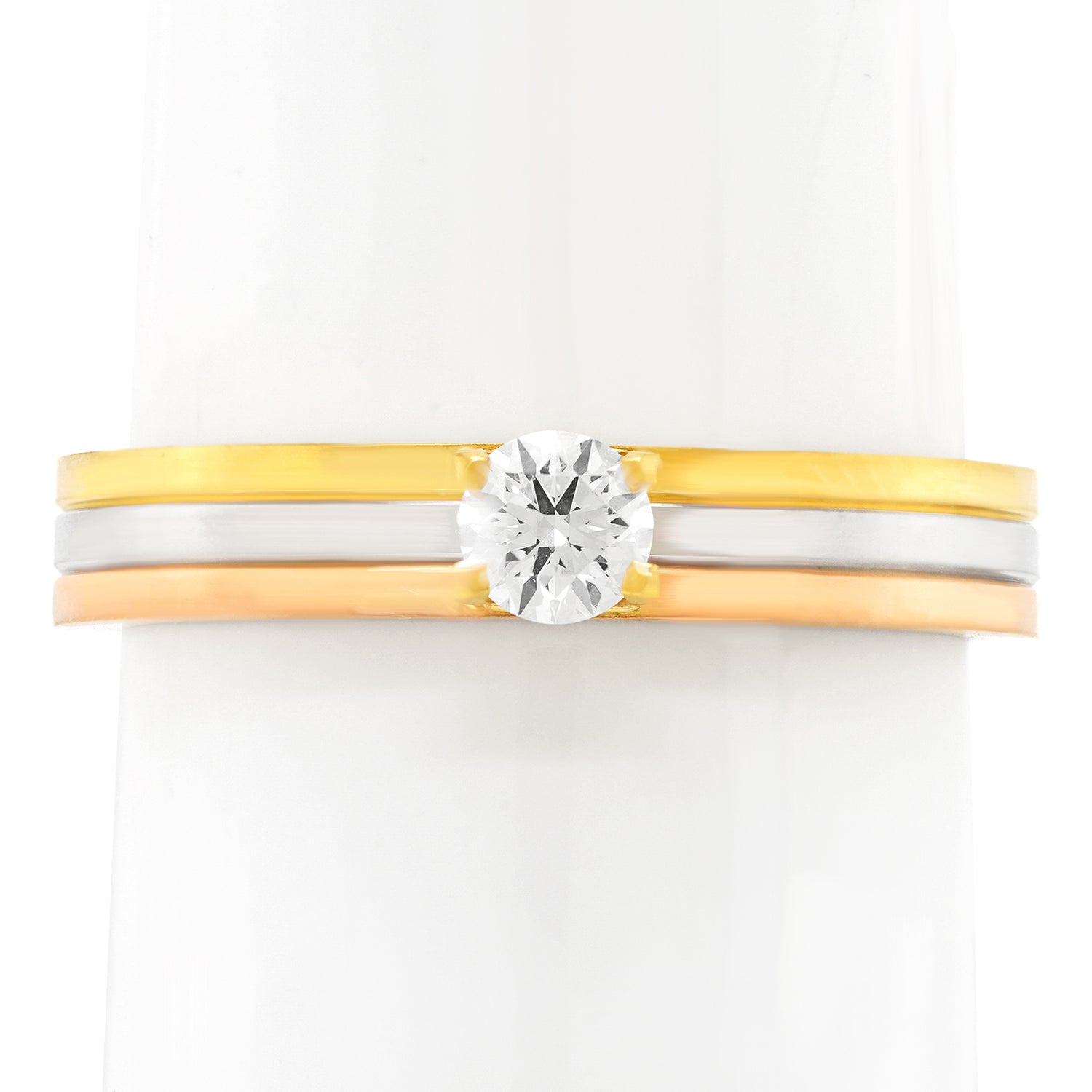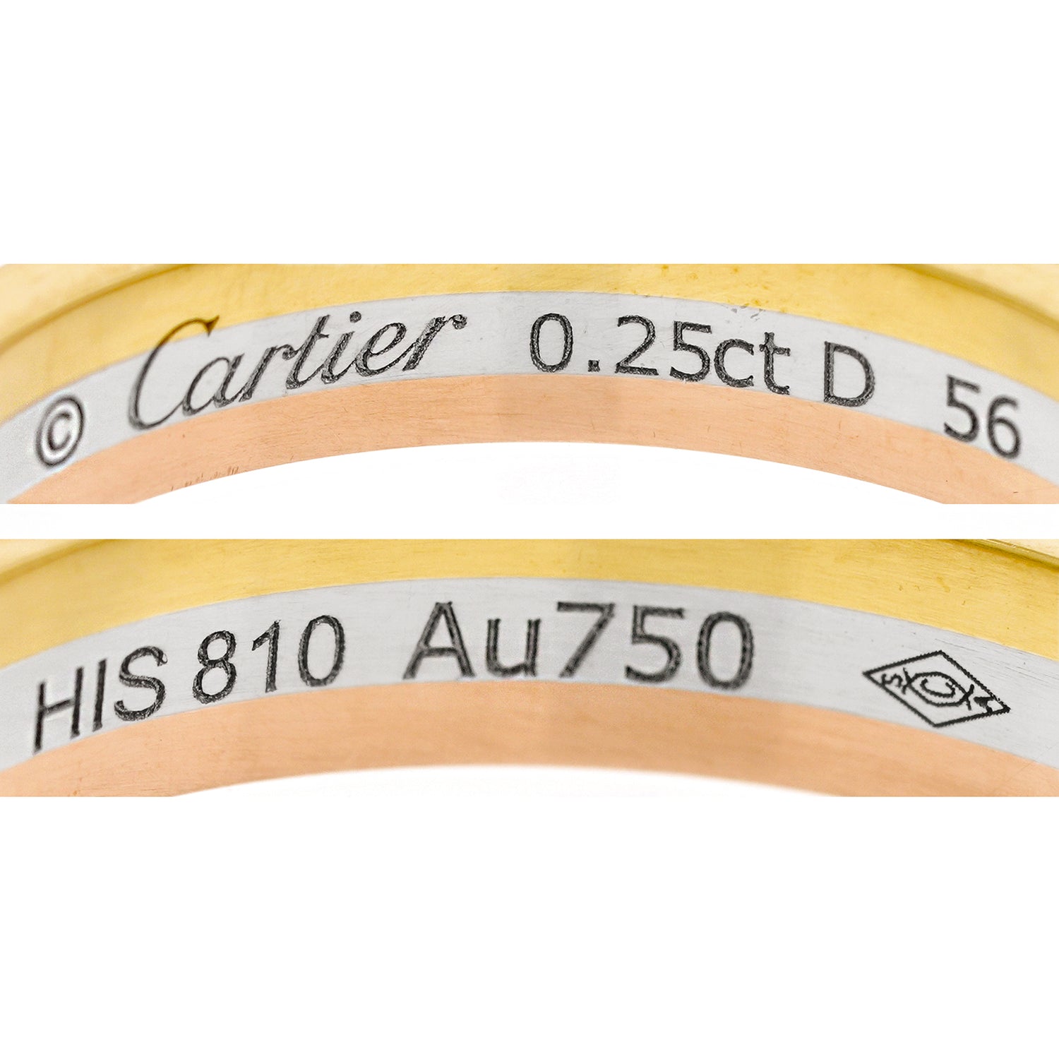 18k, Circa 1990s, by Cartier, France. This unusual Cartier diamond ring stack features the iconic trinity visual experience. Perfect for anytime, anywhere, it looks fabulous worn alone or stacked with other rings. Trinity motif jewelry is classic Cartier at its very chic best. Excellent condition.
