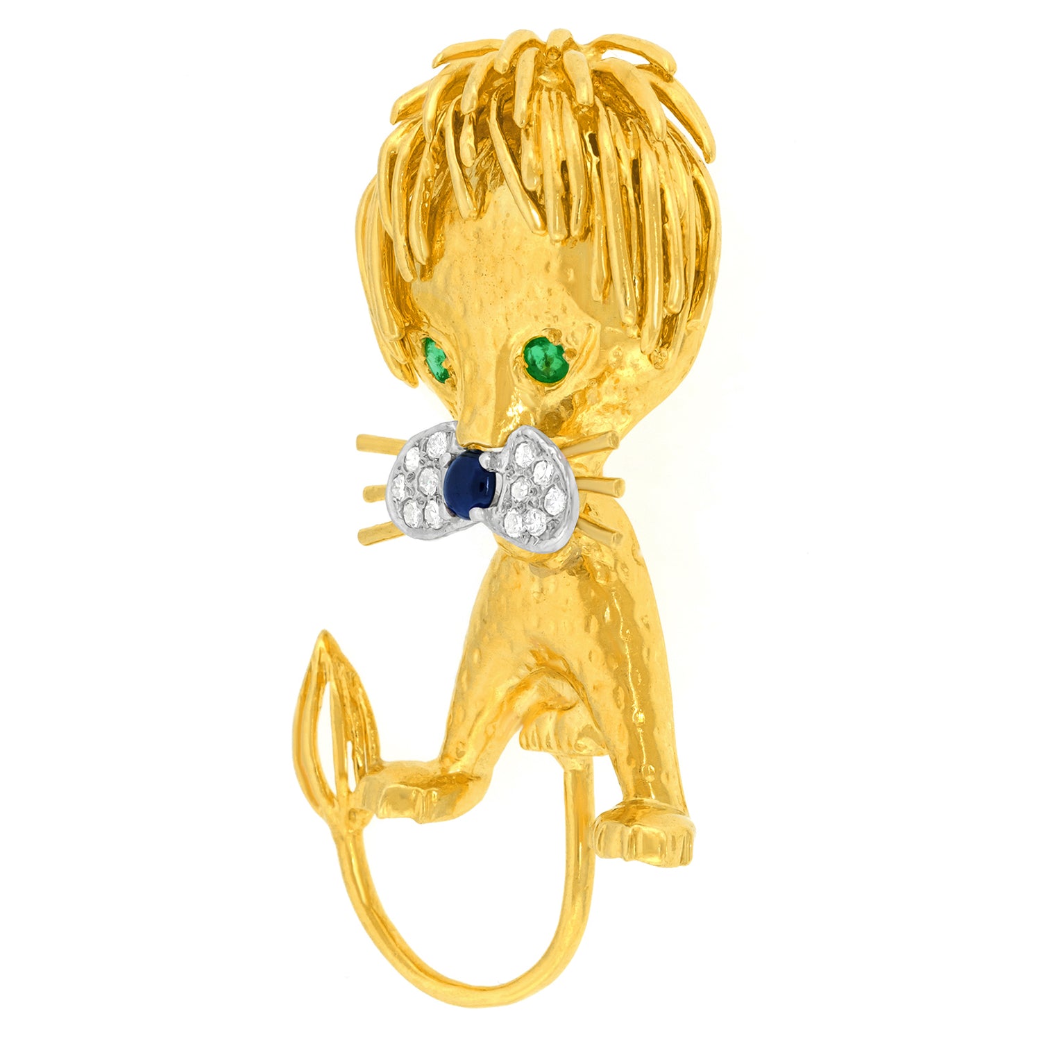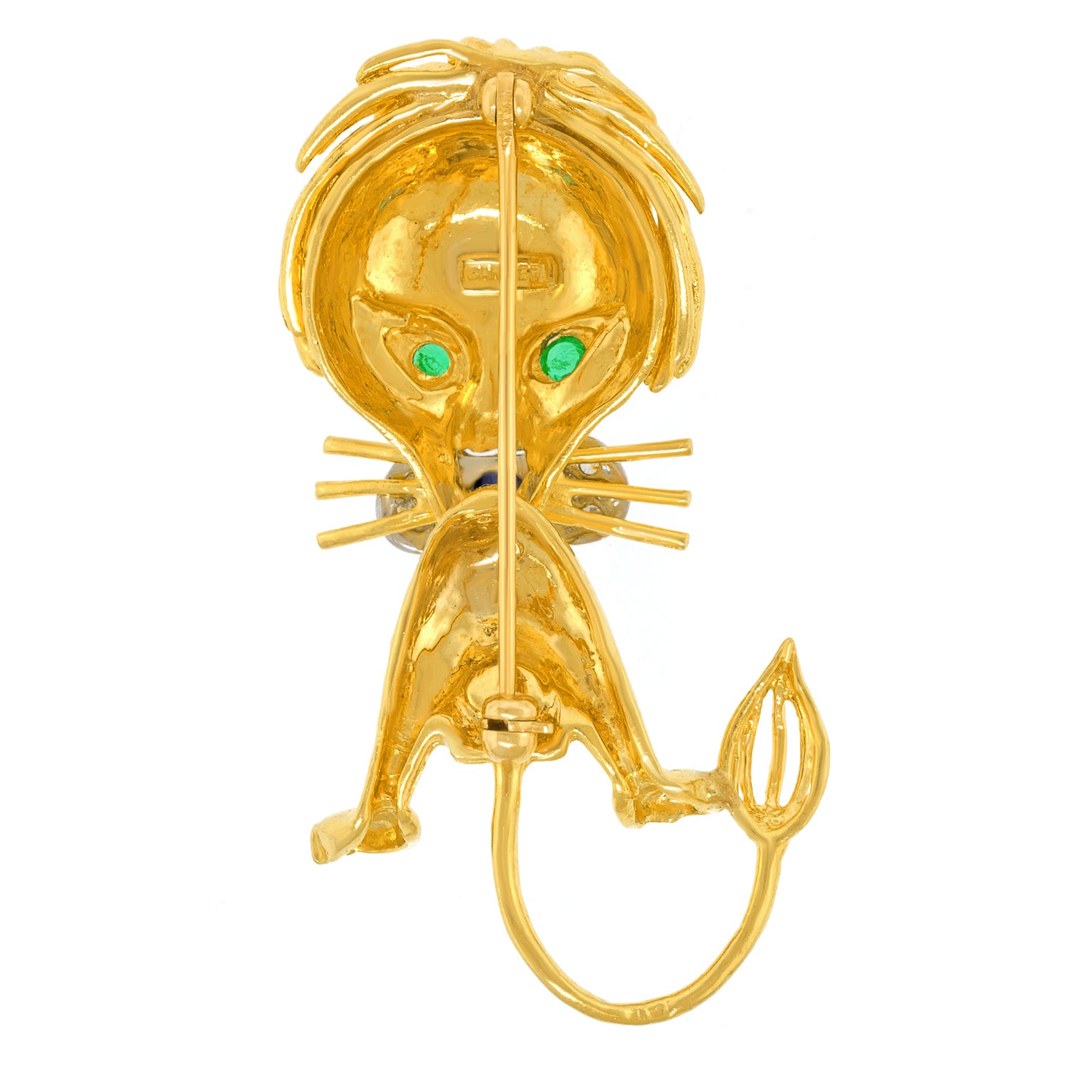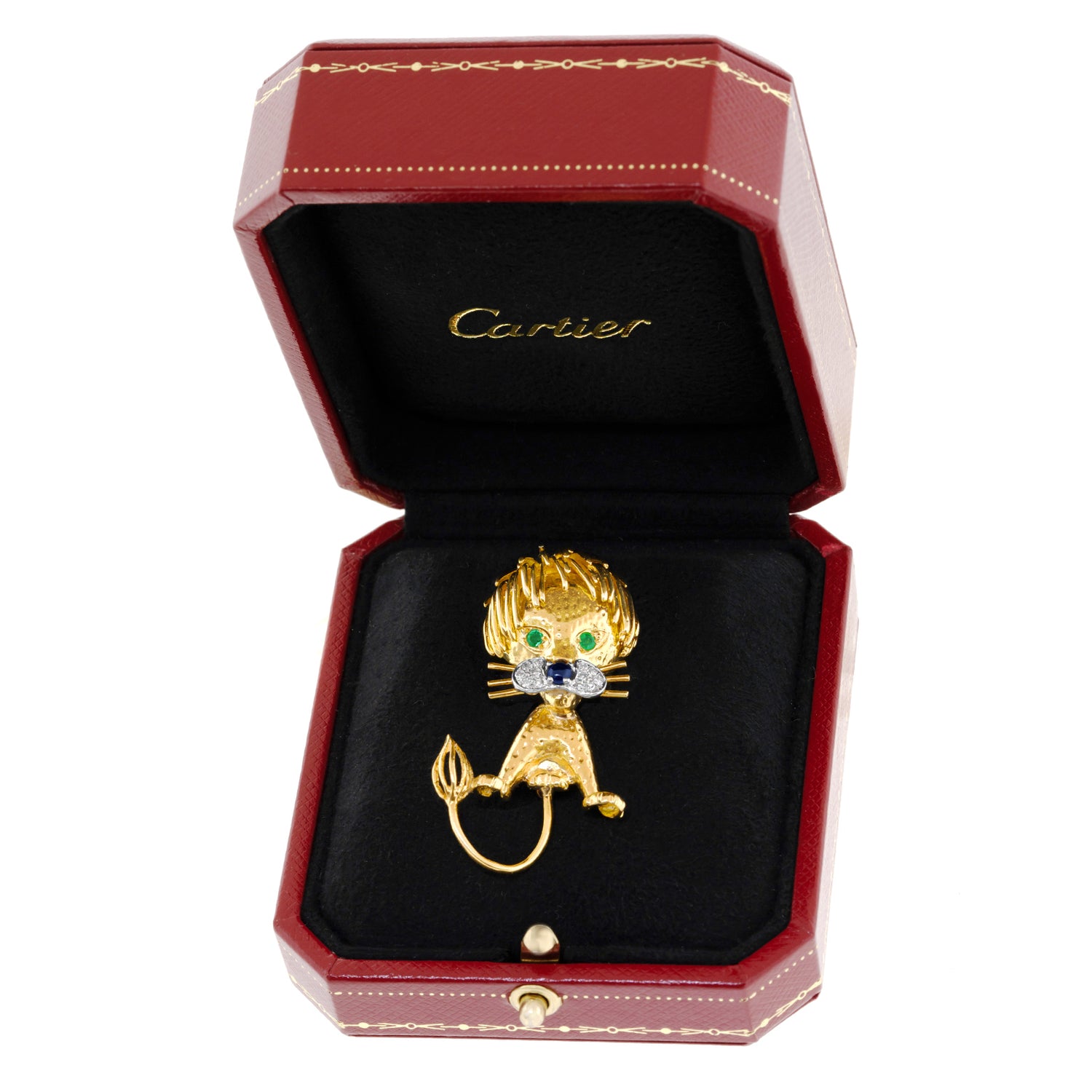 Circa 1960s, 18k, by Cartier. This oh-so-sixties lion brooch by Cartier is the perfect whimsical accessory. Charming animal brooches were all the rage in the fifties, sixties, and seventies. This one has fabulous emerald eyes, a sapphire nose, and fine white diamond cheeks! A superb example, this Cartier jewel is in excellent condition and comes in an original Cartier box.