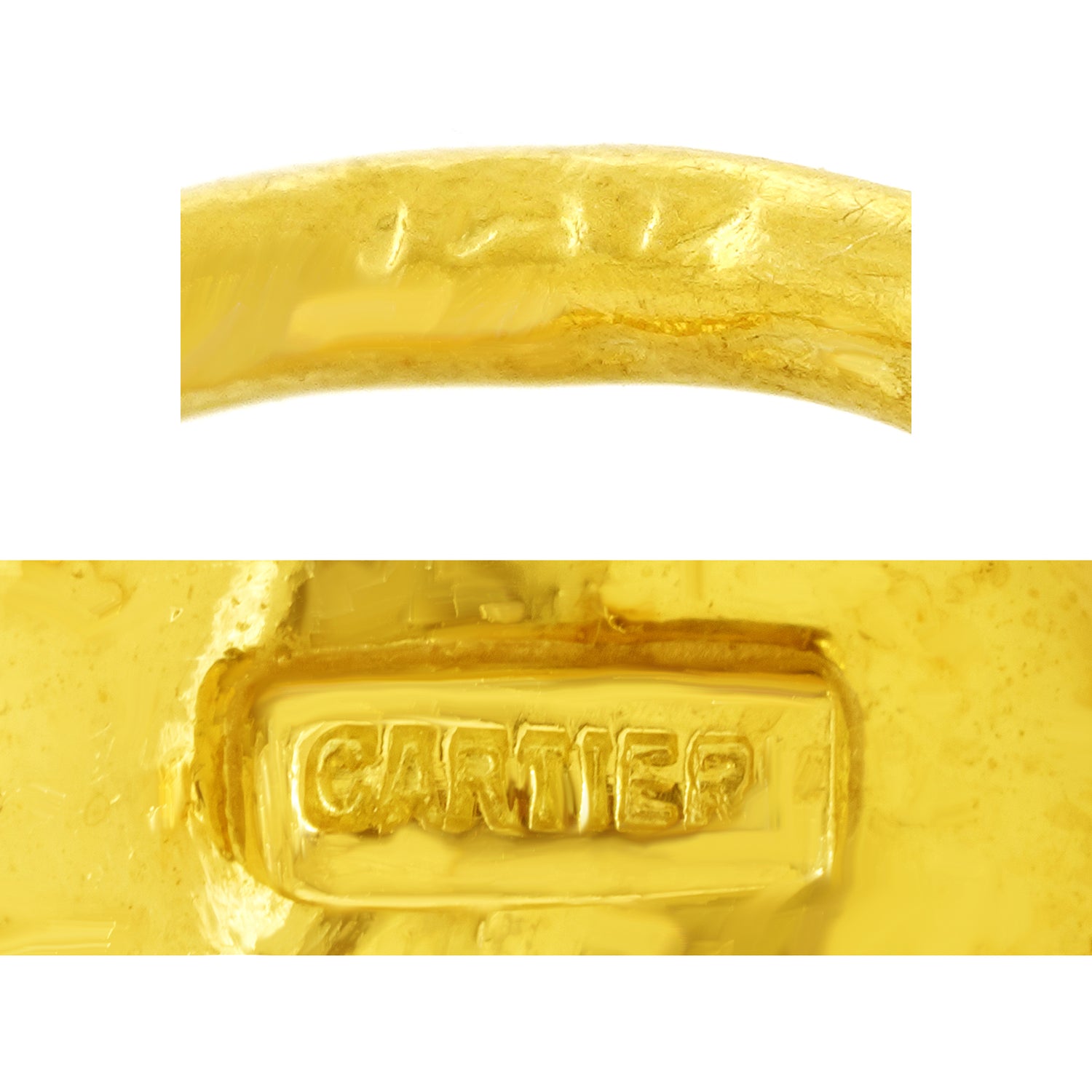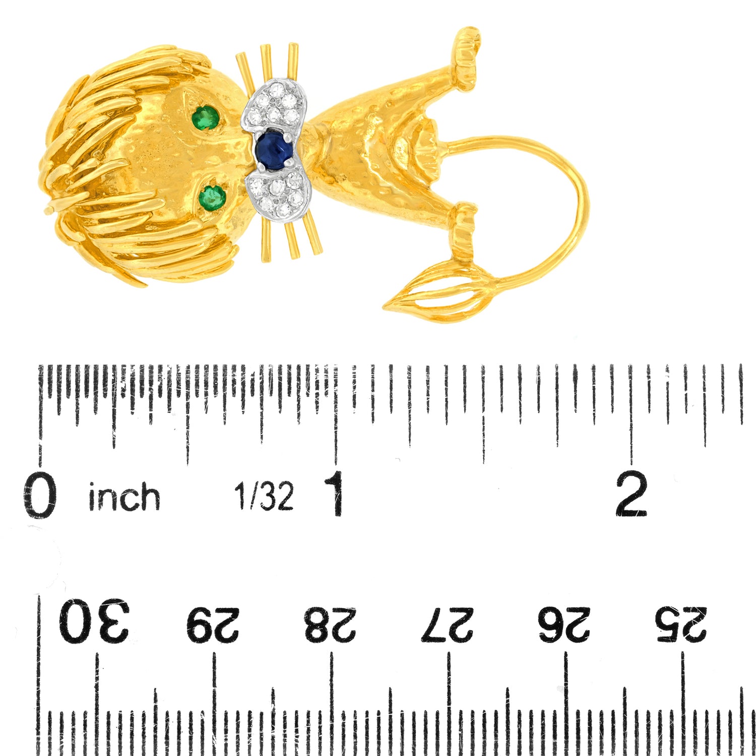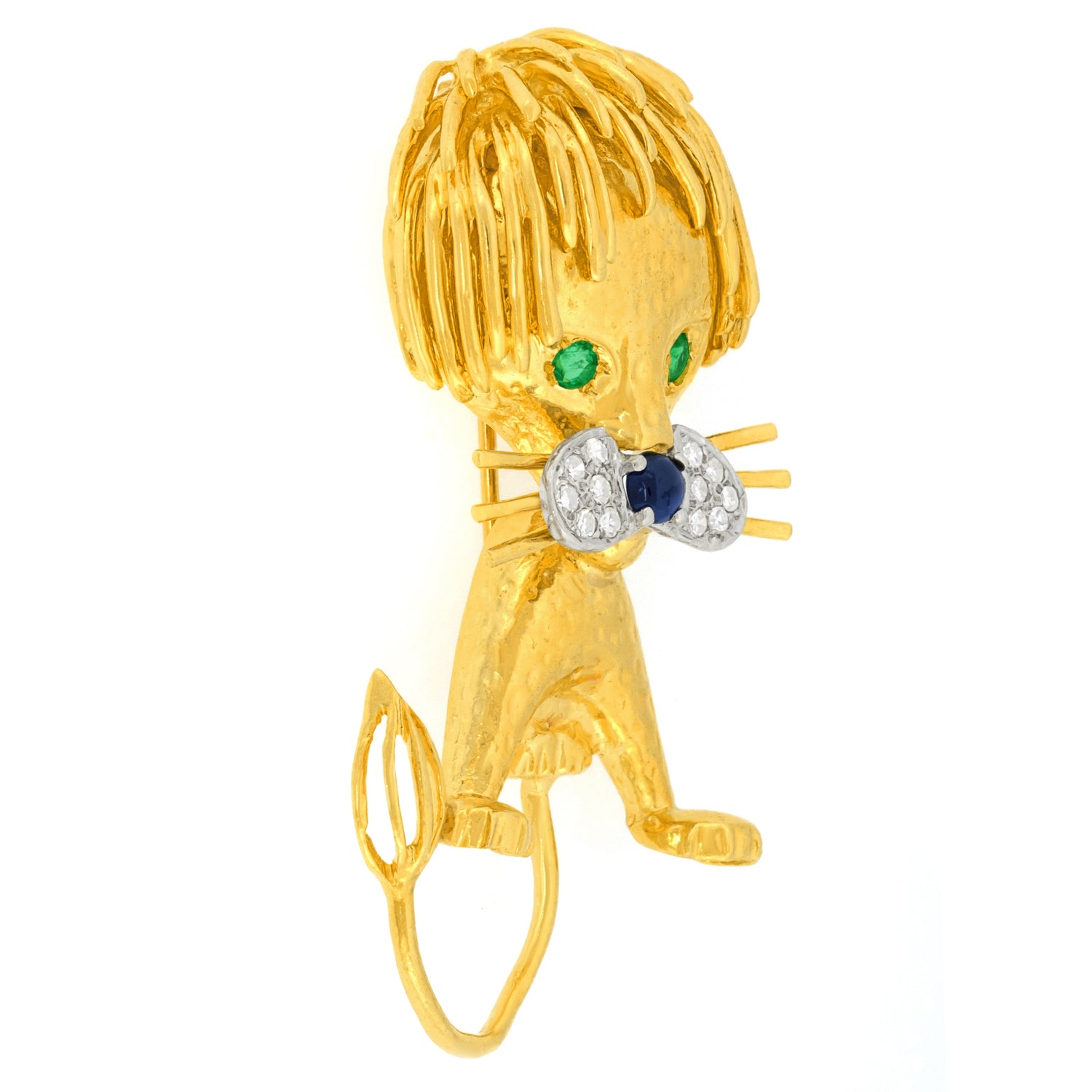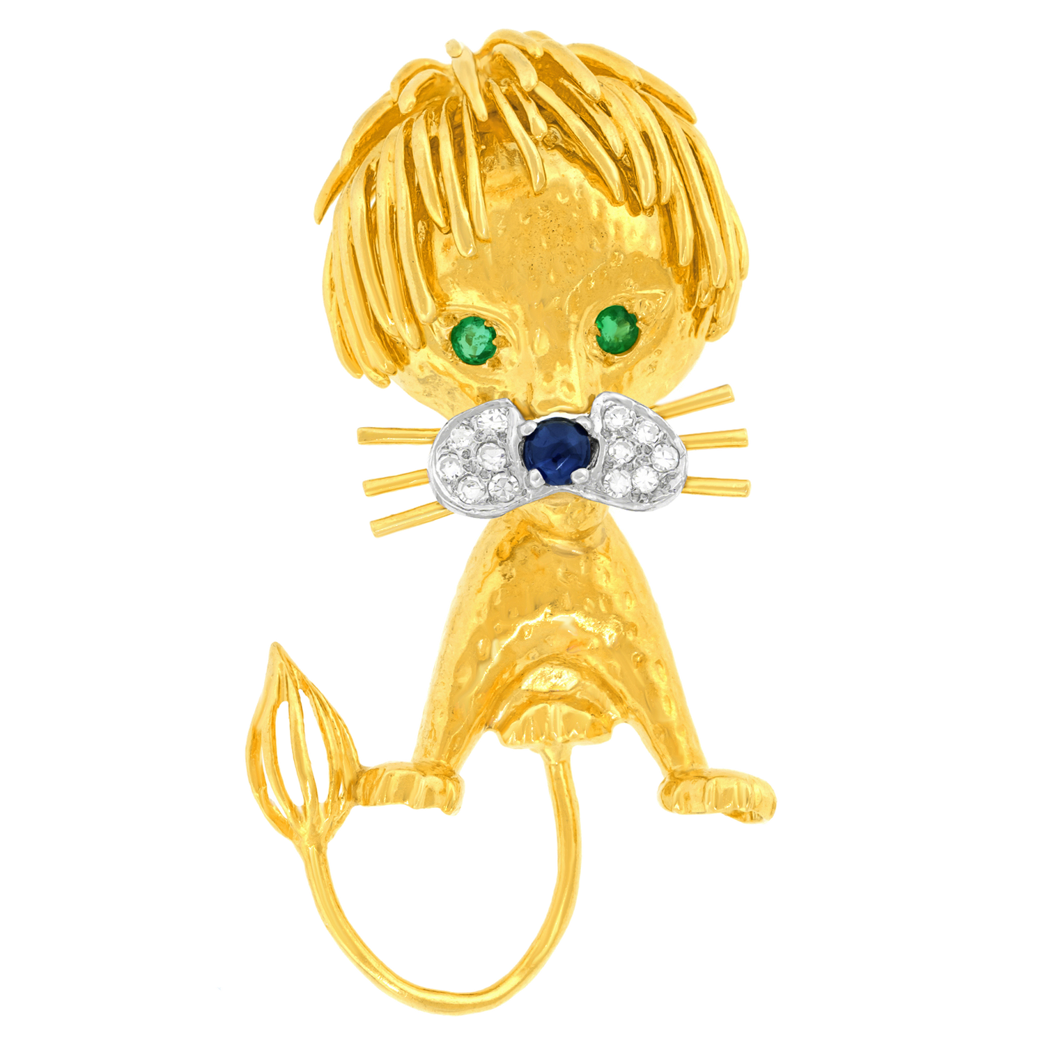 Circa 1960s, 18k, by Cartier. This oh-so-sixties lion brooch by Cartier is the perfect whimsical accessory. Charming animal brooches were all the rage in the fifties, sixties, and seventies. This one has fabulous emerald eyes, a sapphire nose, and fine white diamond cheeks! A superb example, this Cartier jewel is in excellent condition and comes in an original Cartier box.