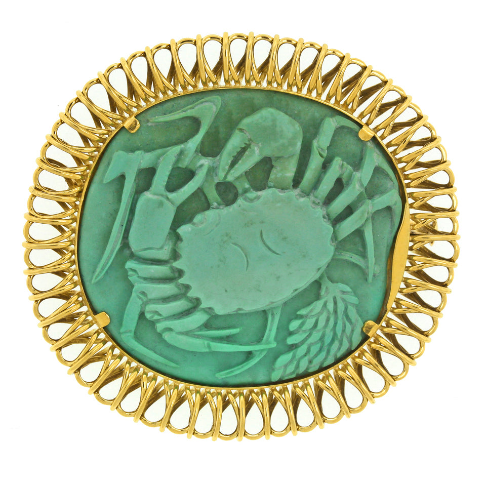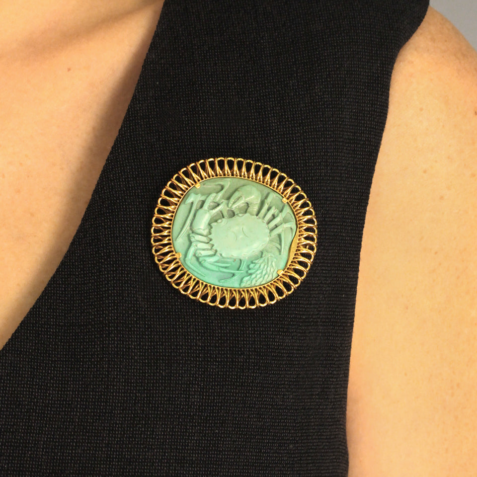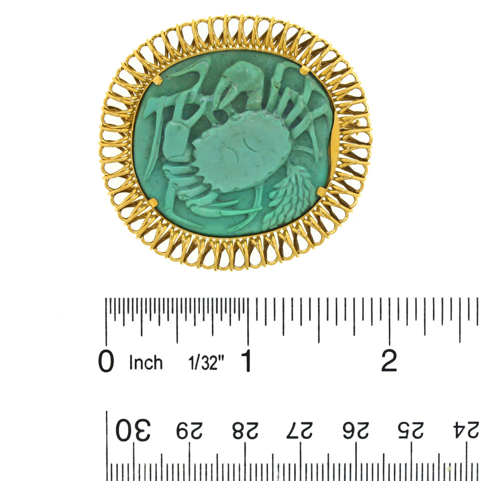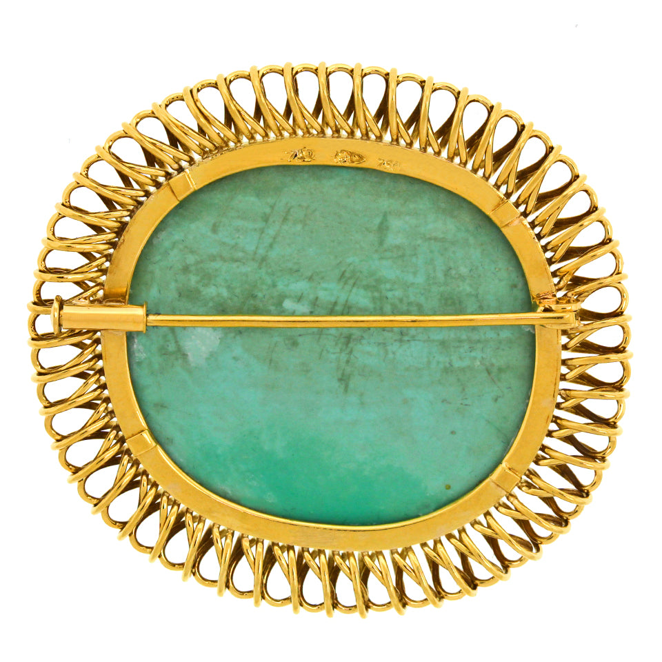 Circa 1930s, 18k, Swiss.  The turquoise carving in this wonderfully cosmopolitan brooch is Japanese from the late Meiji or Taisho periods, (so circa 1880s to 1900). Mounting antique fragments, especially Japanese or Chinese stone carvings in jewelry, was very popular in the Deco period. The silhouette motif of the 18k gold frame is meticulously hand fabricated.